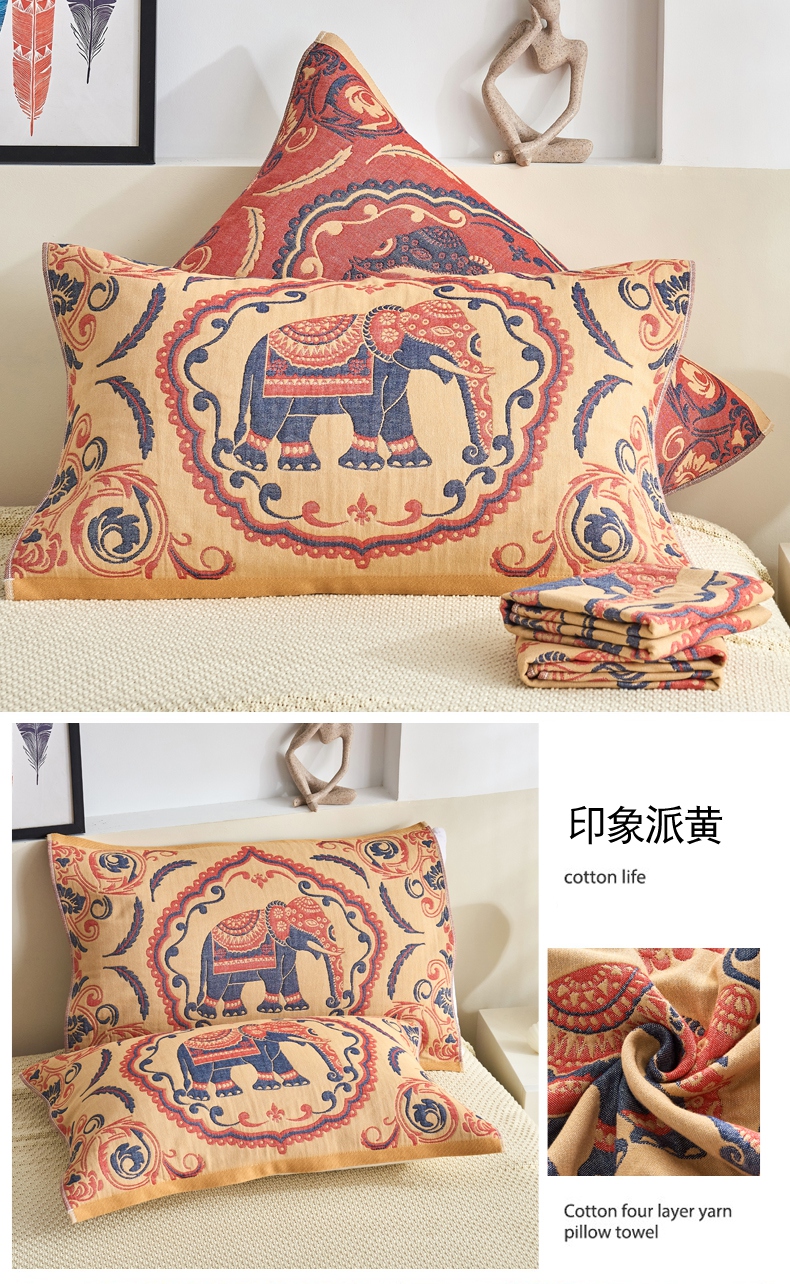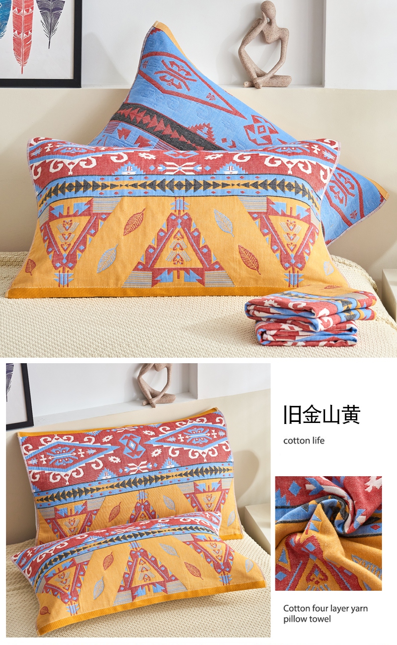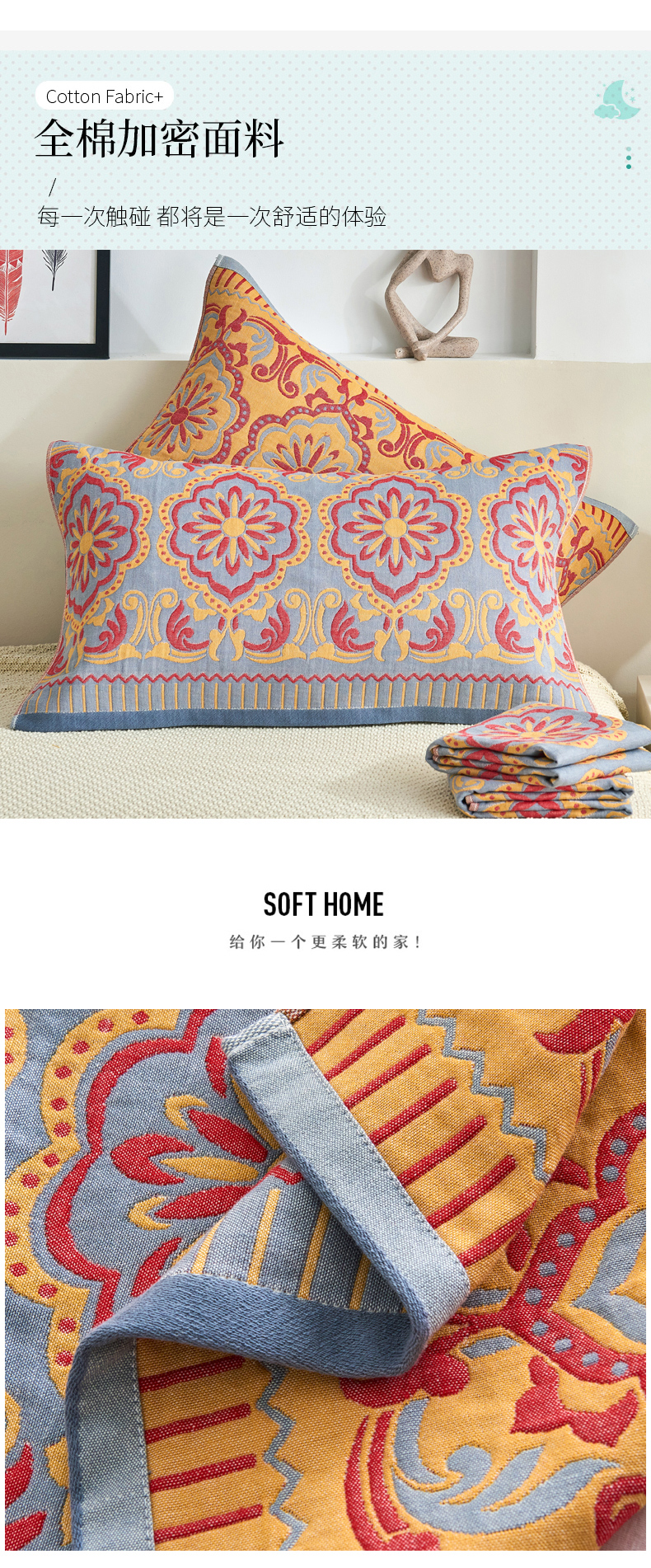 商品名称:朴尔家纺-毛巾被 2026新款民族风彩棉系列四层纱布枕巾 大丽花橘