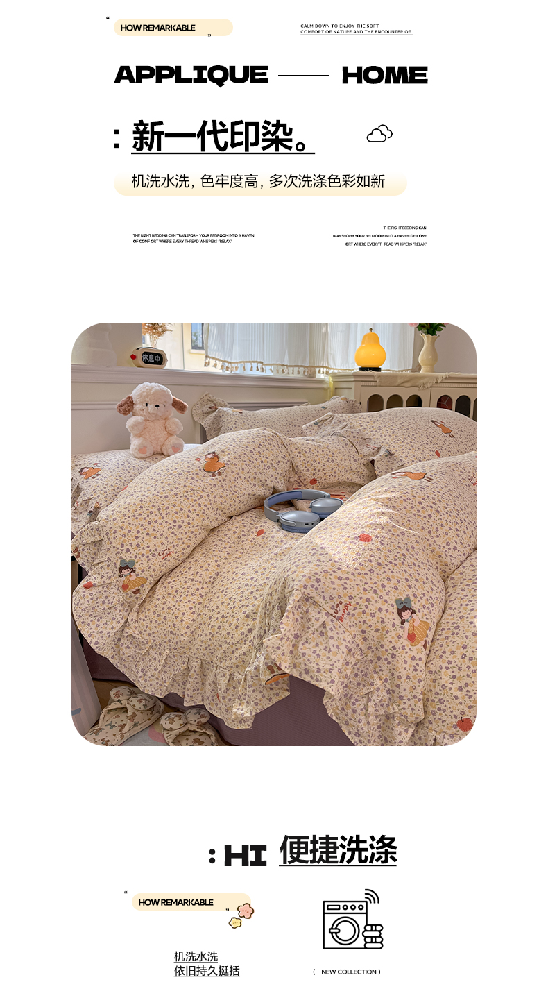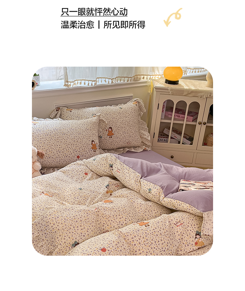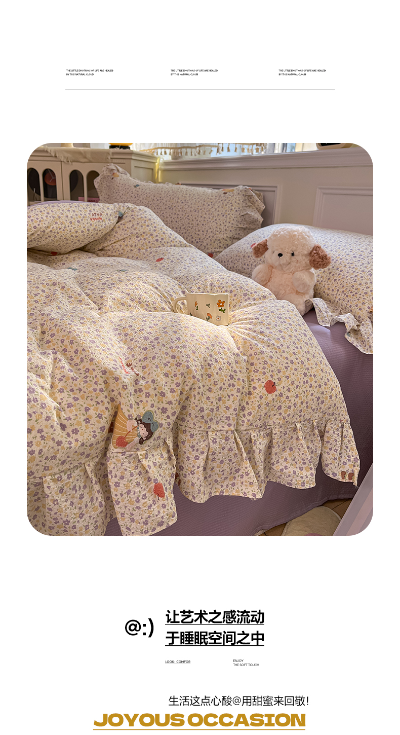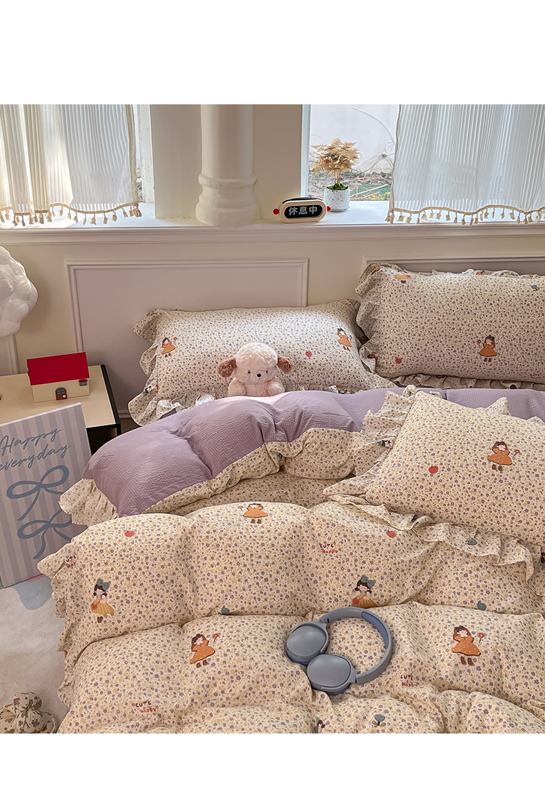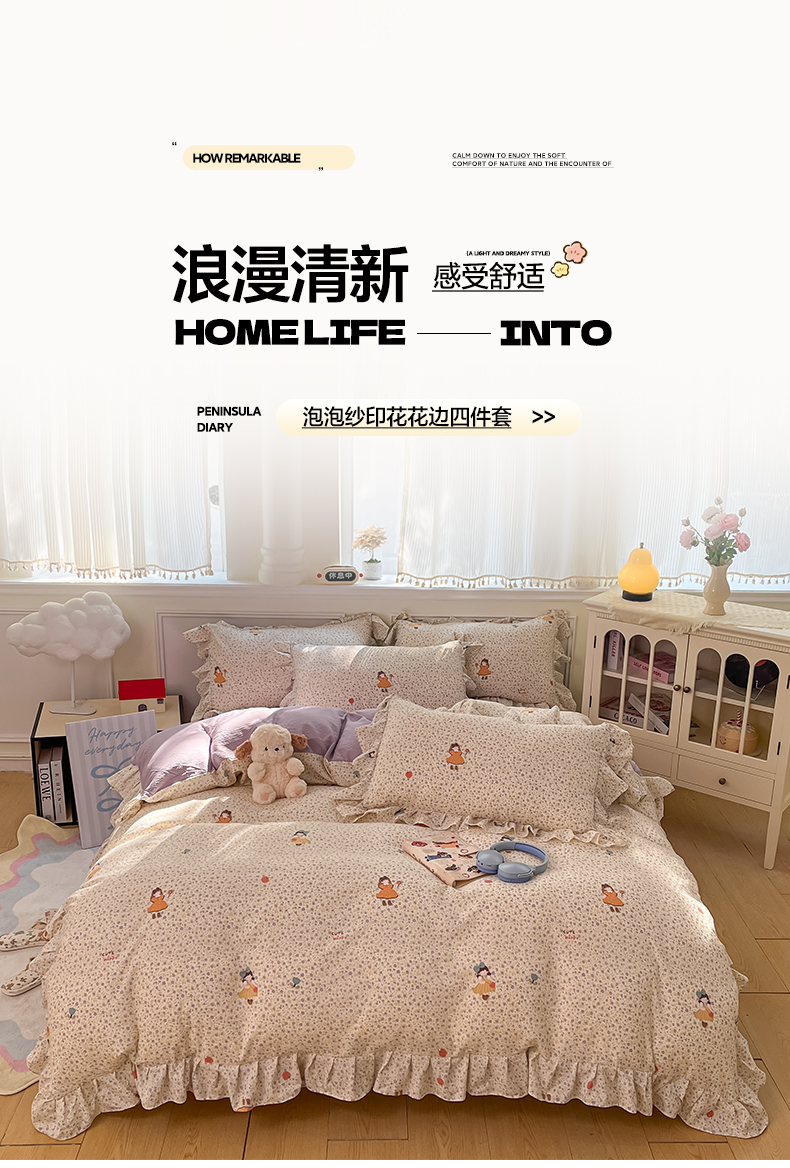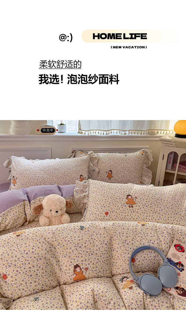 当前位置: 91家纺网 > 商品网购 > 床品套件 > 四件套 > 其它四件套 > 摩妮卡 2026新款泡泡纱韩版印花花边四件套 玫果少女