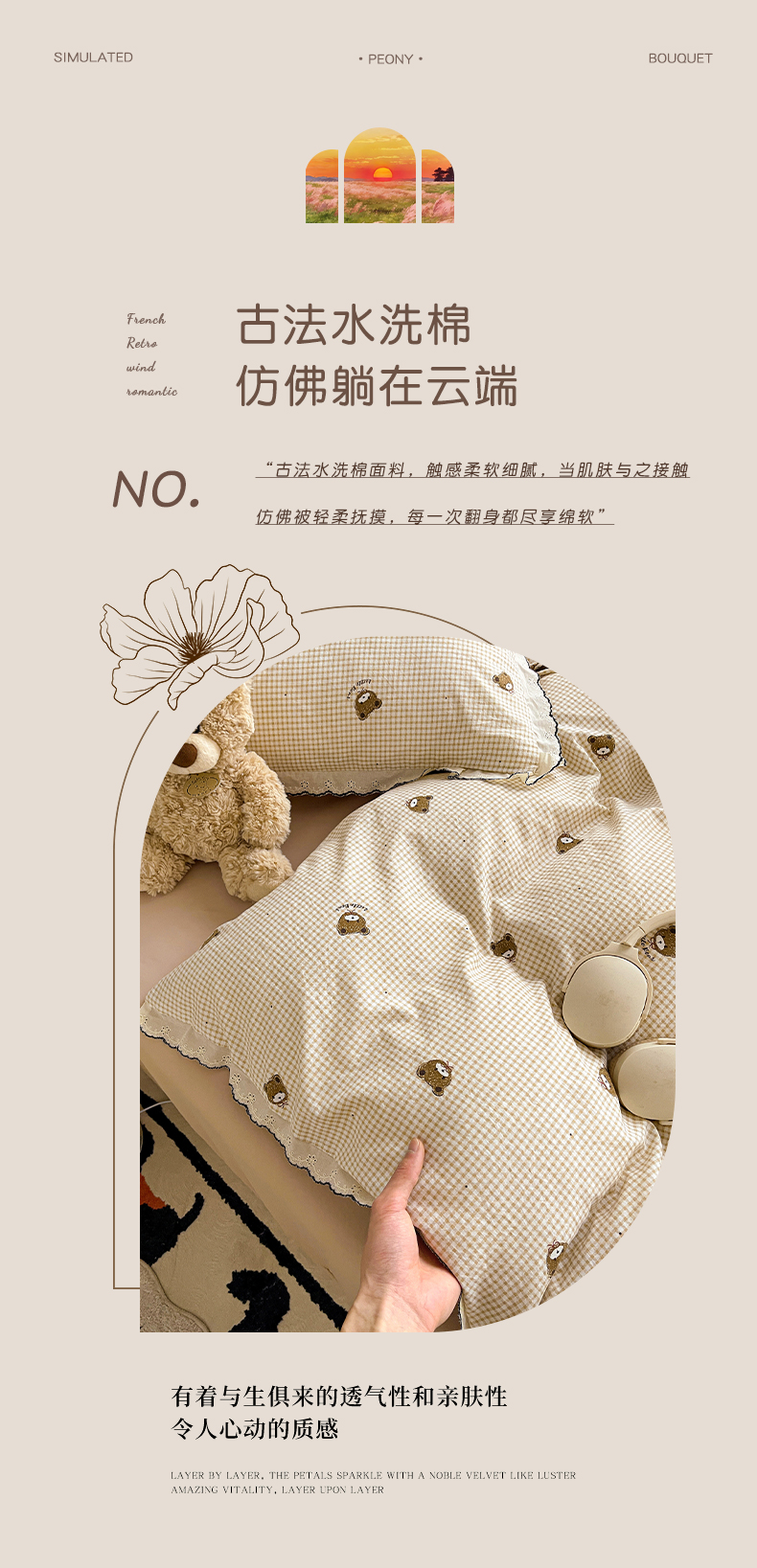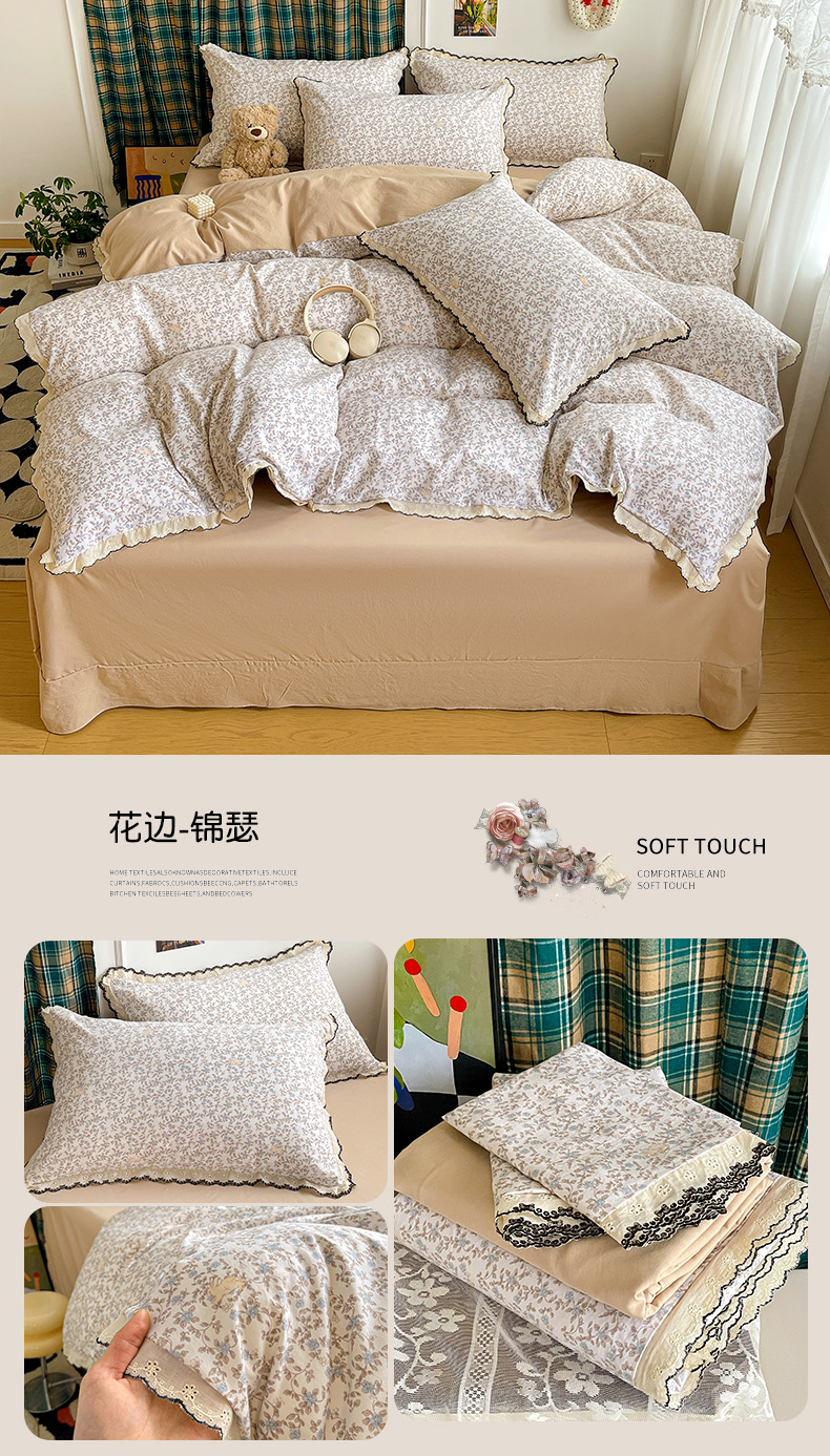 当前位置: 91家纺网 > 商品网购 > 床品套件 > 四件套 > 水洗棉四件套 > 金梦拉家纺 2026春夏新款古法水洗棉花边系列四件套 花边-咖色兔
