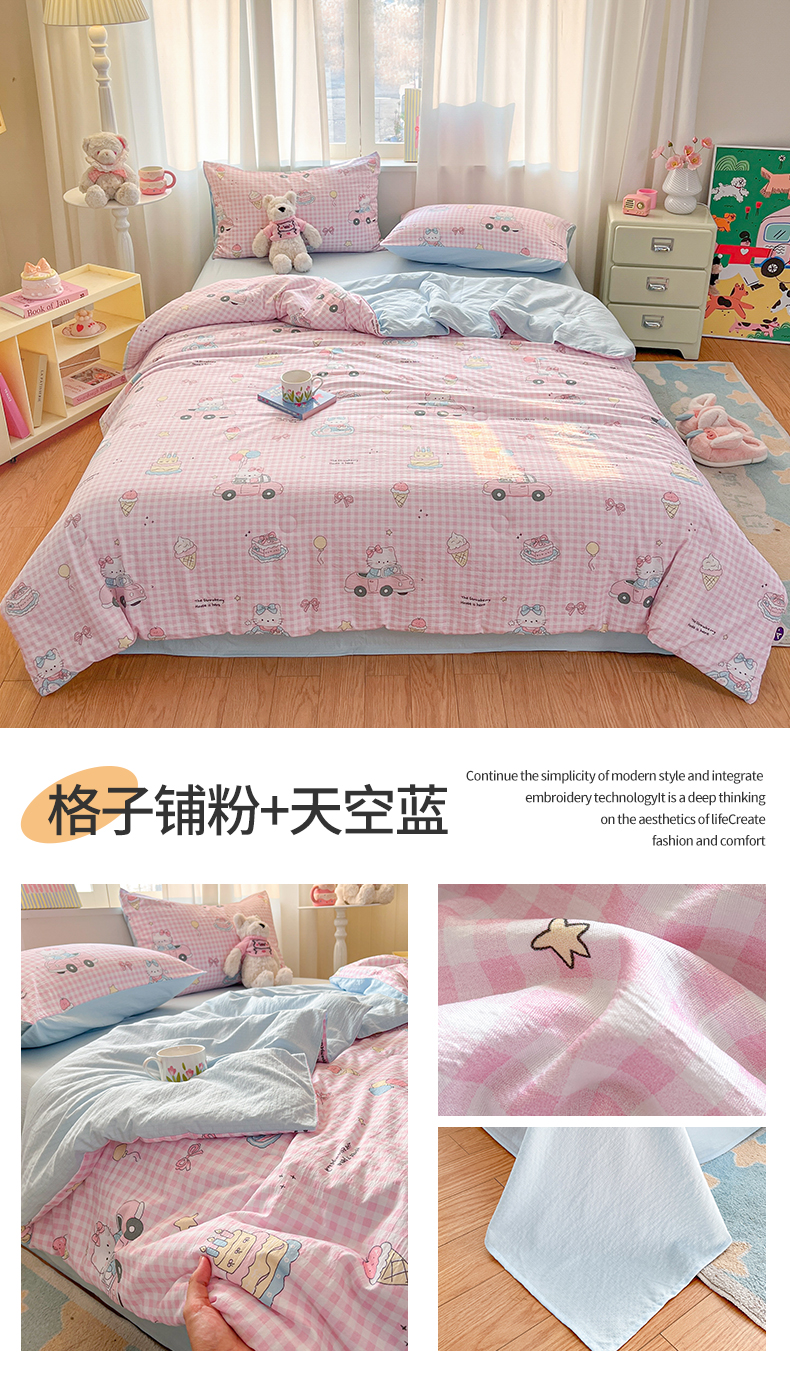 • 91家纺网 家纺一手货源 找家纺 盛秋家纺 2026新款皱皱纱印花夏被-萝拉 格子铺粉+天空蓝