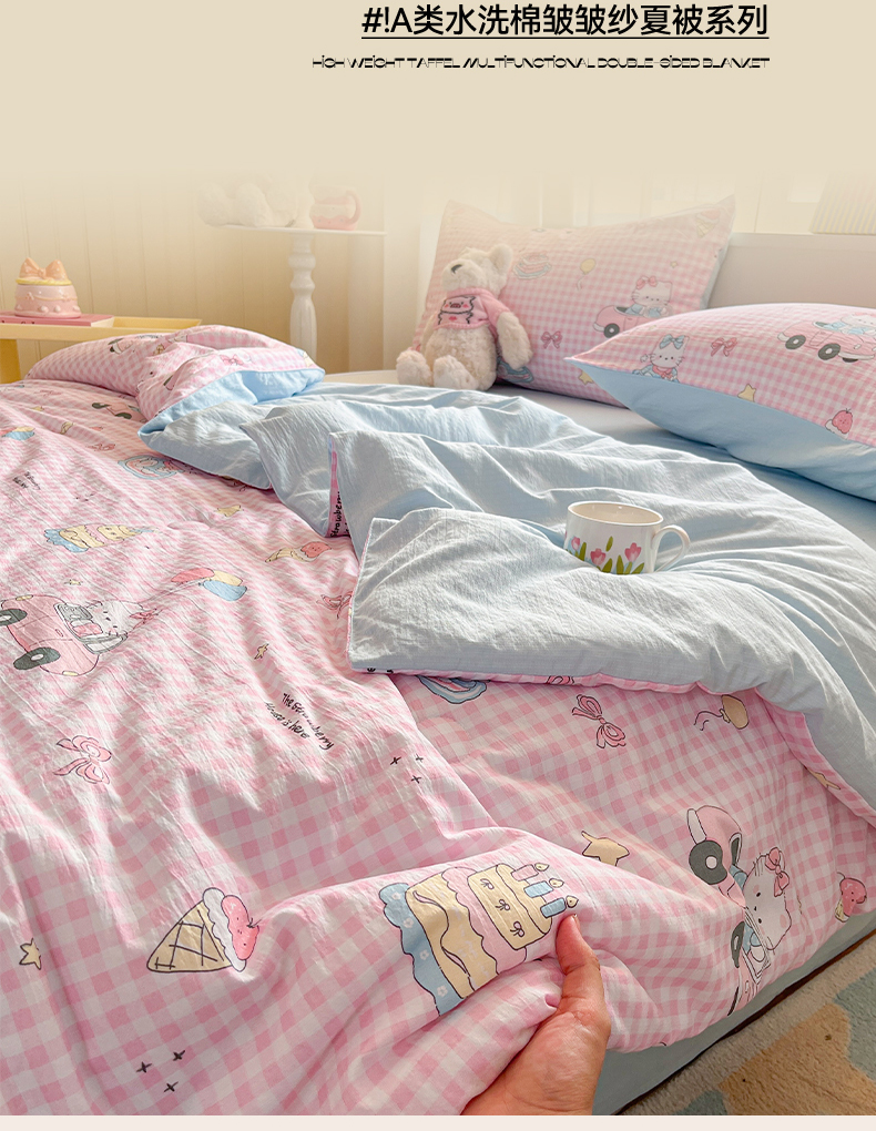 (总)盛秋家纺 2026新款皱皱纱印花夏被-萝拉,生日派对+清新绿,格子花园+奶油粉,格子铺粉+天空蓝,花丛小熊+奶油粉,可可颂蓝+天空蓝,恐龙游记+天空蓝,快乐时光+深咖,麻薯团+米驼,派对狗+深咖,森林小象+奶油粉,小狗来信+奶油粉,小伙伴+米驼,小熊小花+麦绿,修勾咖+米驼