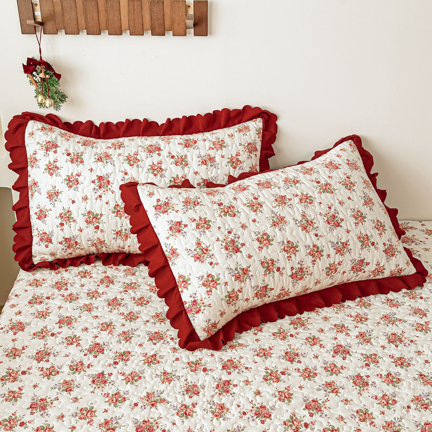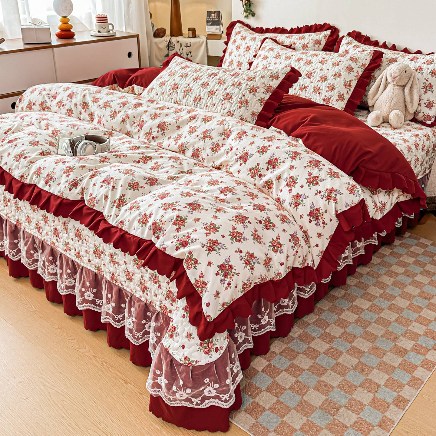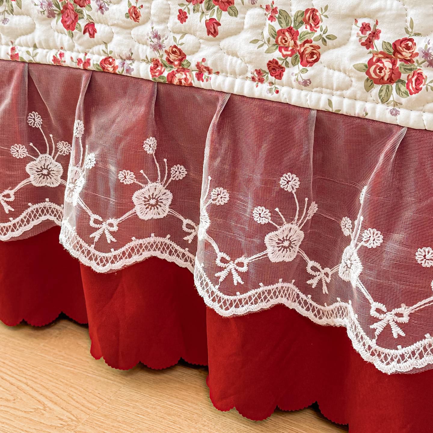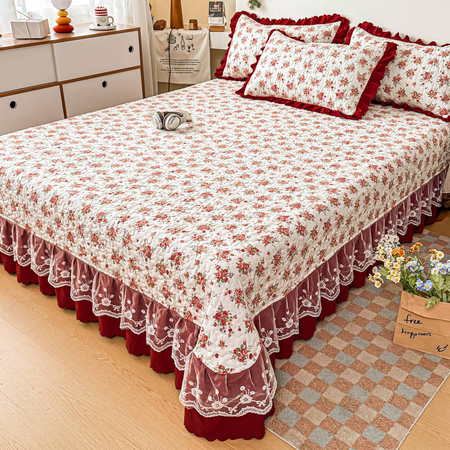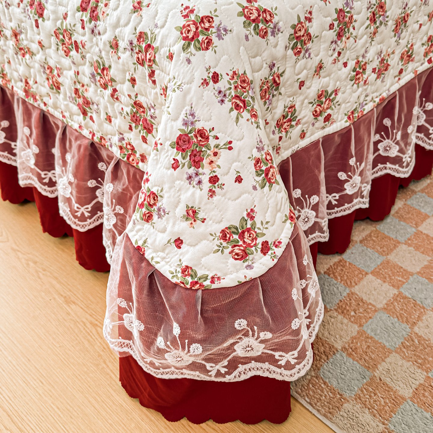 雅眠居 2026新款直播爆款古法仿棉双层蕾丝花边床盖四件套 胭花集