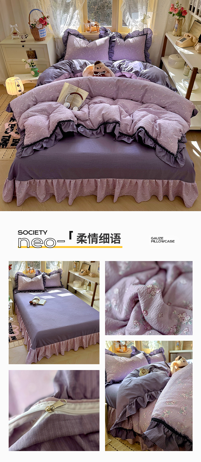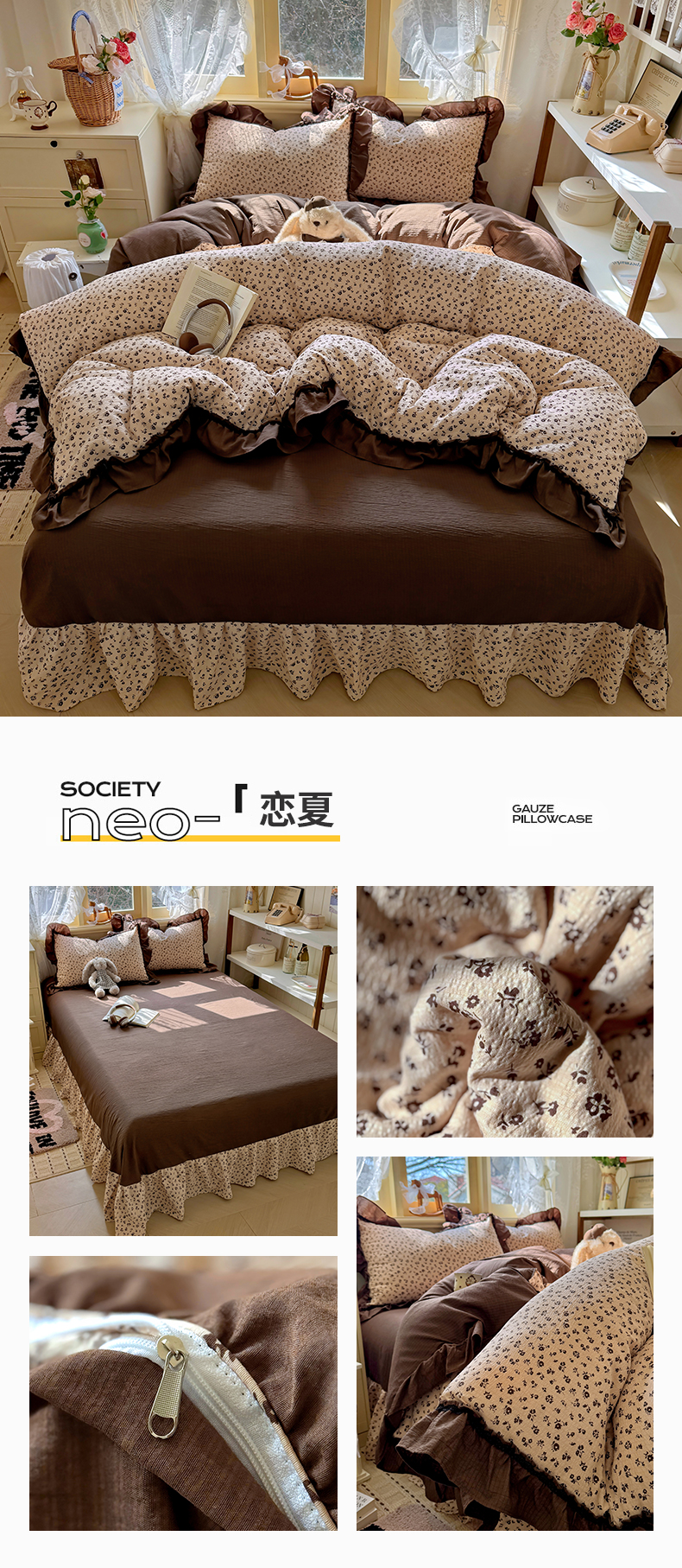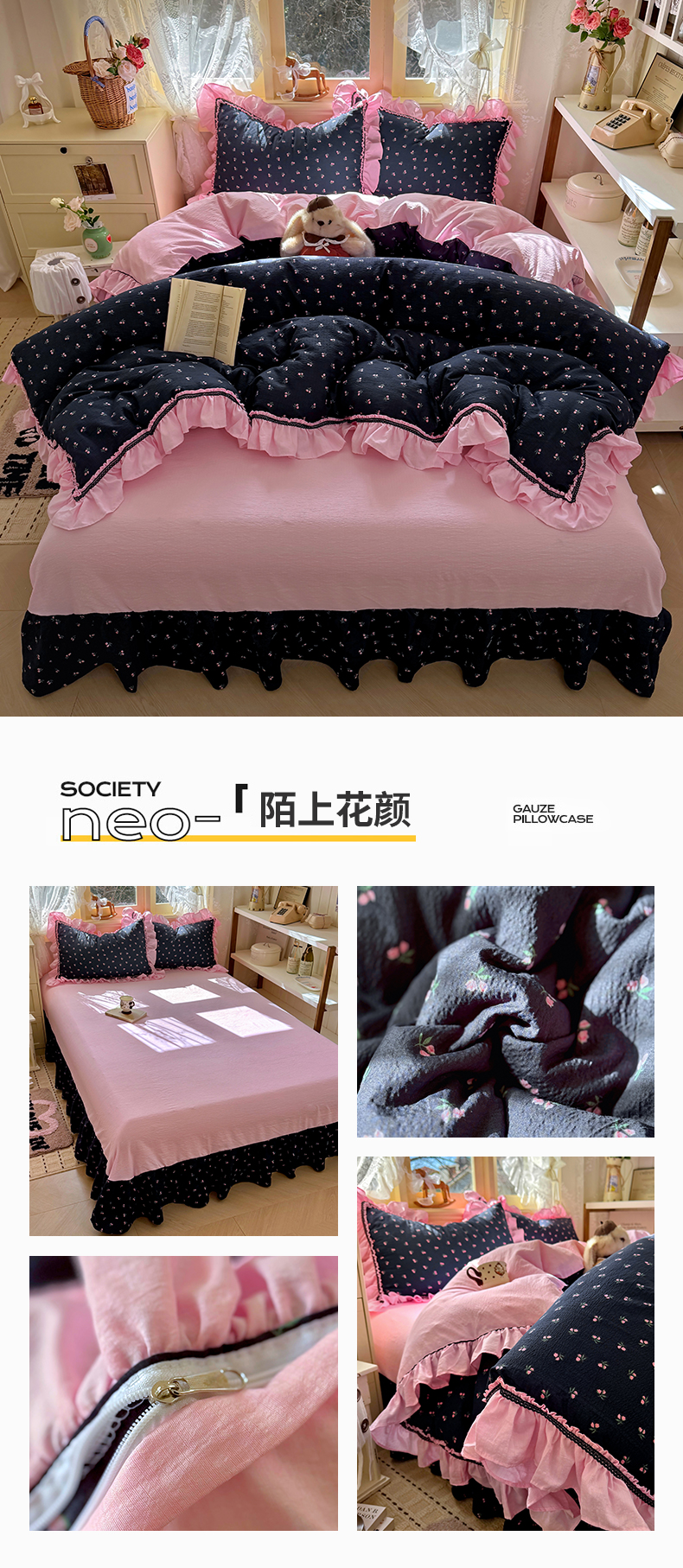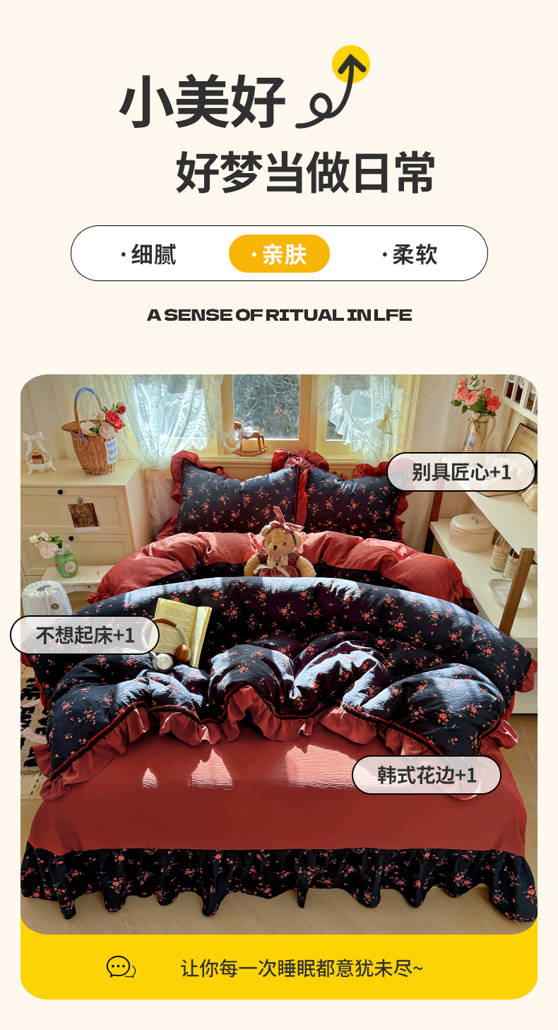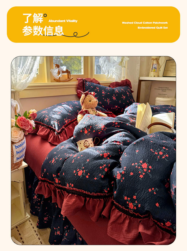 商品名称:芭比蔓家纺 2026春夏新款皱皱纱印花四件套 甜蜜蜜