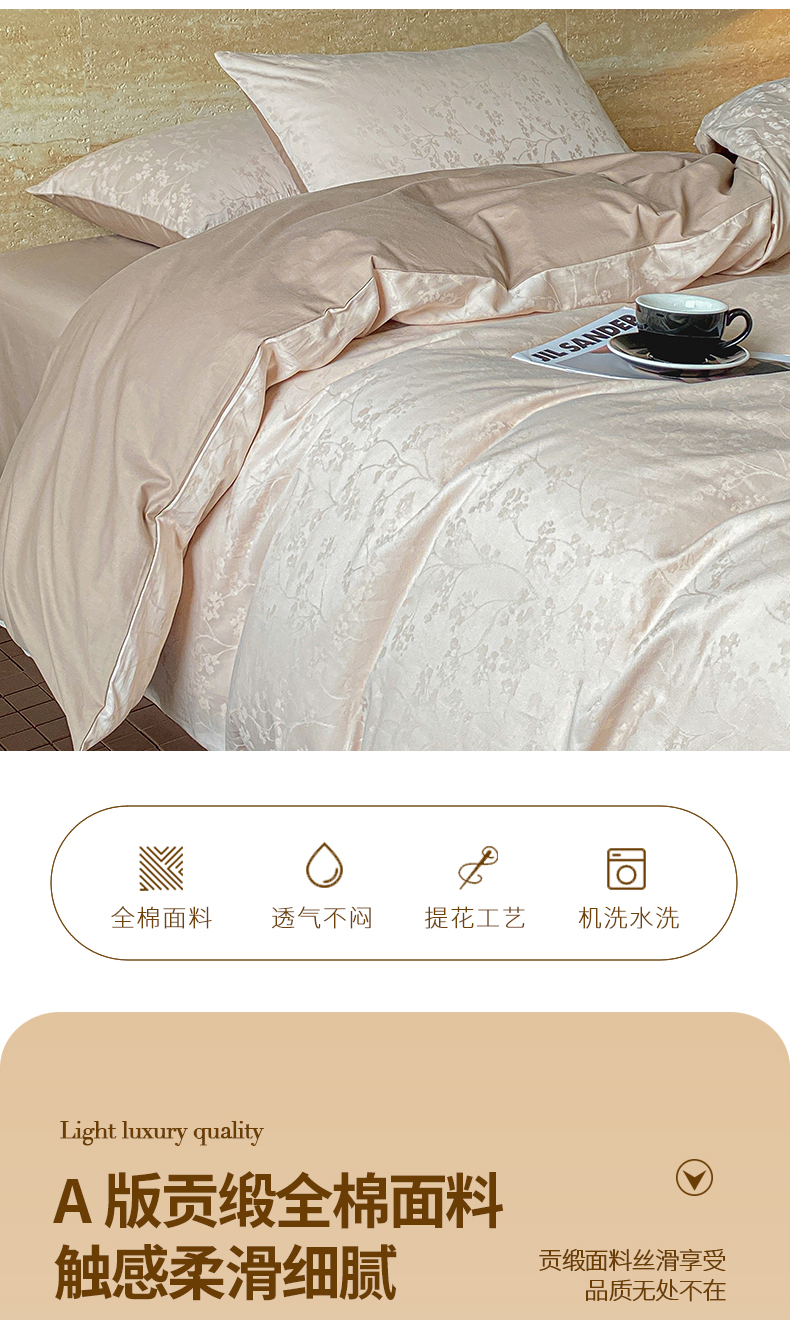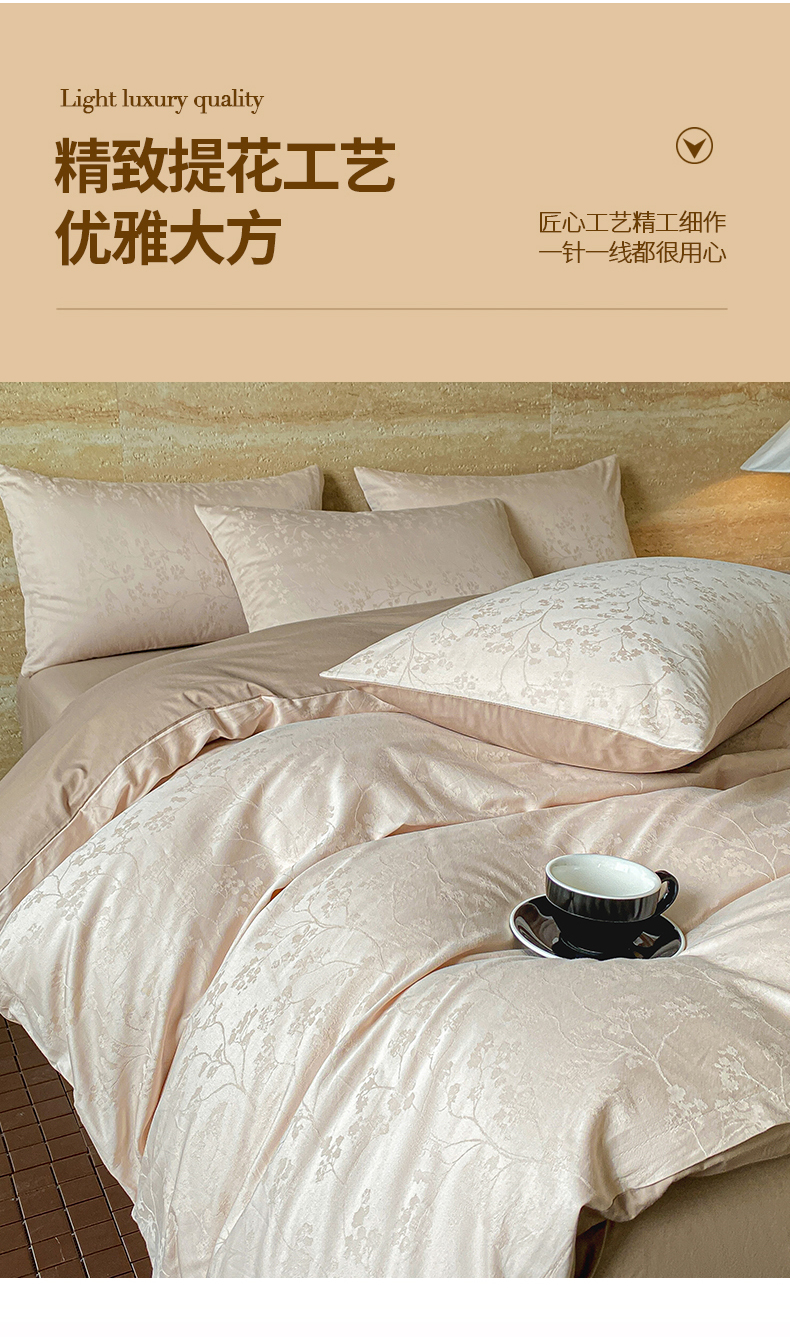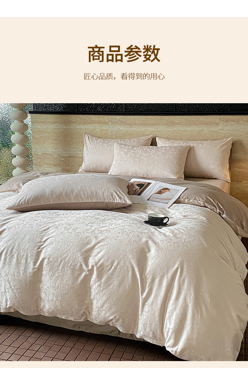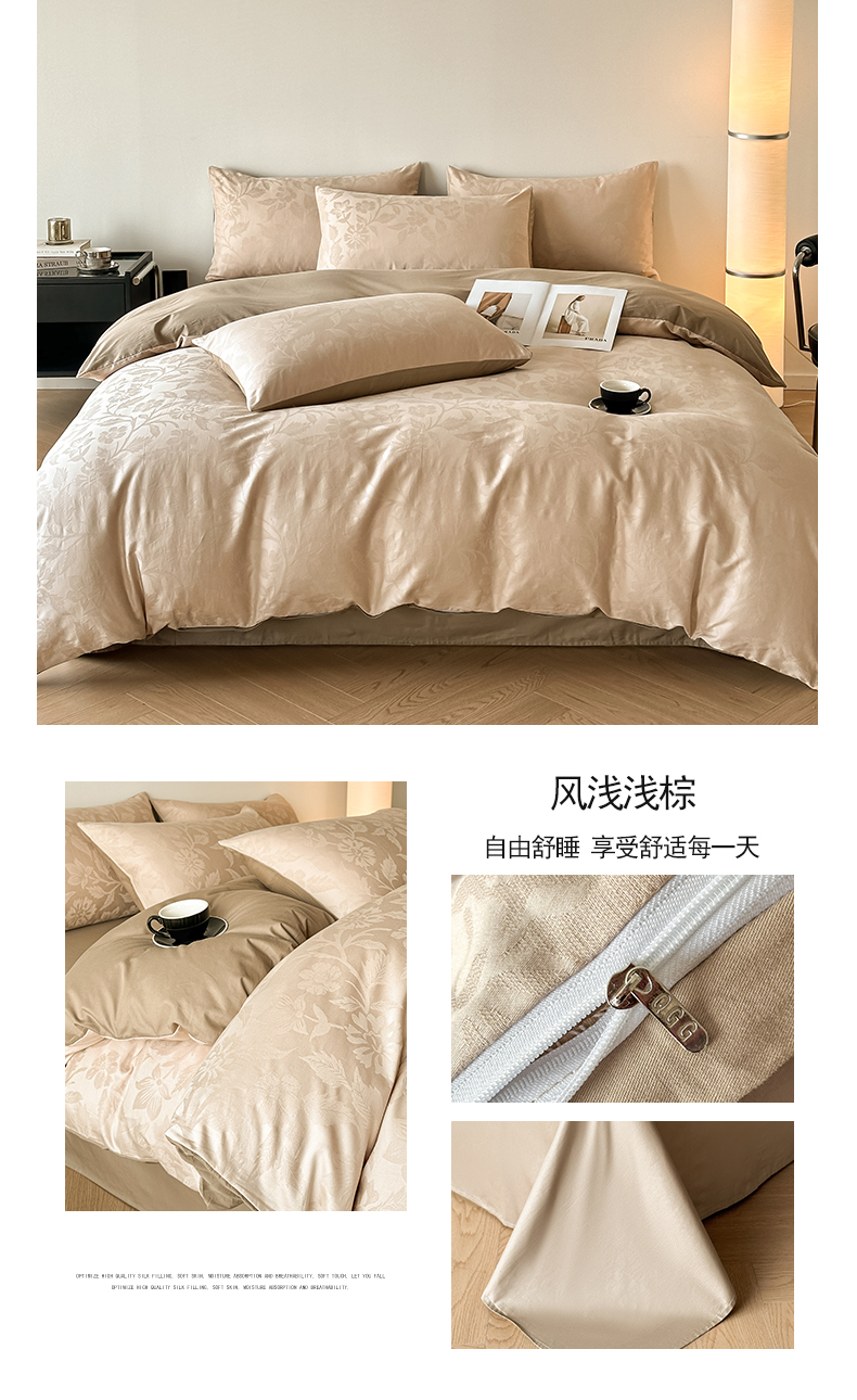 当前位置: 91家纺网 > 商品网购 > 床品套件 > 四件套 > 全棉普通四件套 > 琪格格纺织 2026新款纯棉全棉60s贡缎轻奢大提花四件套 纯棉贡缎 清影浅咖