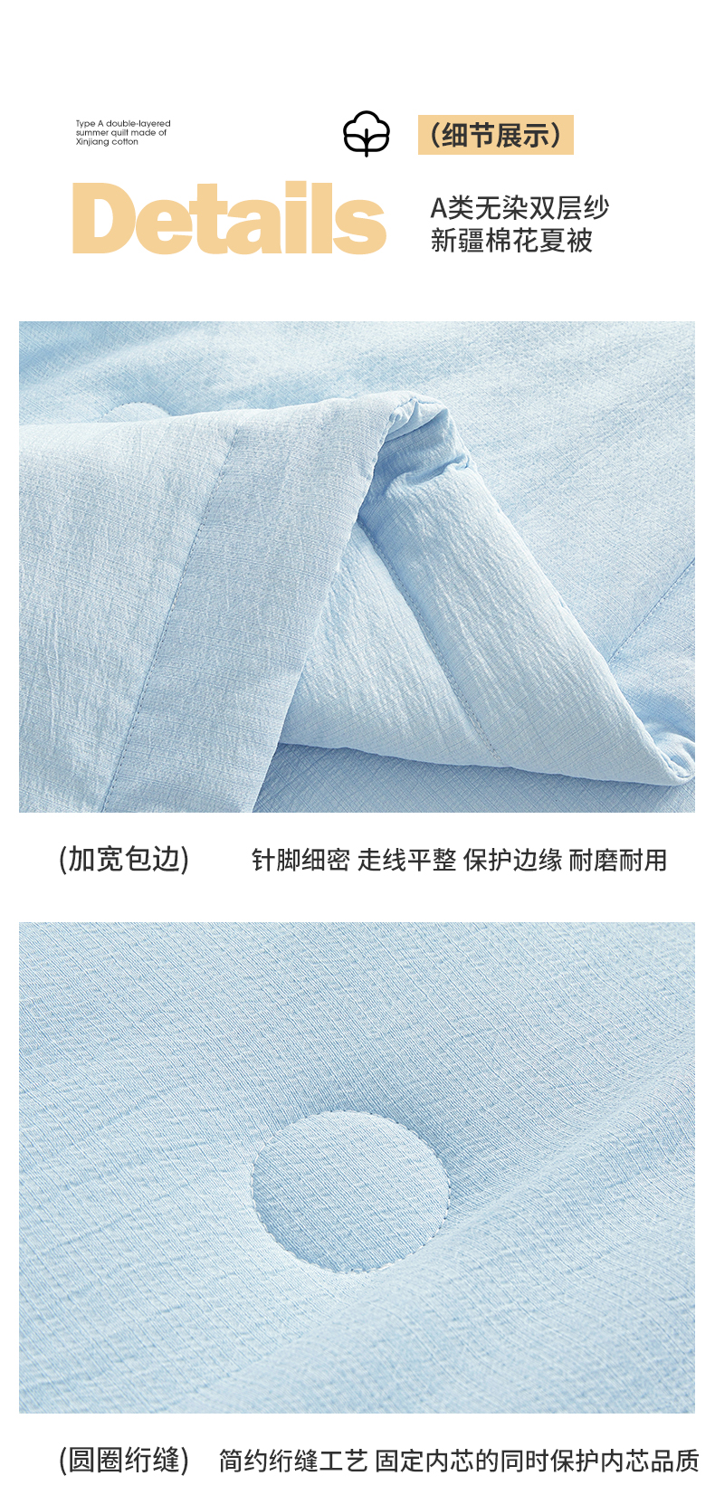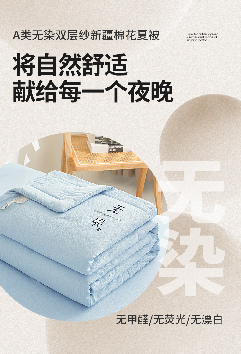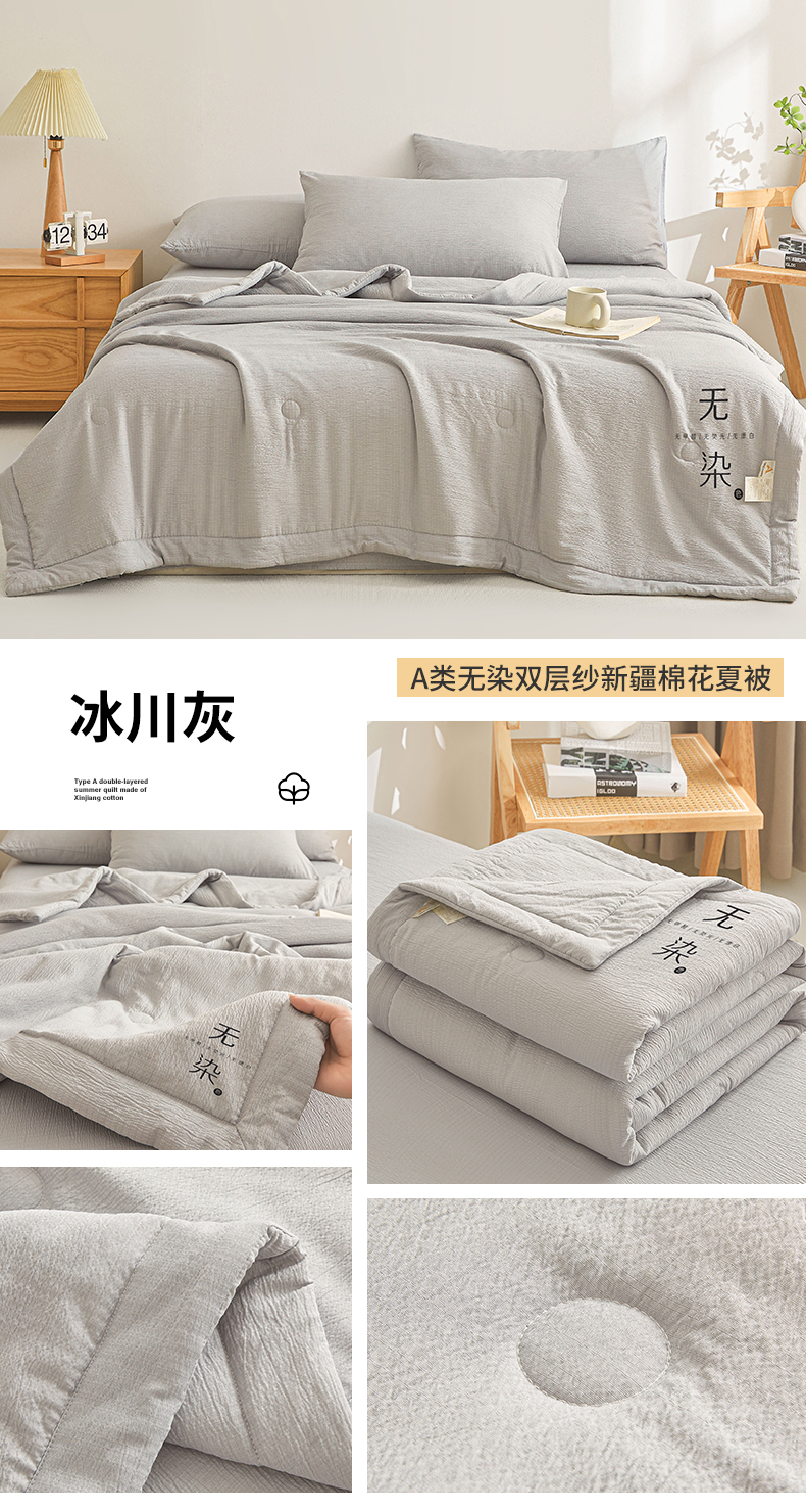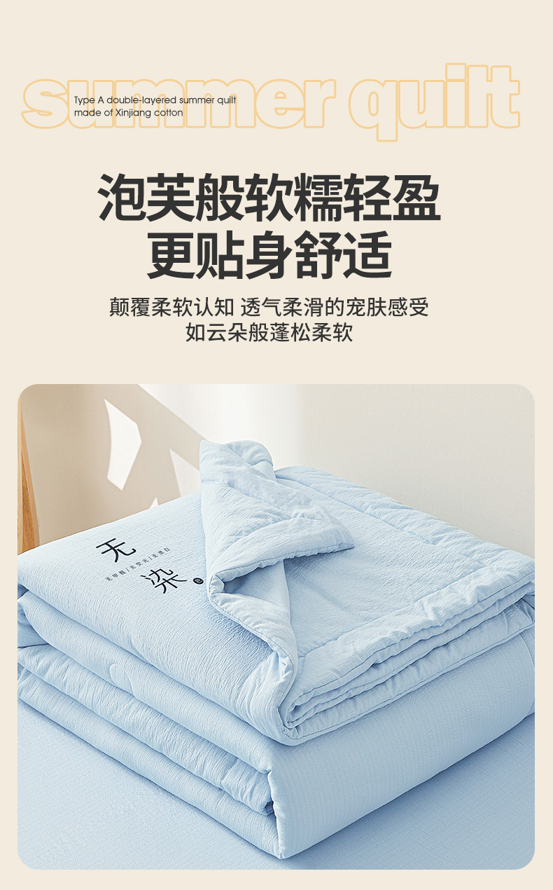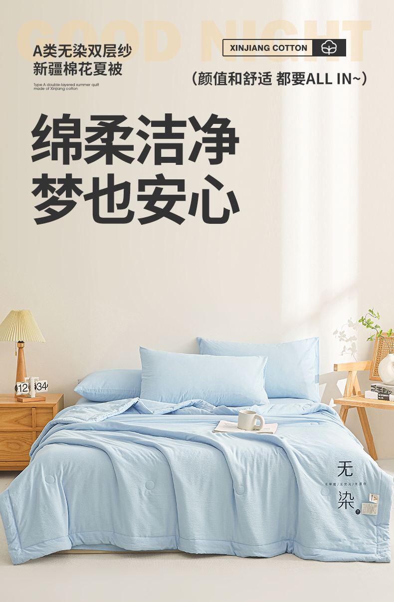 • 91家纺网 家纺一手货源 找家纺 晓时候 2026A类云感双层纱夏被四件套新疆棉花被无染夏凉被空调被 青春蓝