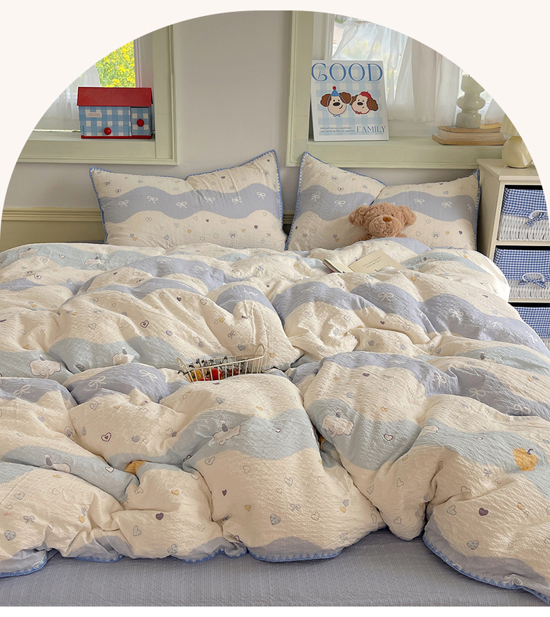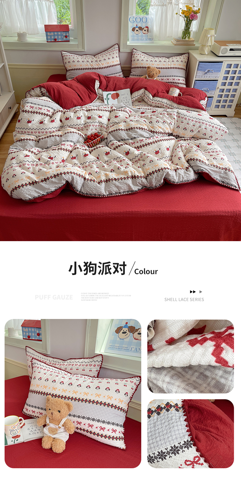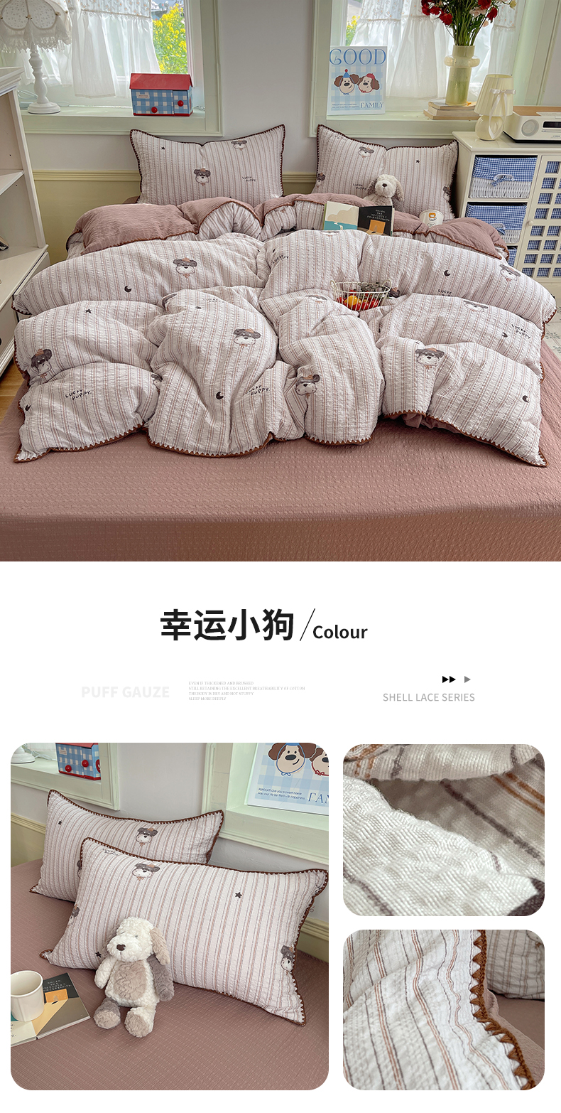 当前位置: 91家纺网 > 商品网购 > 床品套件 > 四件套 > 其它四件套 > 凯洛奇 2026春夏新款A类高品质泡芙纱贝壳边四件套 奶芙小狗