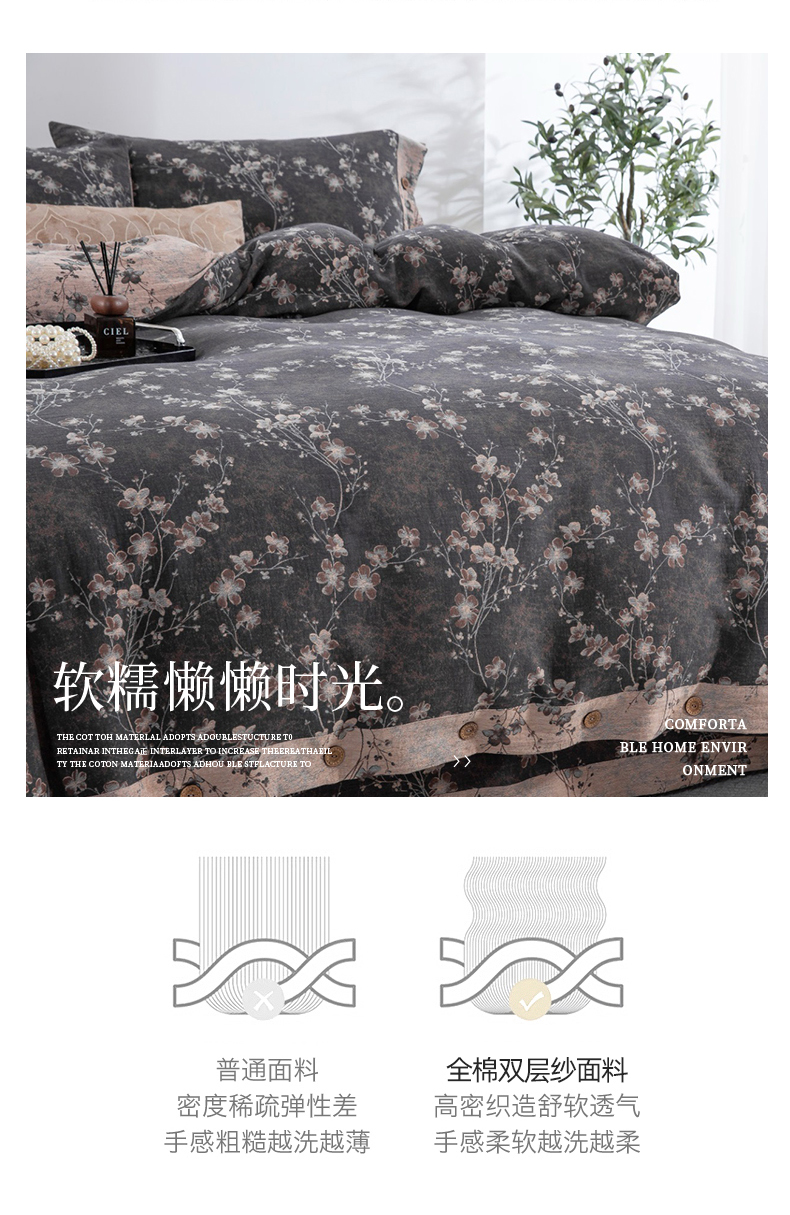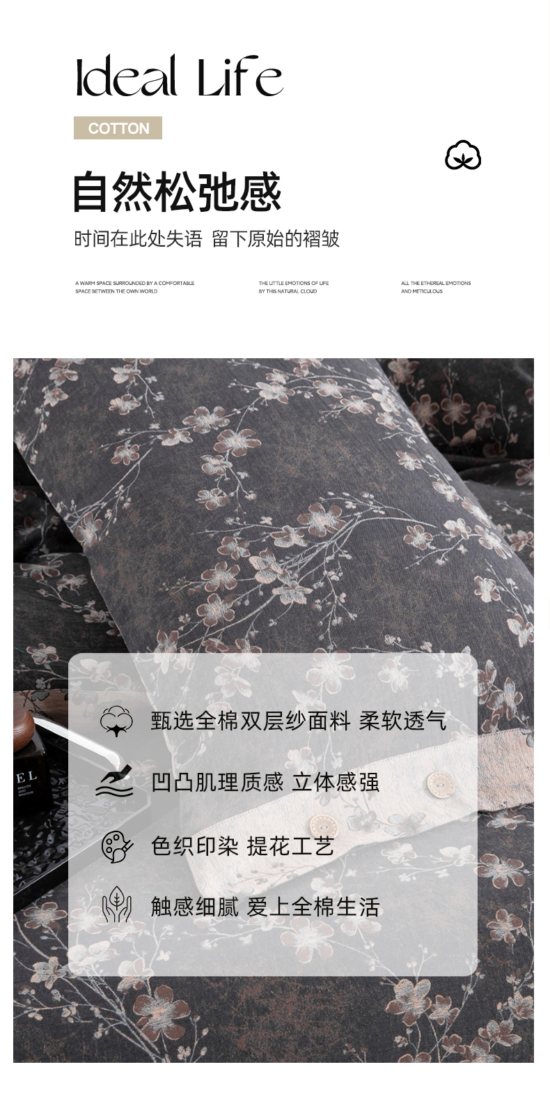 商品名称:云天家纺 2026新款A类全棉纯棉色织提花双层纱纽扣款四件套 枫林露