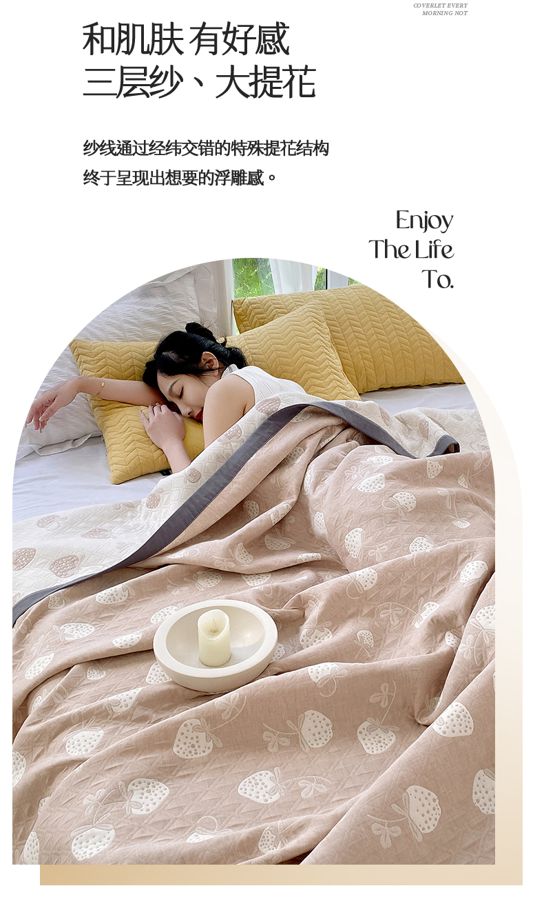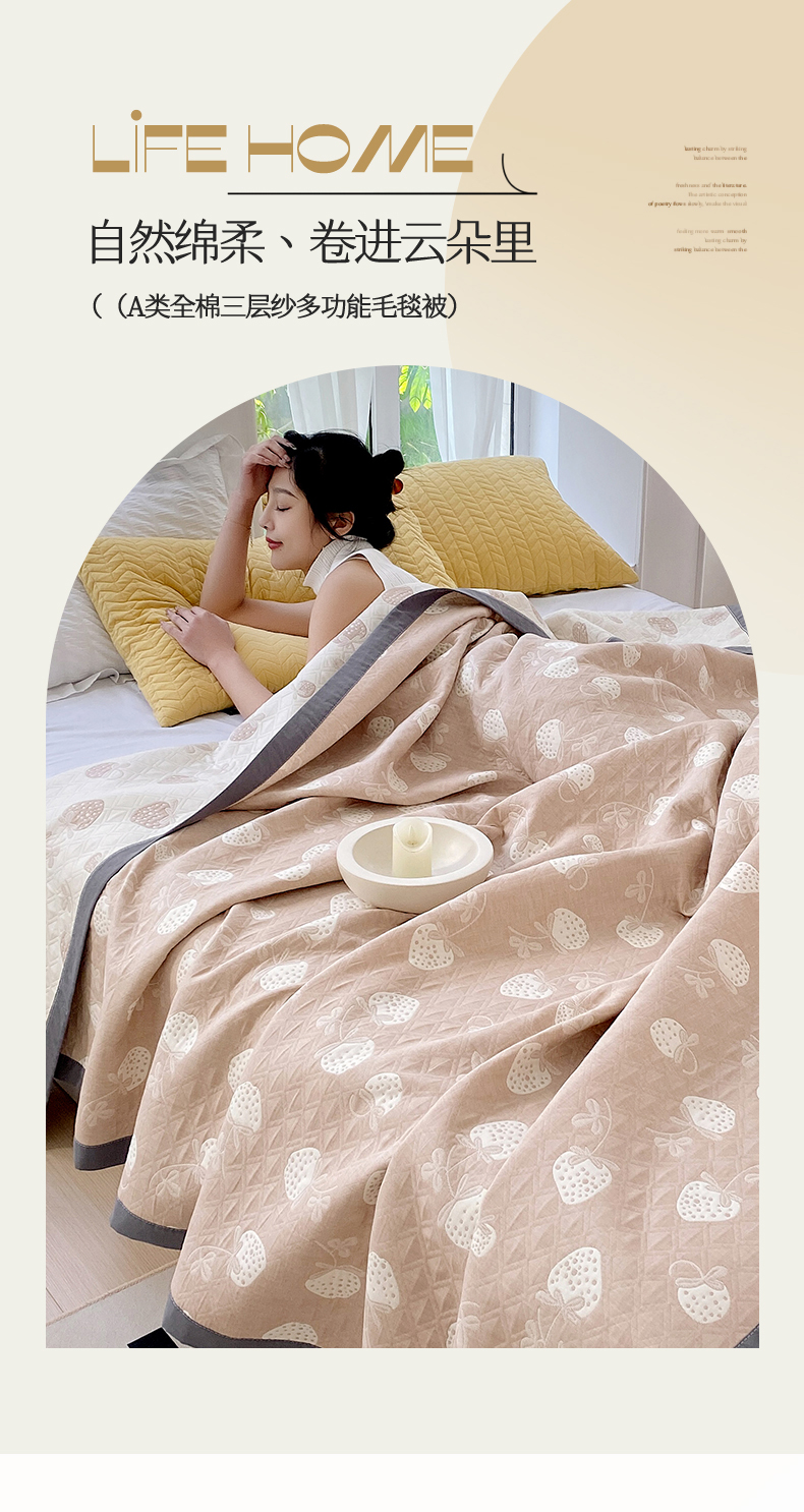 商品名称:云天家纺 2026新款A类全棉三层纱多功能毛巾被(盖毯床单夏被) 甜心草莓-咖