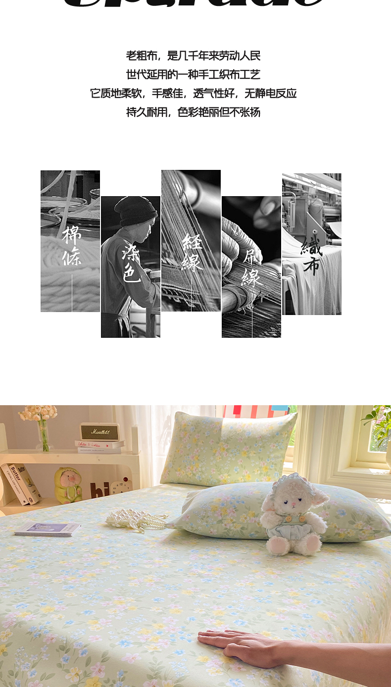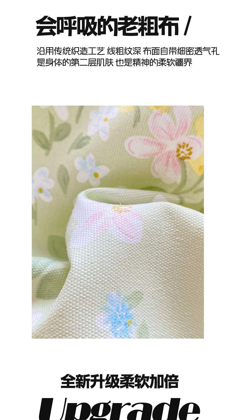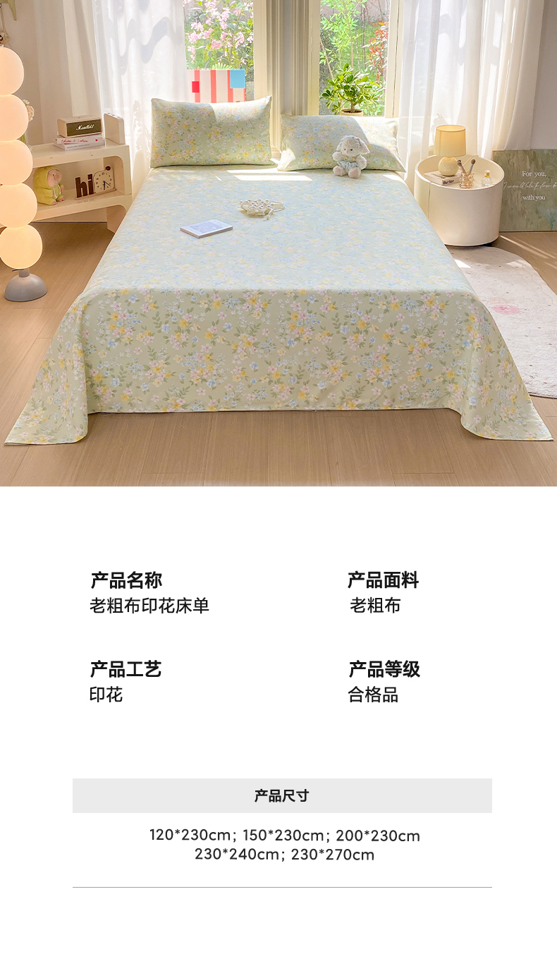 • 91家纺网 家纺一手货源 找家纺 晓时候 20226新款细纱原棉老粗布床单印花床单单件凉席三件套 徐徐花开