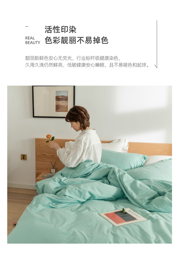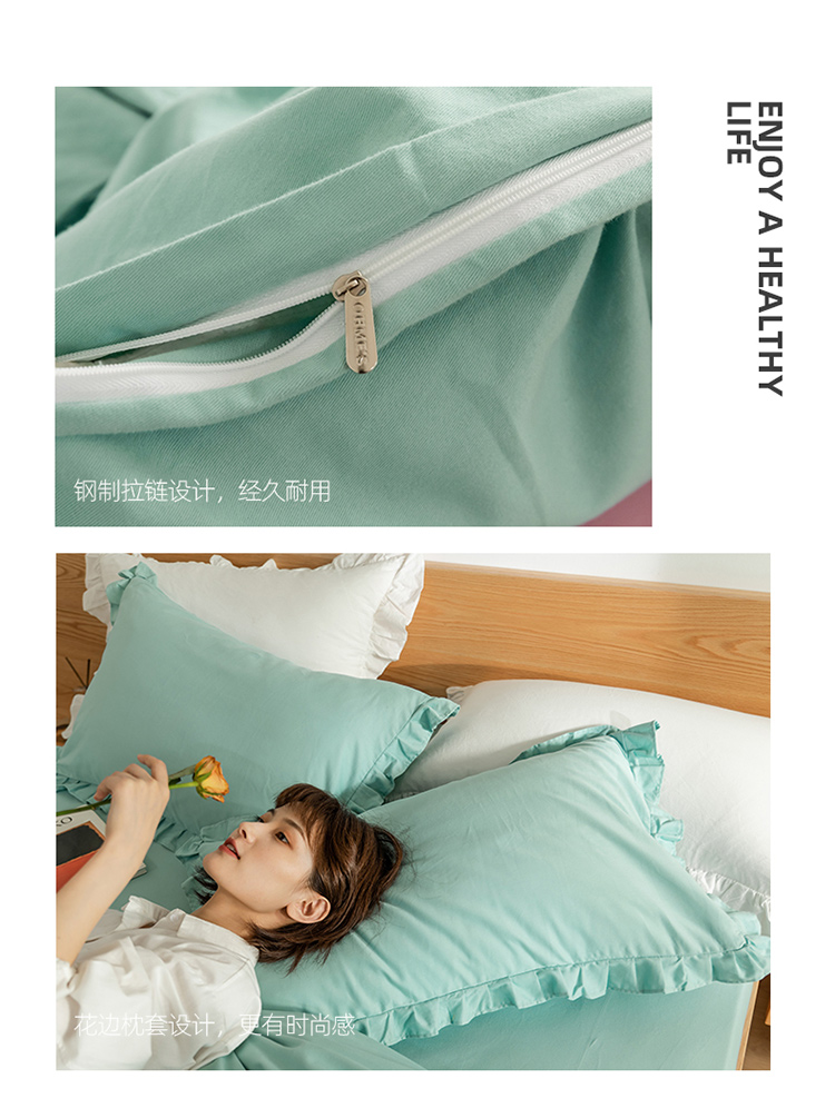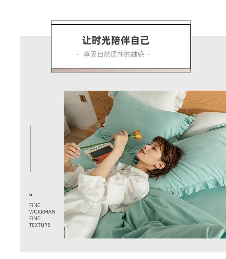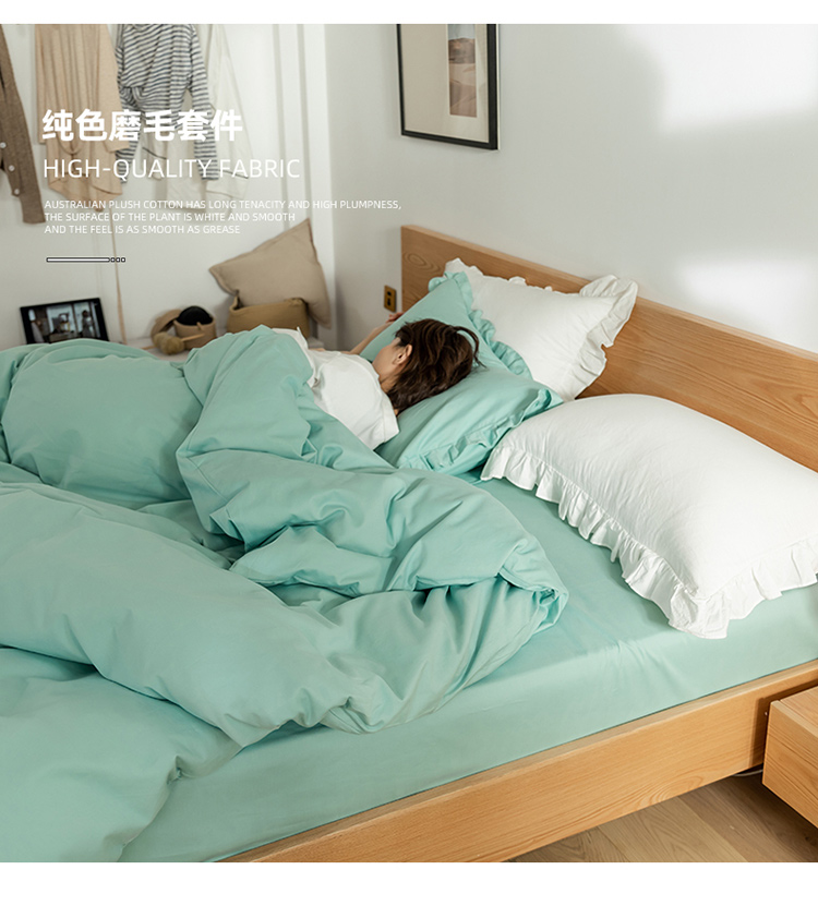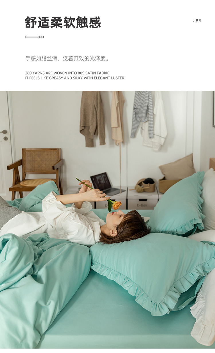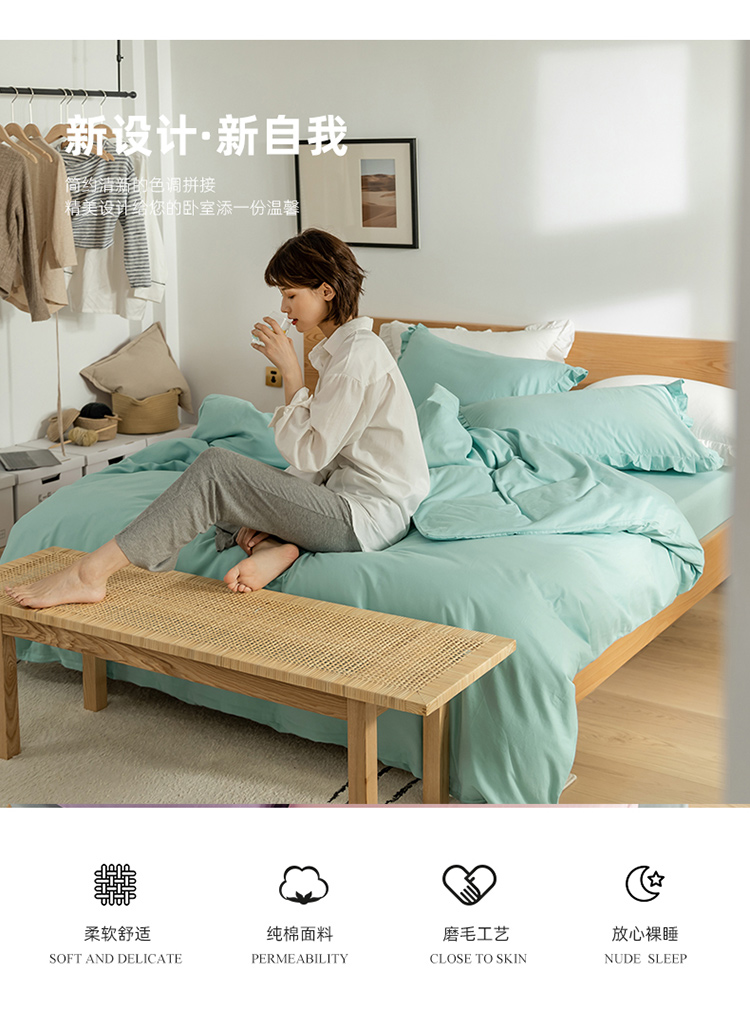 当前位置: 91家纺网 > 商品网购 > 床品套件 > 四件套 > 普通磨毛四件套 > 窝米 2020新款40s纯色磨毛四件套花边系列 湖蓝