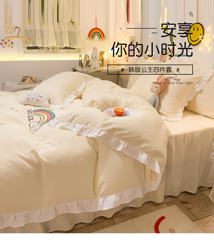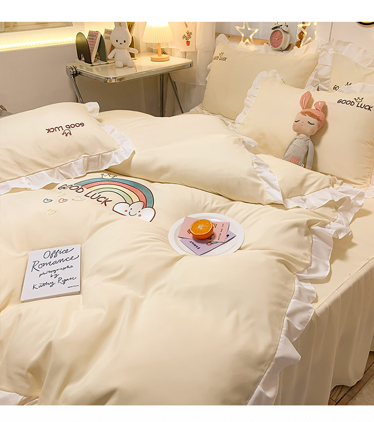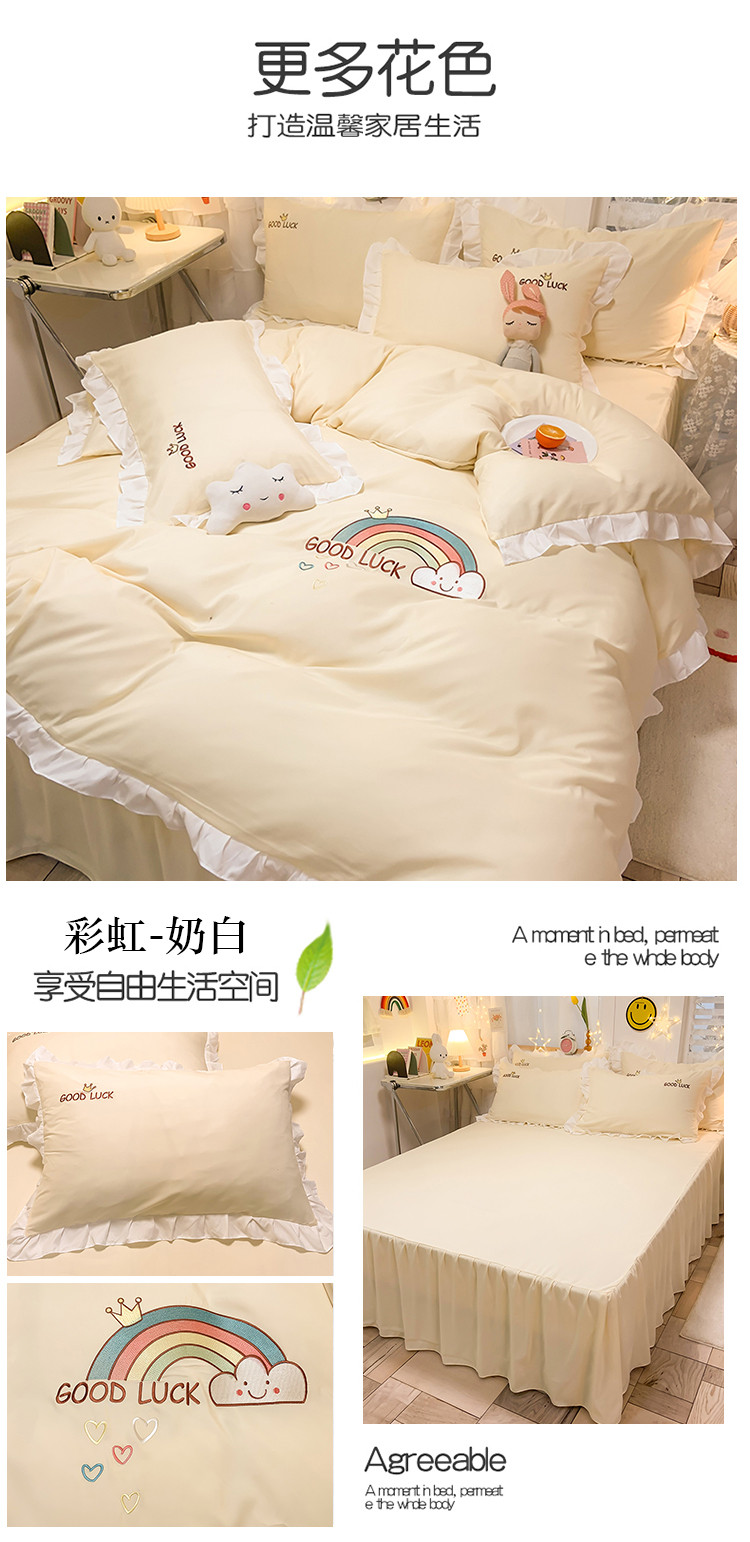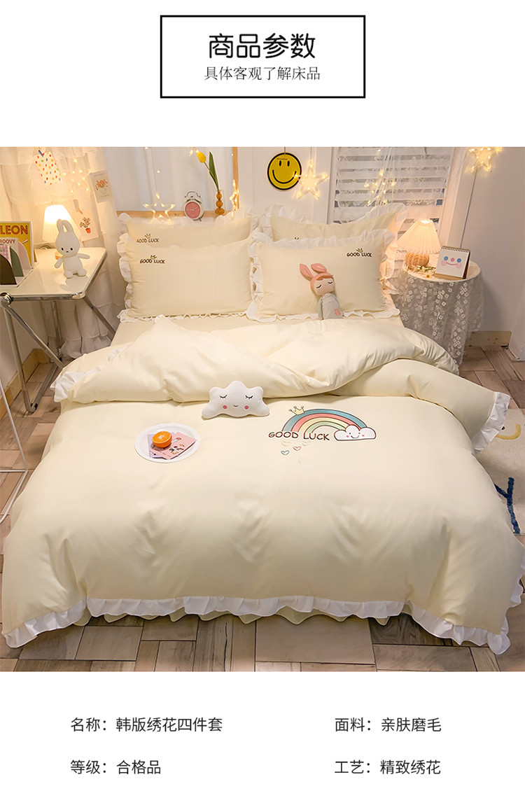当前位置: 91家纺网 > 商品网购 > 床品套件 > 四件套 > 全棉普通四件套 > 绒兔兔 2021韩版柔肤棉彩虹刺绣四件套 奶白
