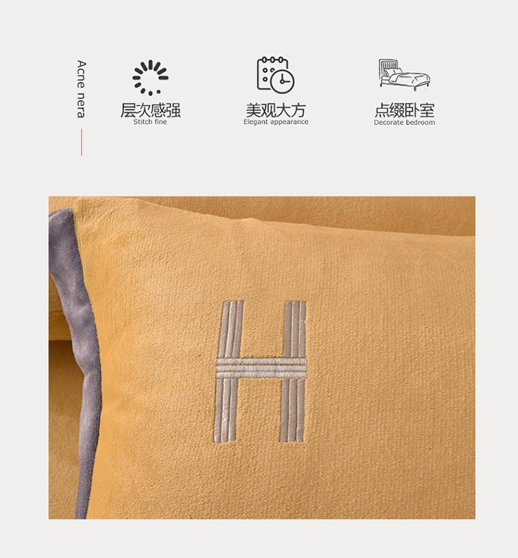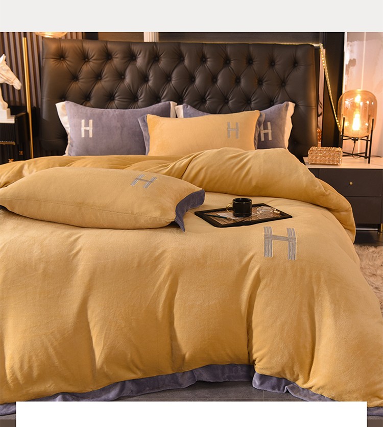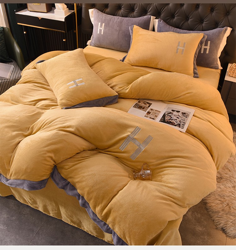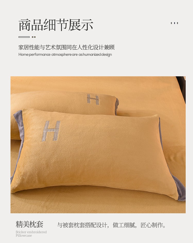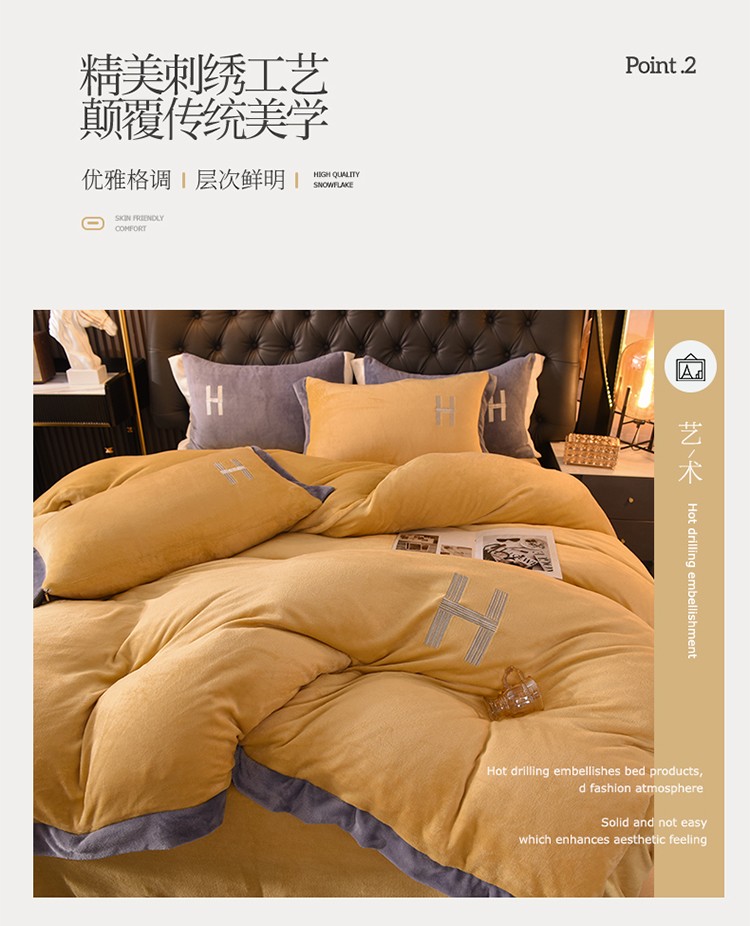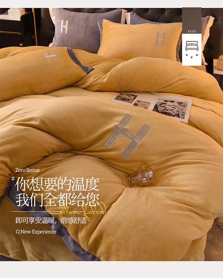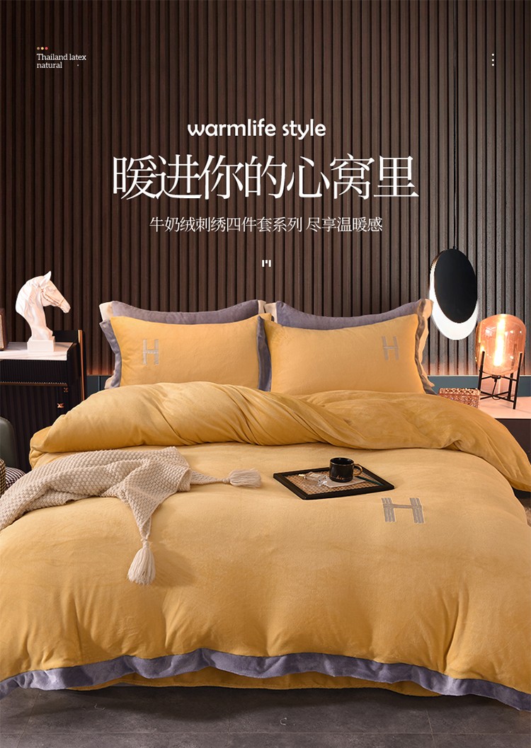 艾米家居 2021新款牛奶绒刺绣H款四件套 黄