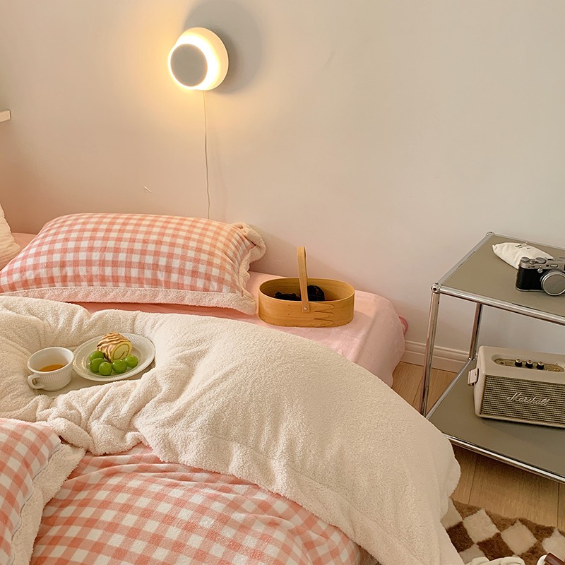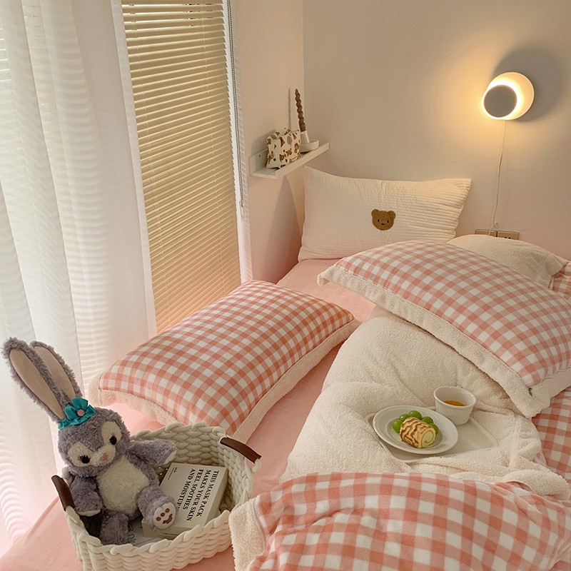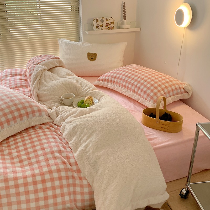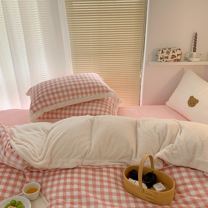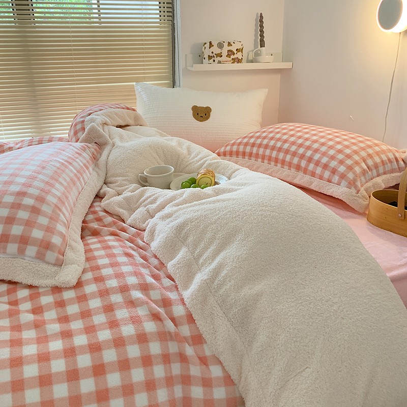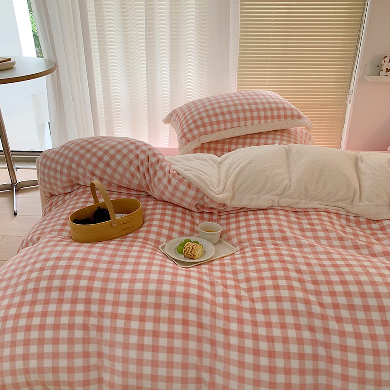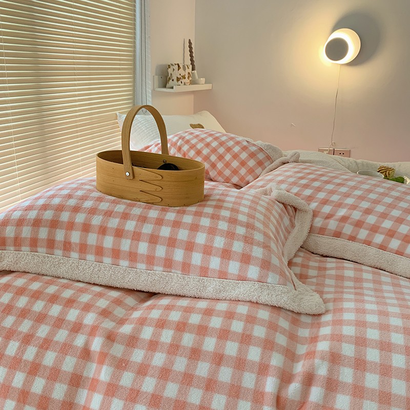 顾里 2021新款ins奶油发热牛奶绒羊羔四件套 粉格