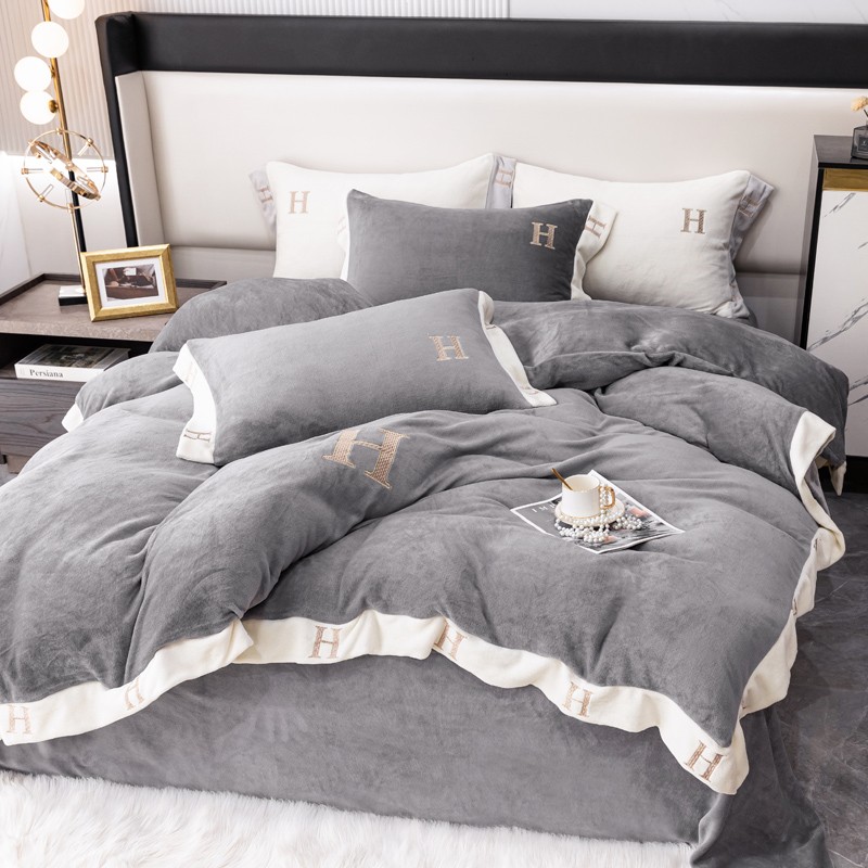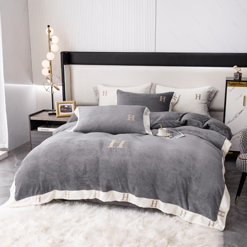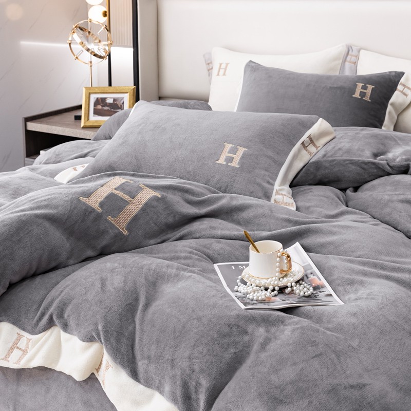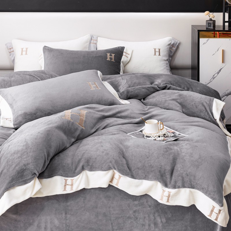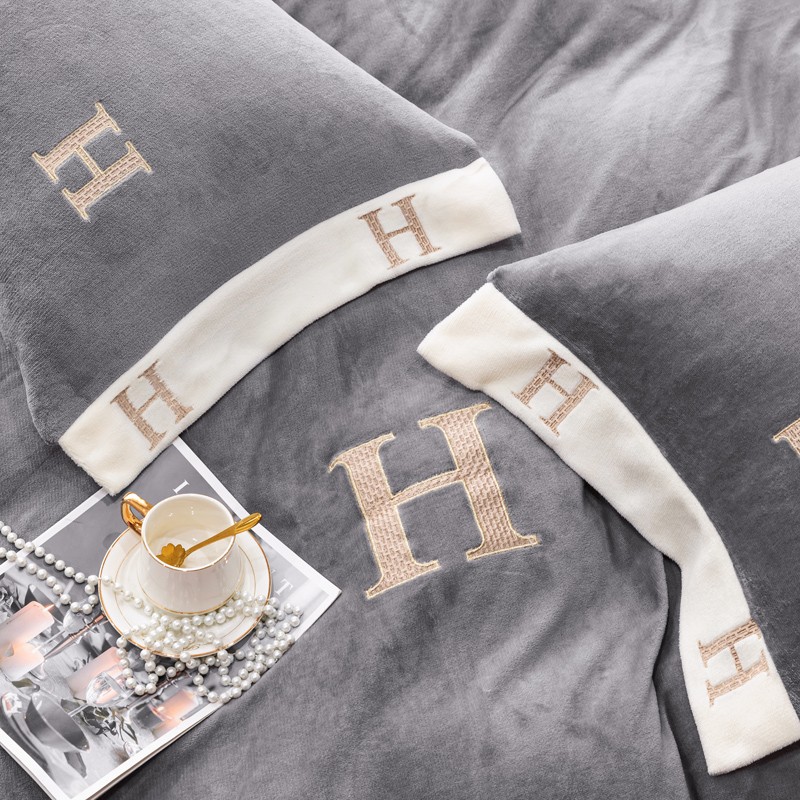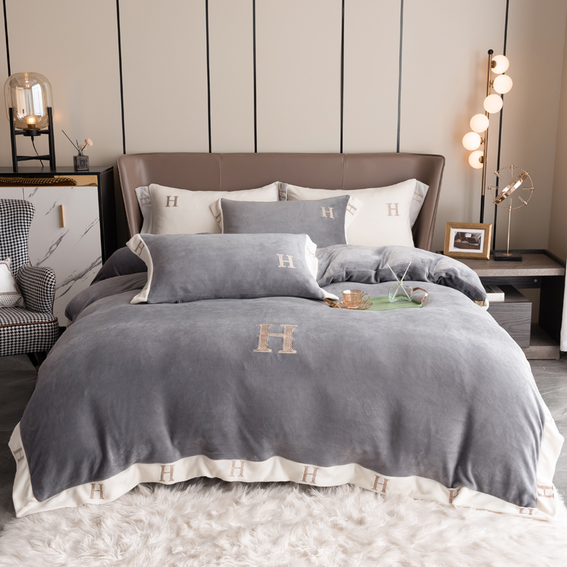 芯贝儿 2021新款加厚牛奶绒轻奢宽边刺绣四件套 雅士灰