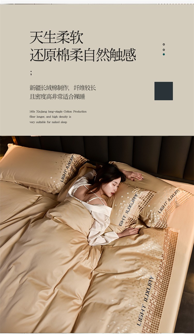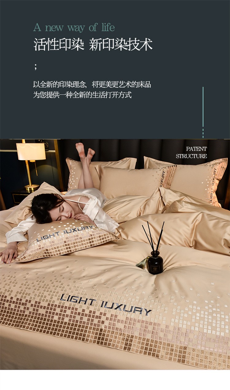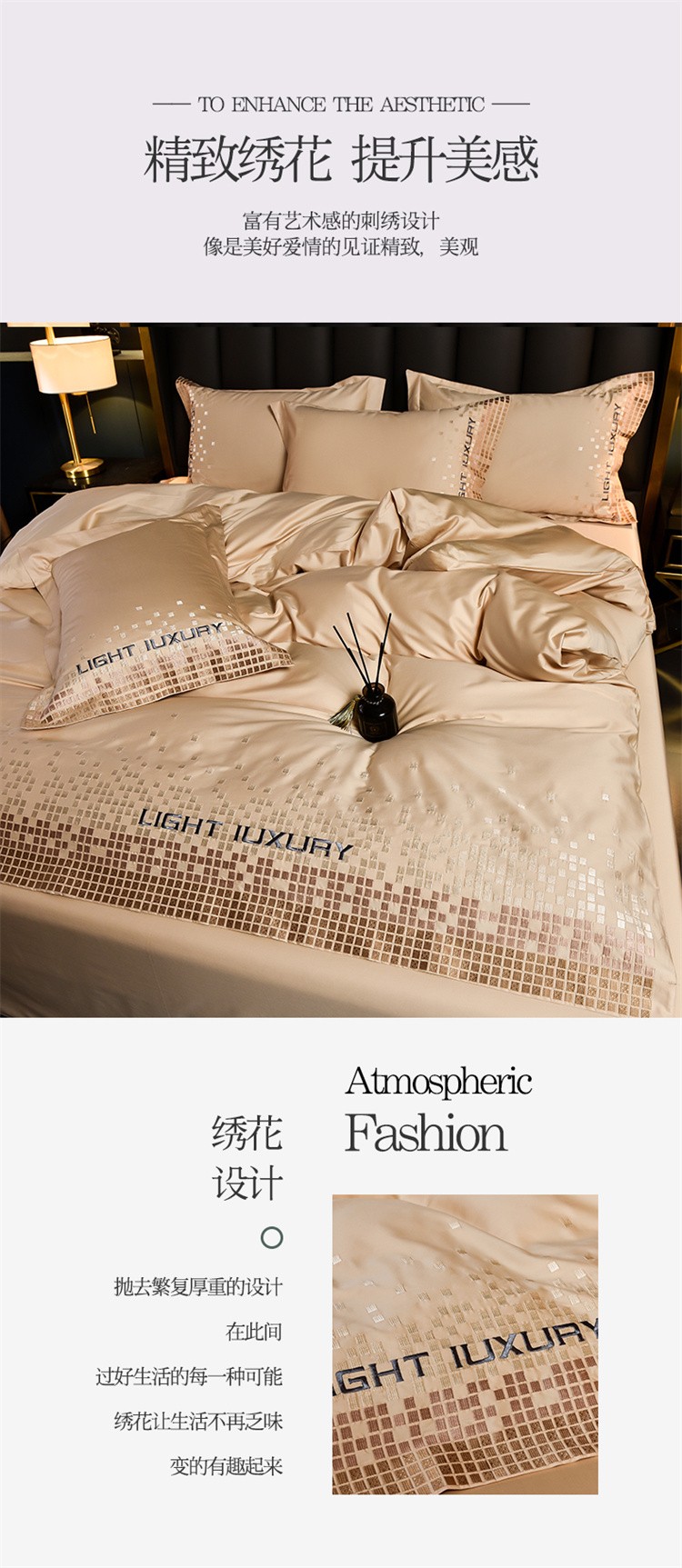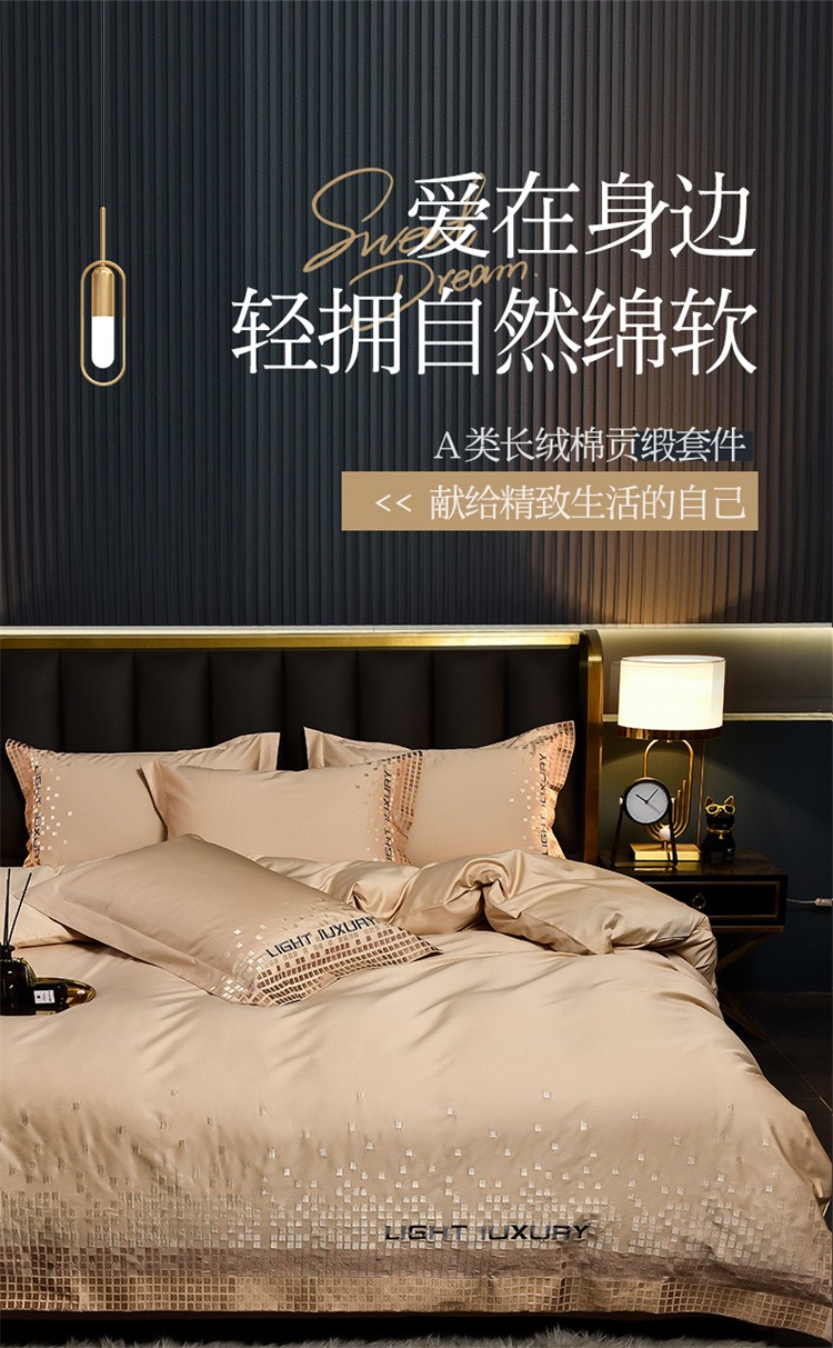 当前位置: 91家纺网 > 商品网购 > 床品套件 > 四件套 > 长绒棉四件套 > 米奈 2024新款A类100S长绒棉刺绣四件套有质检报告-戴纳香槟金