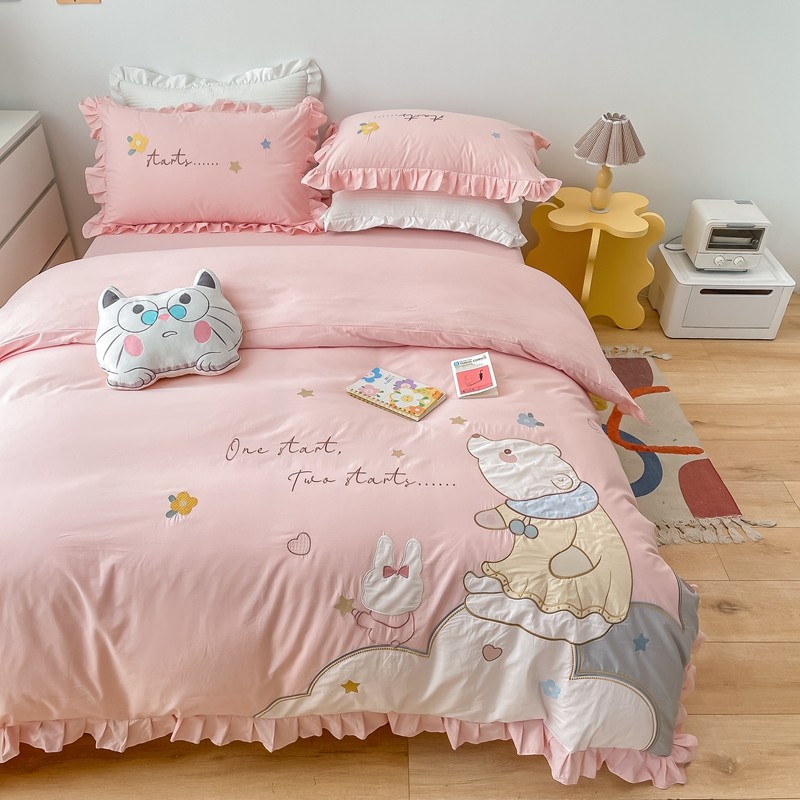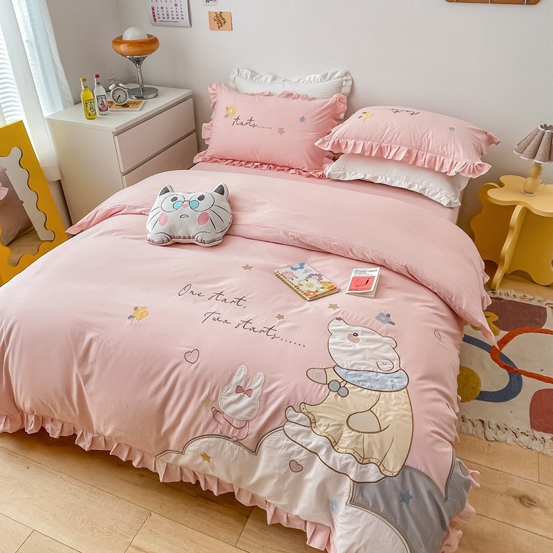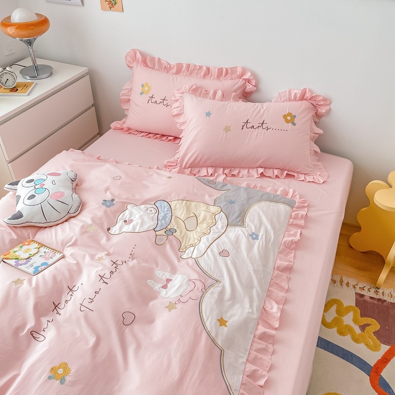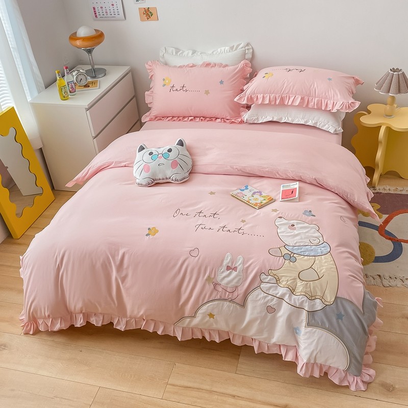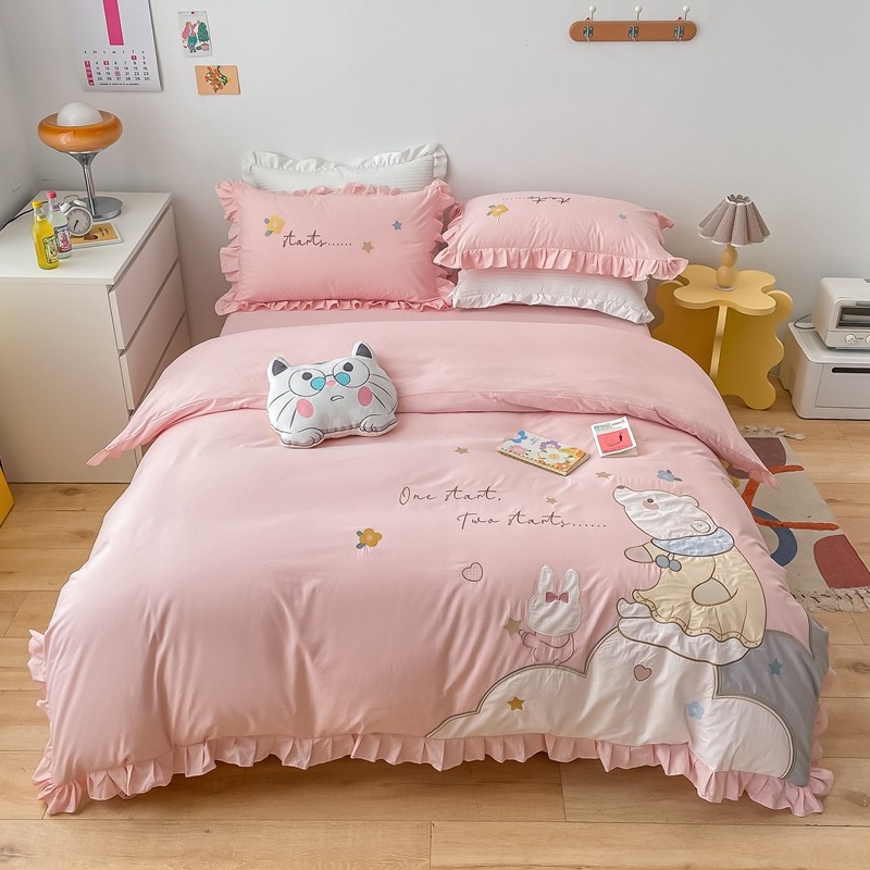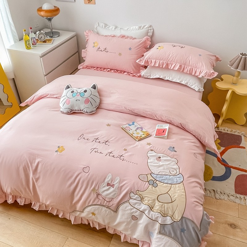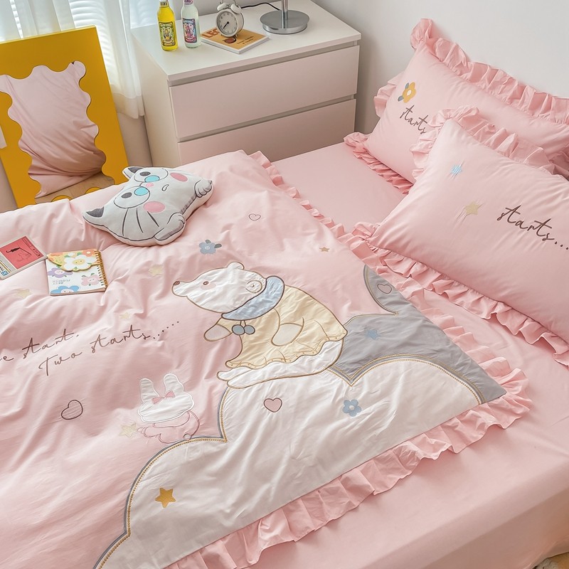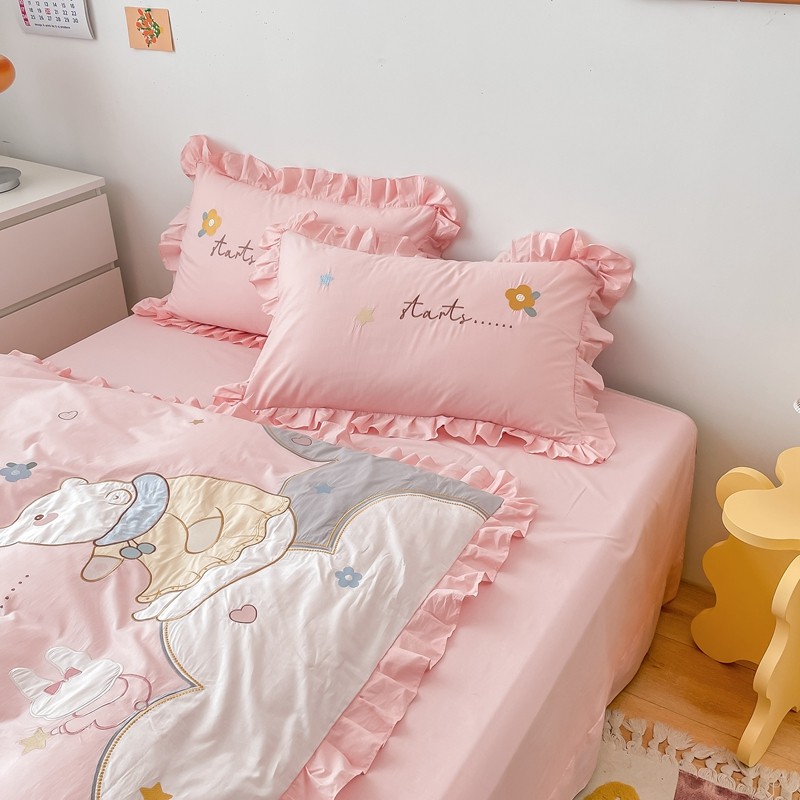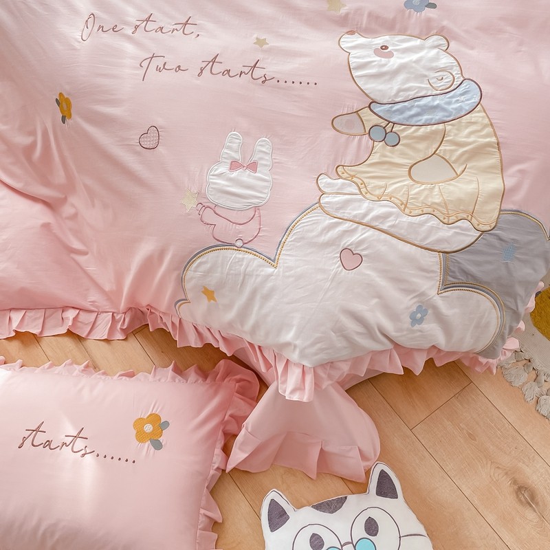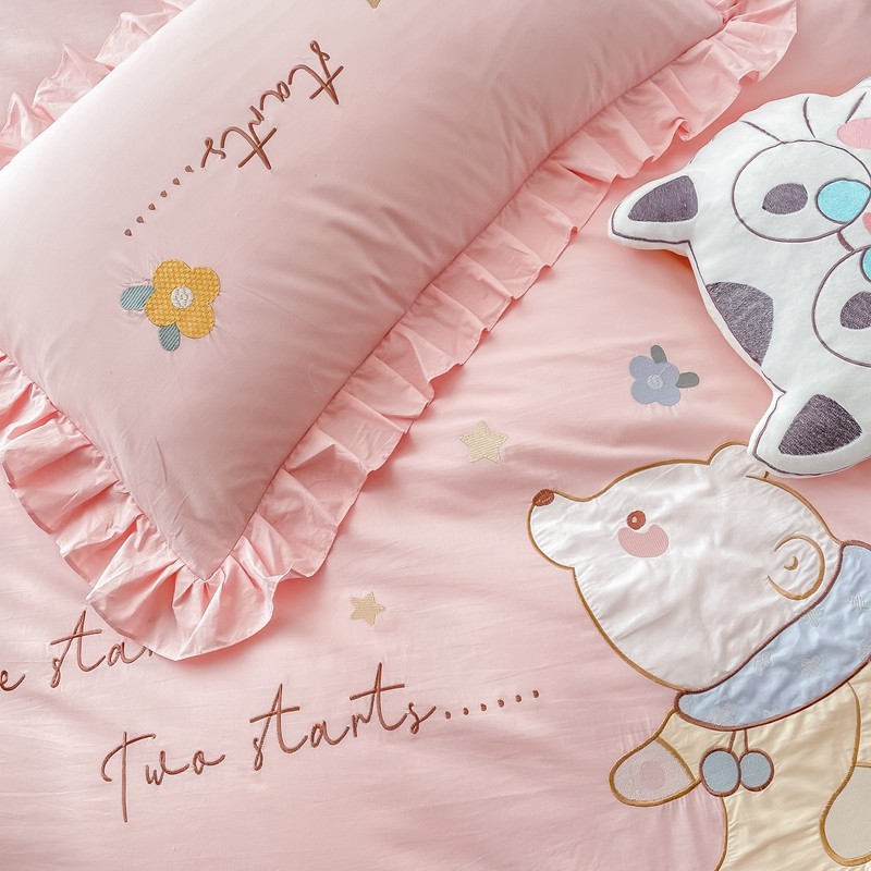 凡客 新款全棉色织水洗棉贴布绣花边四件套 童年伙伴-粉