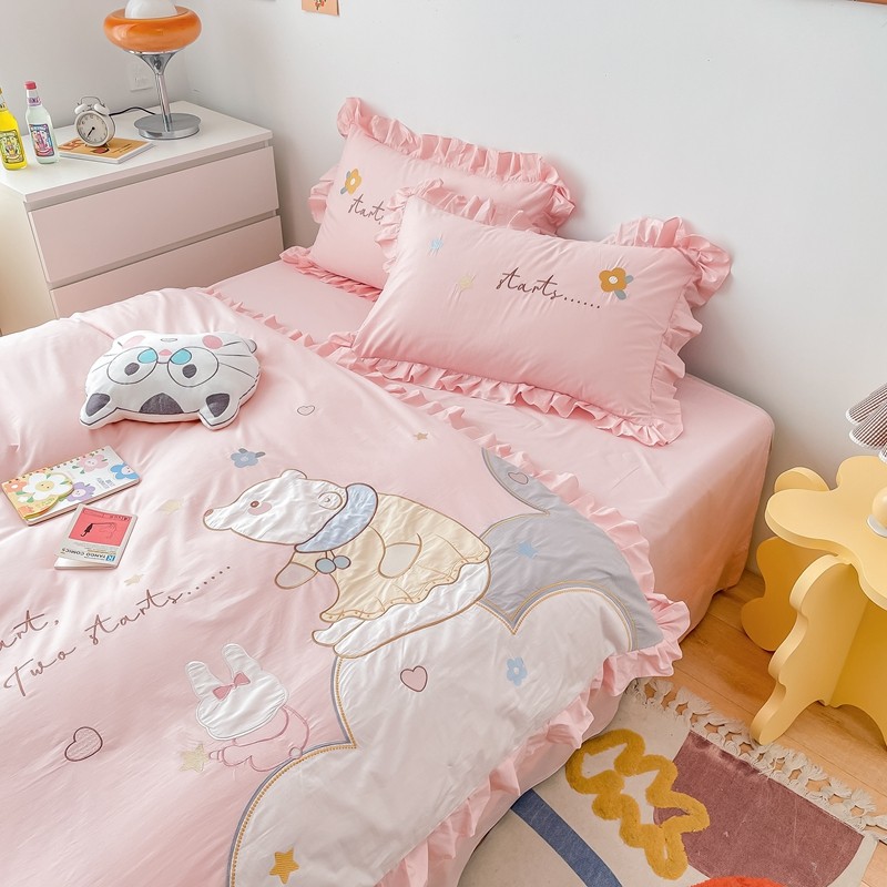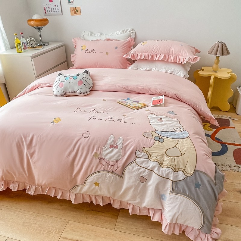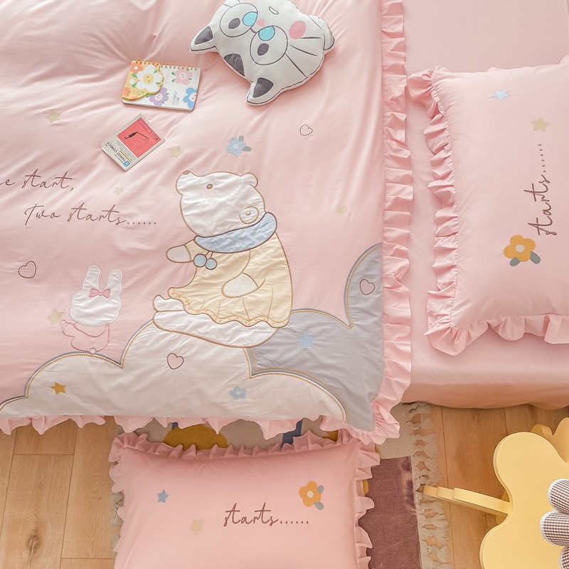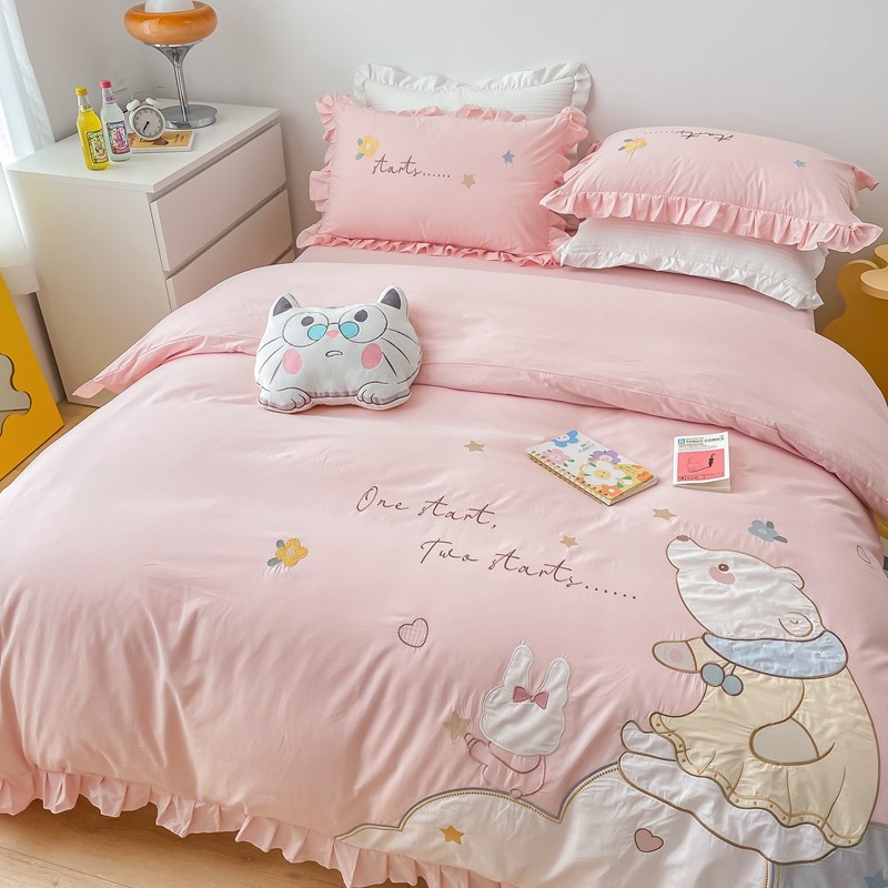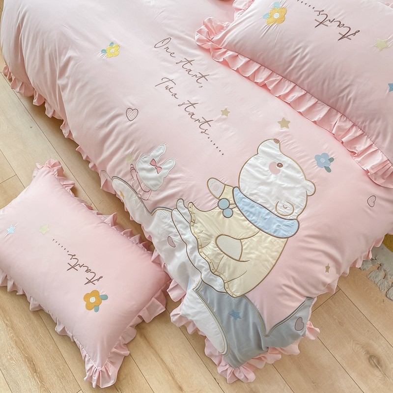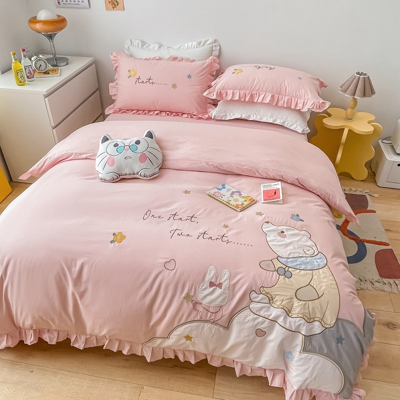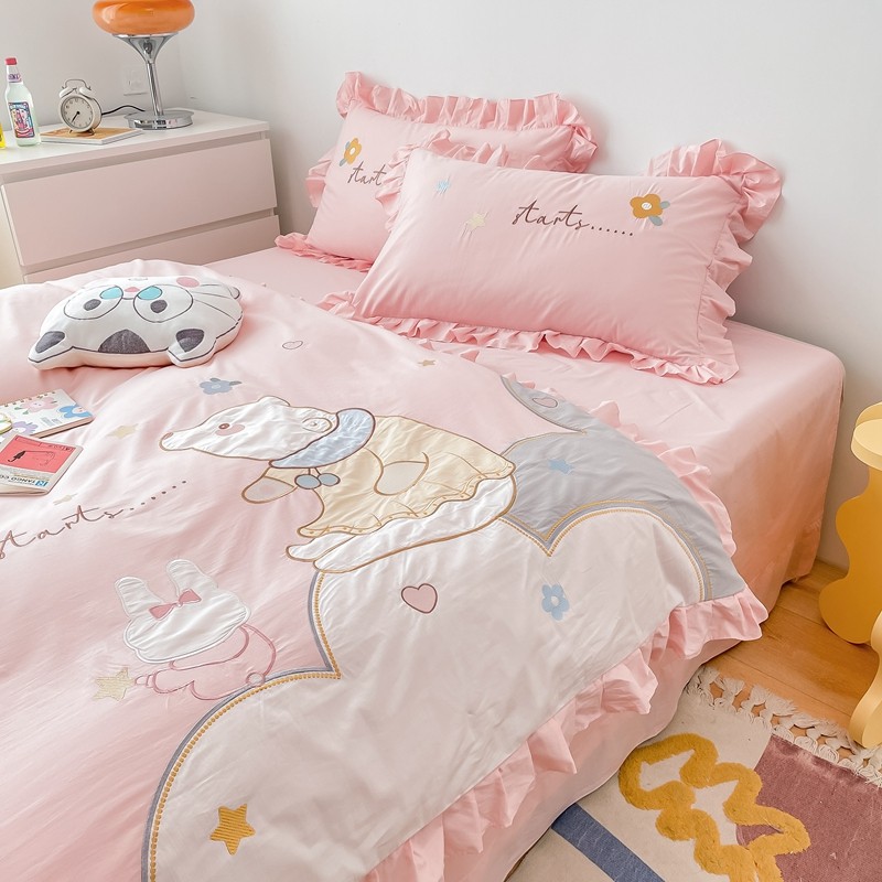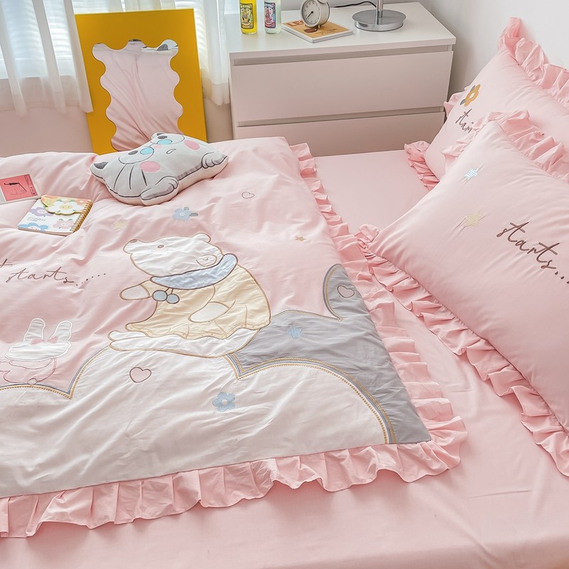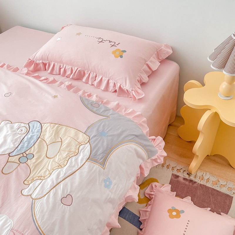 凡客 新款全棉色织水洗棉贴布绣花边四件套 童年伙伴-粉