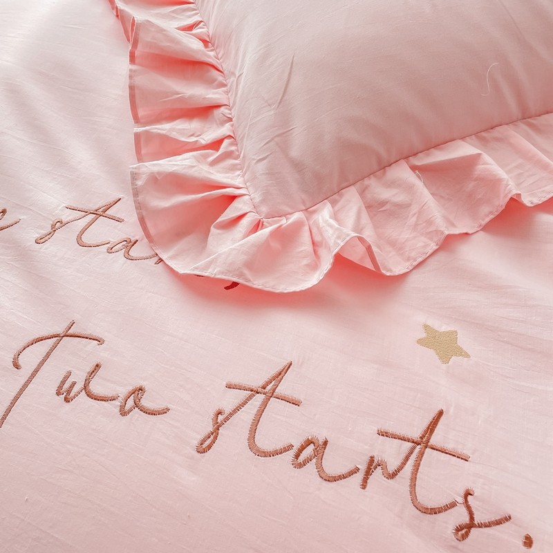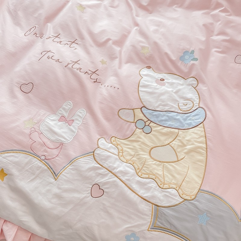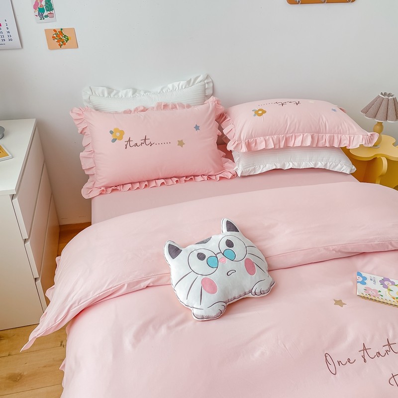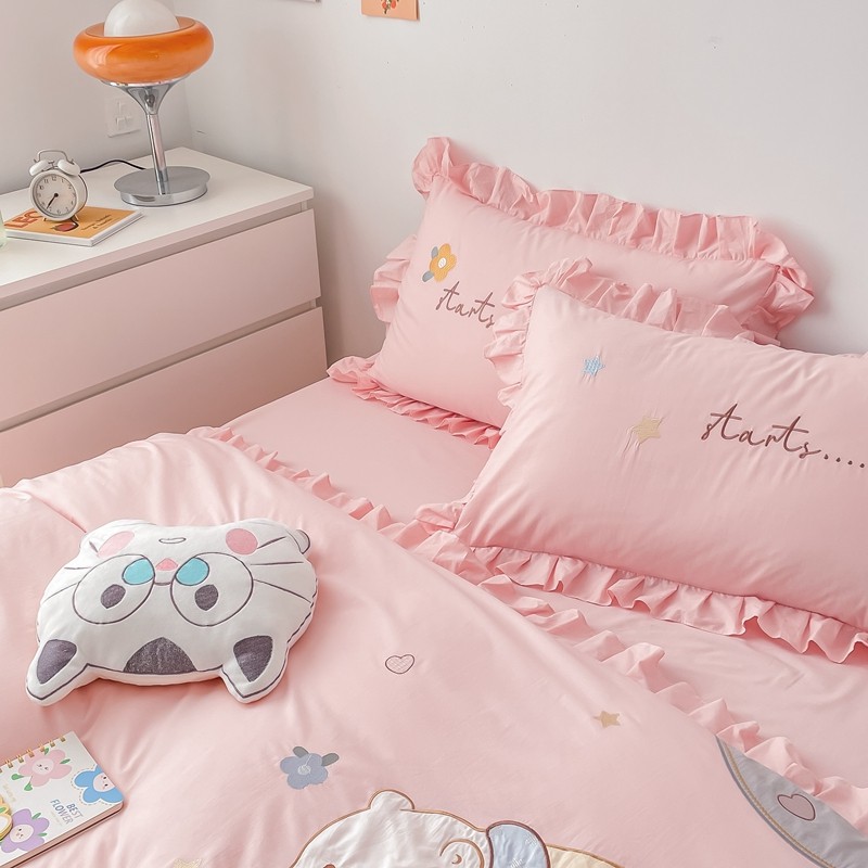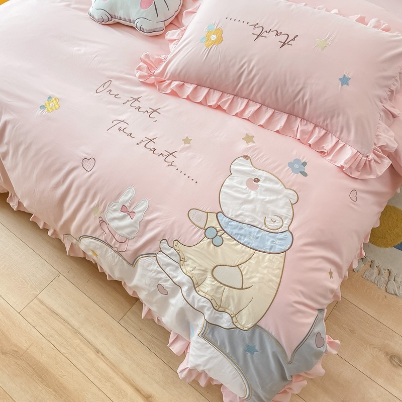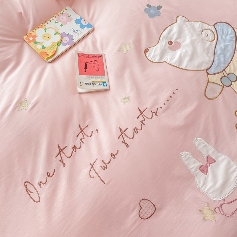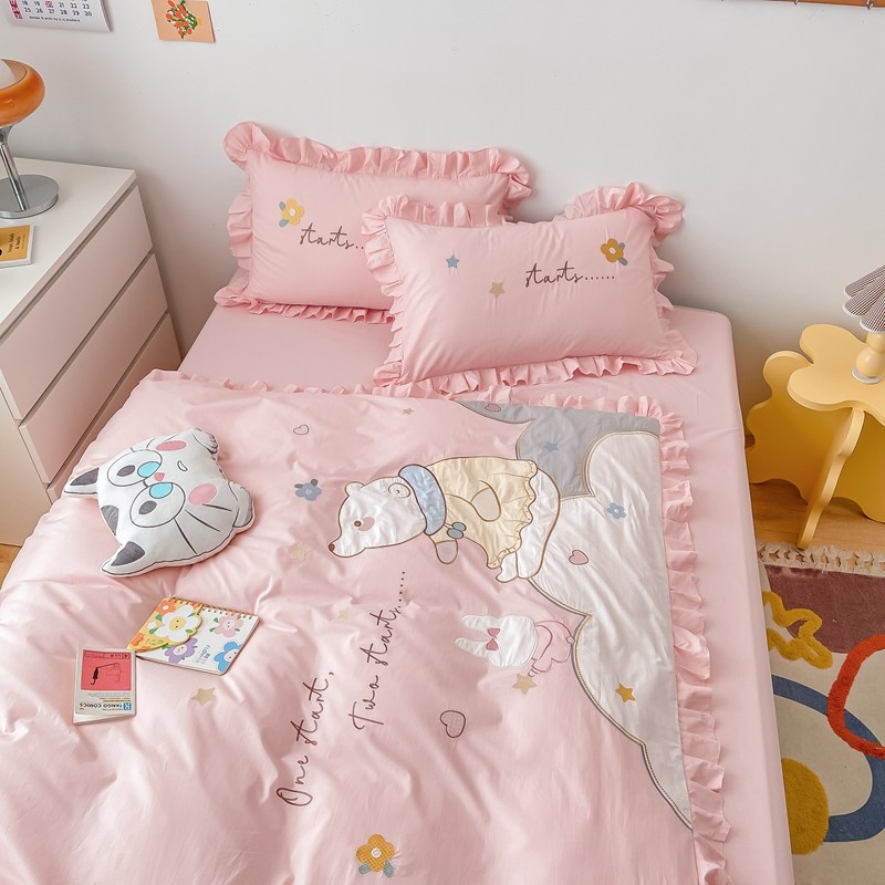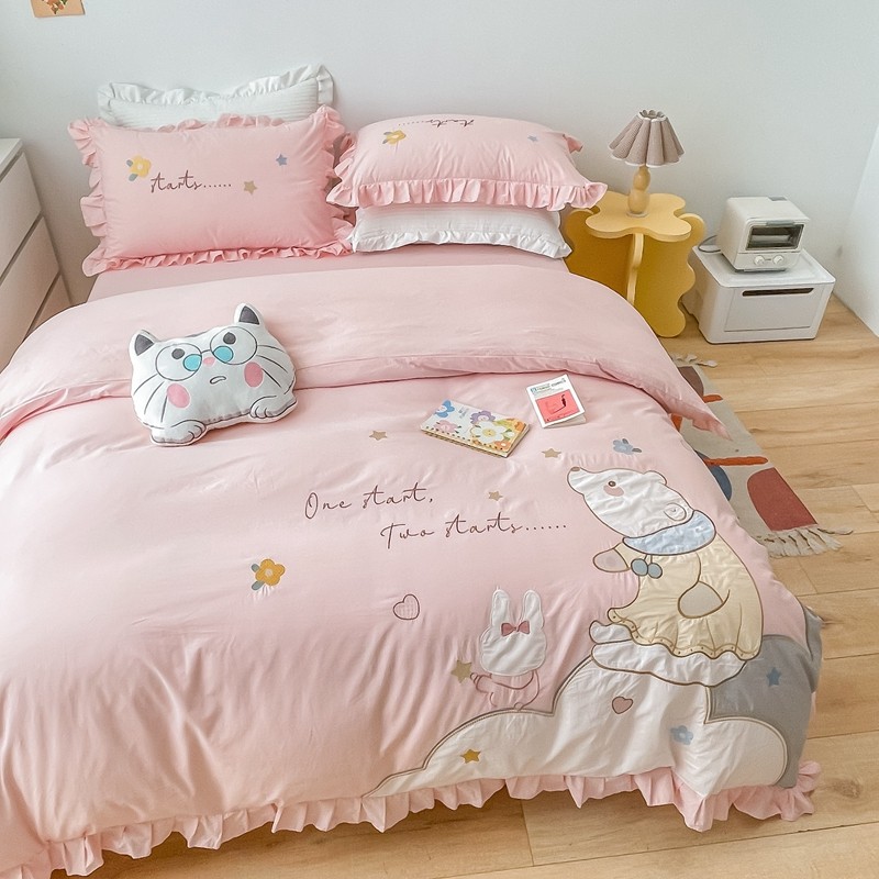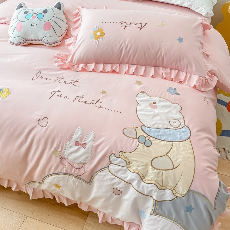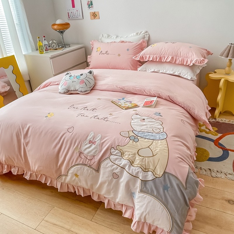 凡客 新款全棉色织水洗棉贴布绣花边四件套 童年伙伴-粉