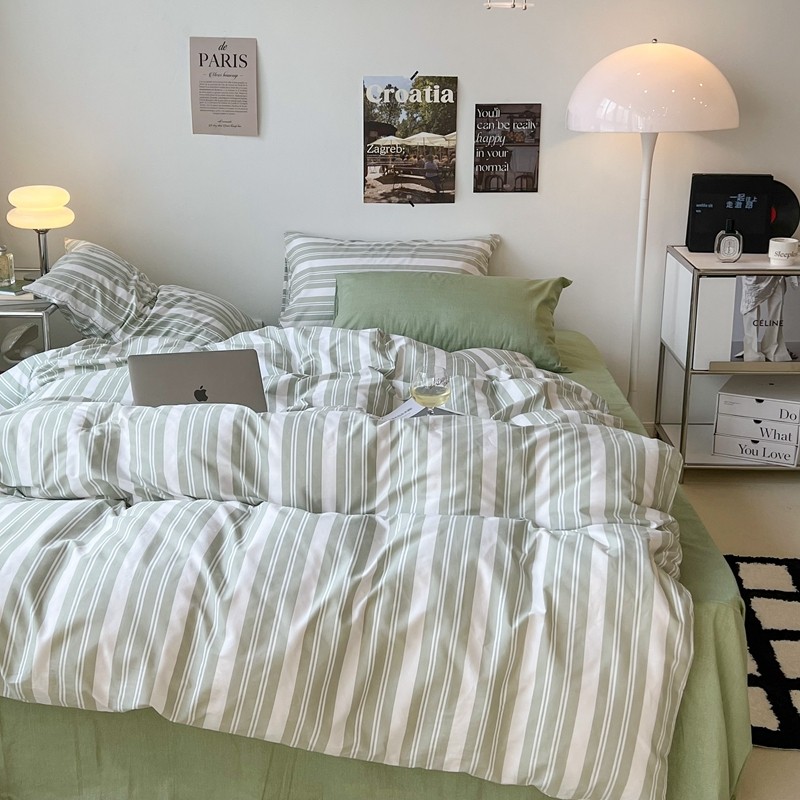昔可家纺2022新款韩风简约条纹全棉套件混搭款 混搭绿白条