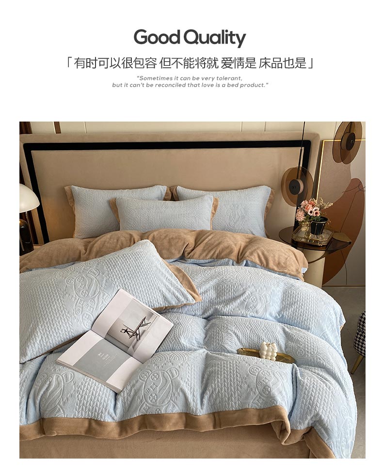 商品名称:铠畅 2022新款230克轻奢简约烂花绒牛奶绒剪花四件套 魅力熊-浅蓝