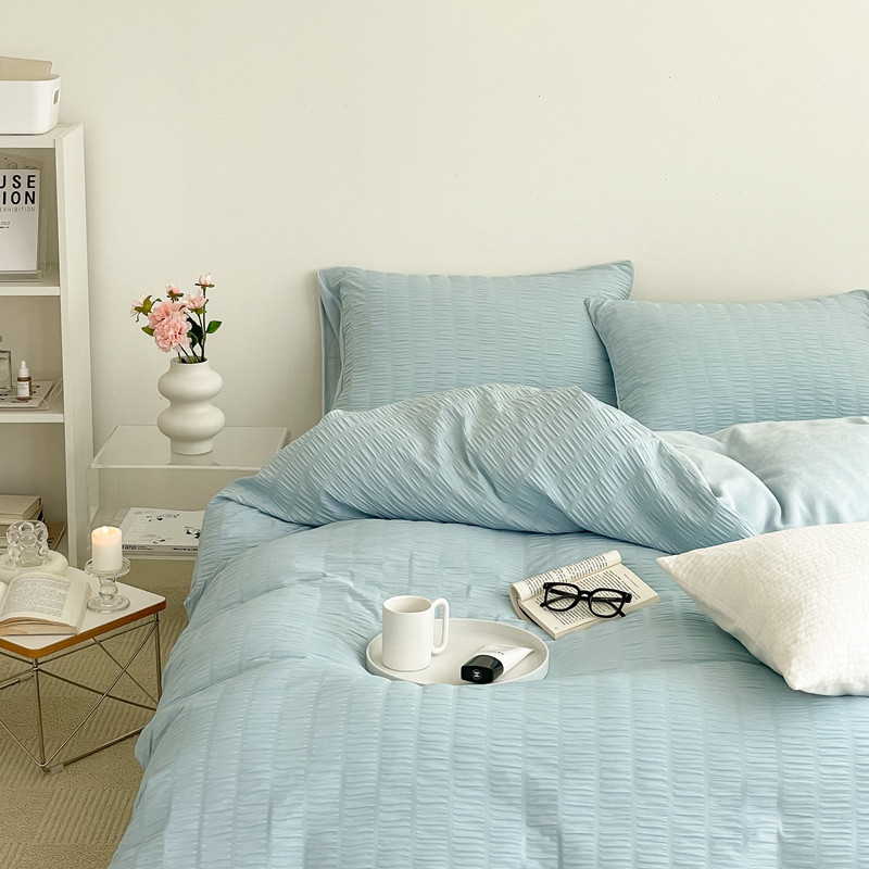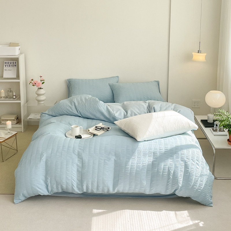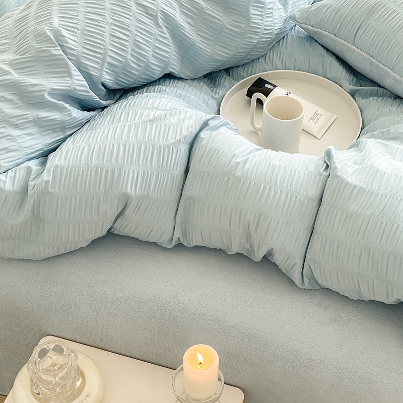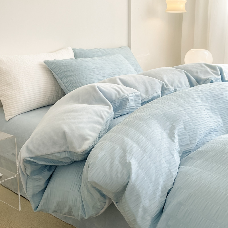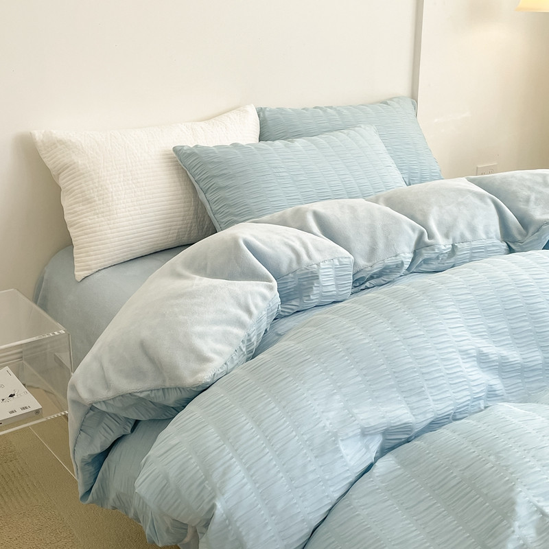 商品名称:顾里家纺 2022新款ins韩系仙女泡泡纱牛奶绒四件套 雾霾蓝