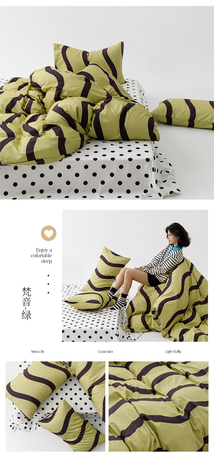 商品名称:雅居纺 2023新款13070黑白系全棉四件套 梵音-绿