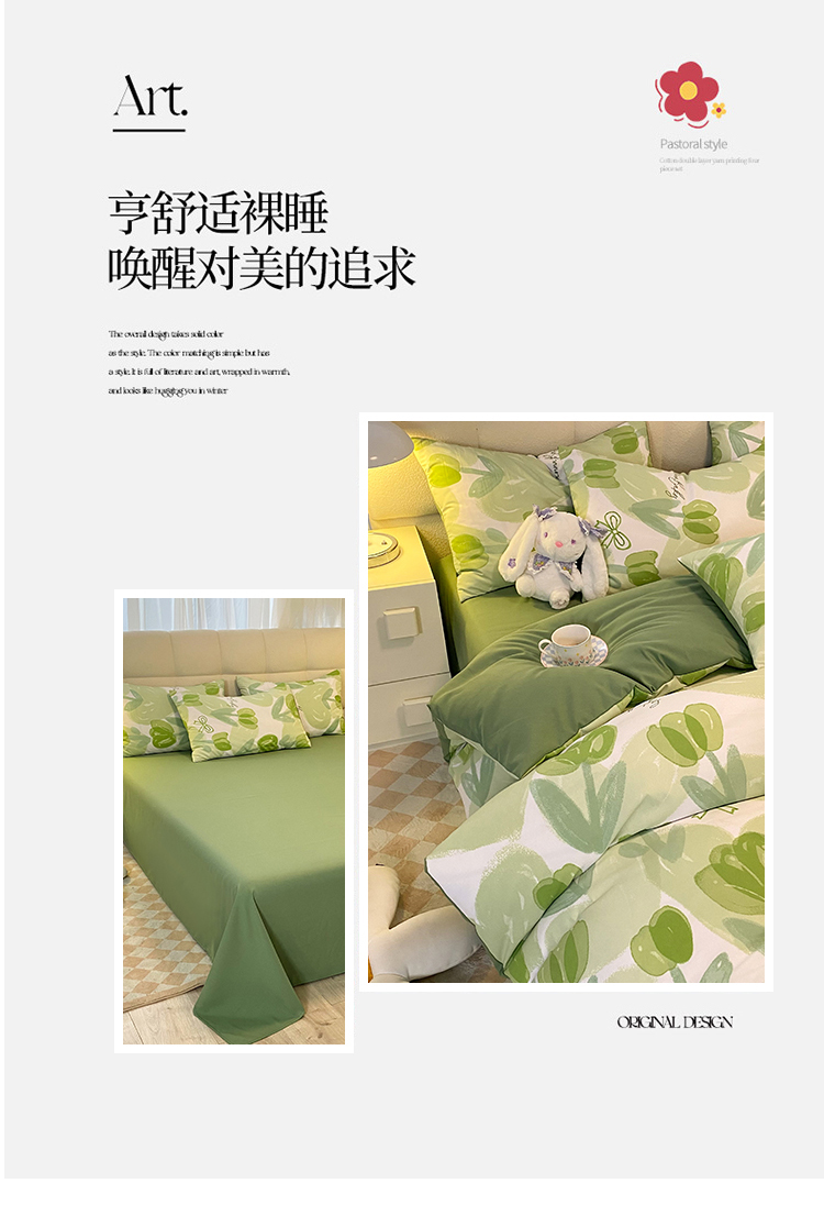 妖妖家纺2023新款水洗棉麻四件套 绿色郁金香
