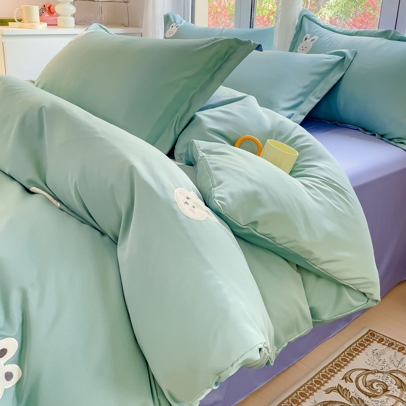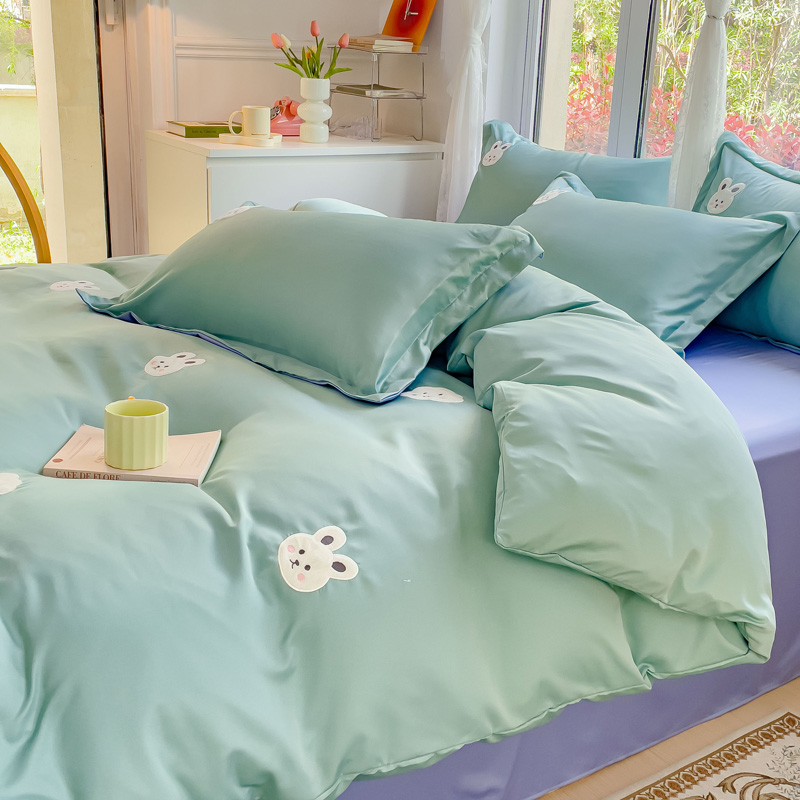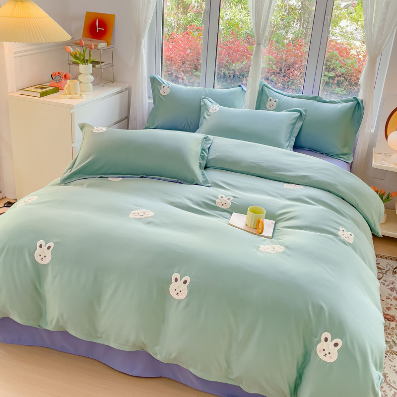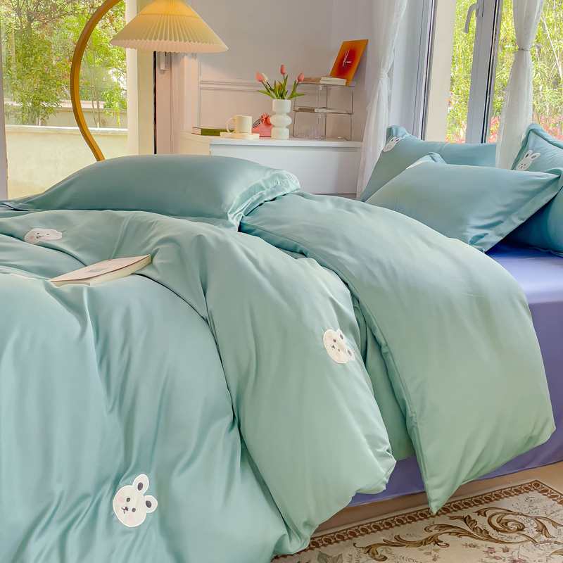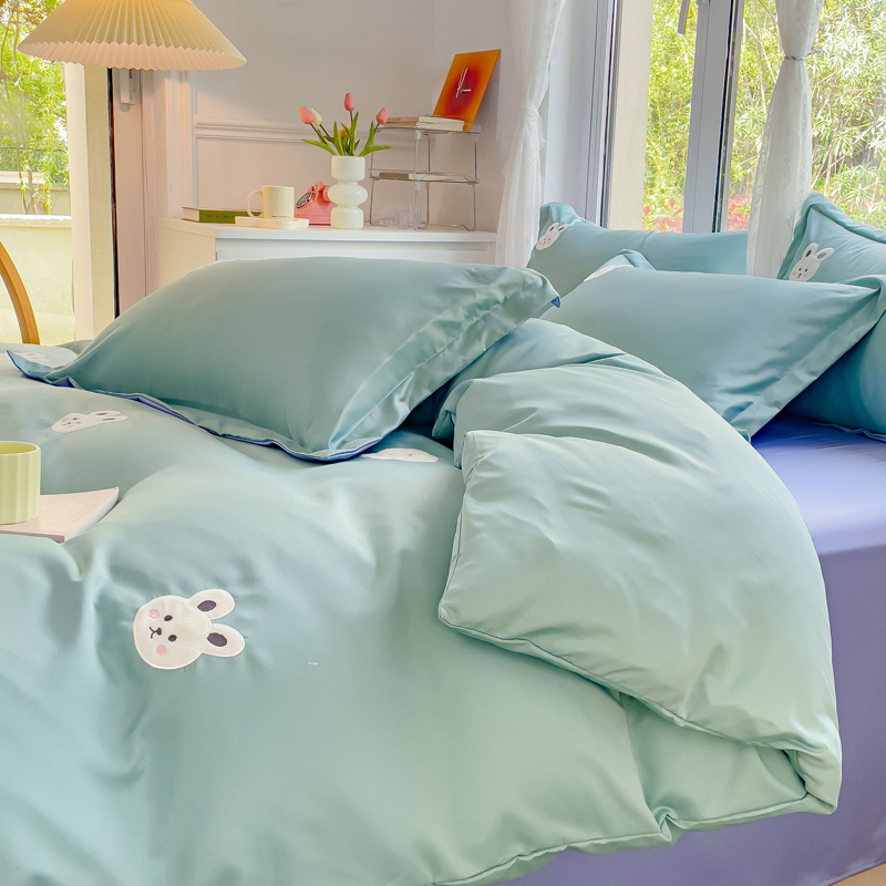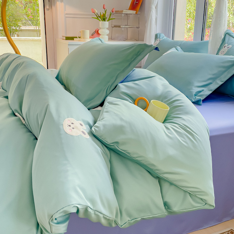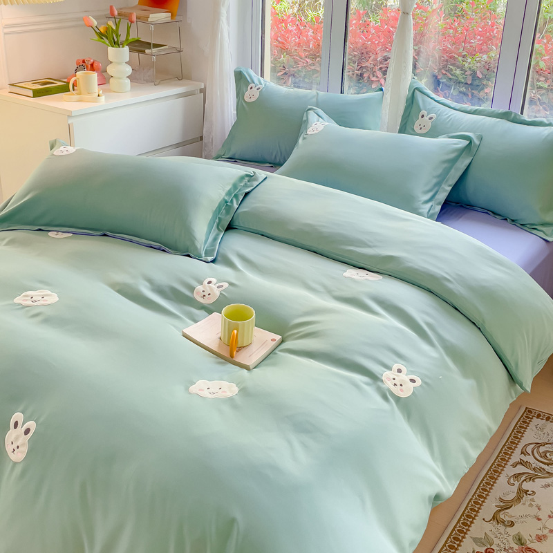 金丝鸟 2023新款水洗真丝贴布绣花四件套 萌兔-水绿