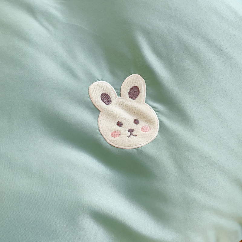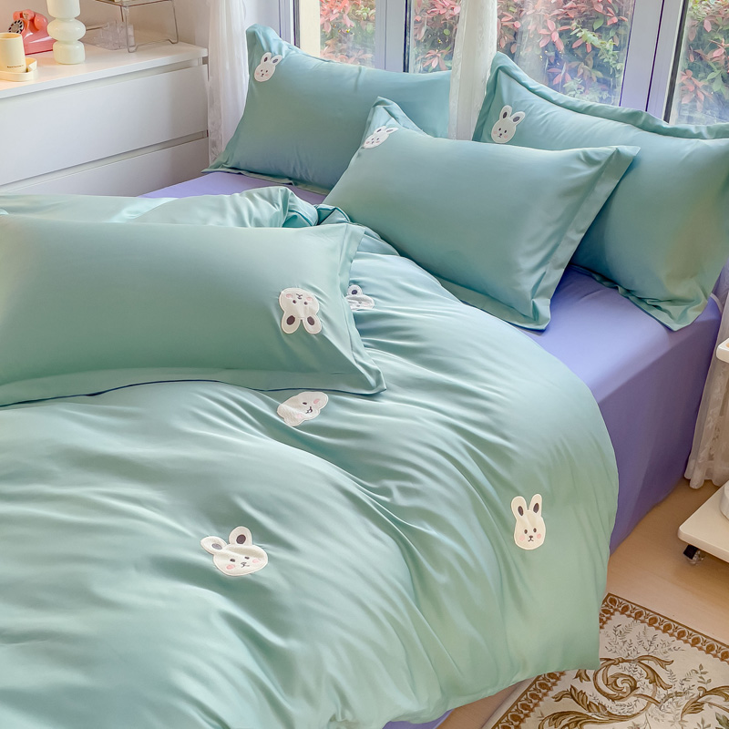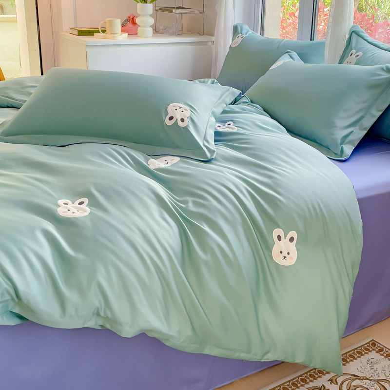 商品名称:金丝鸟 2023新款水洗真丝贴布绣花四件套 萌兔-水绿