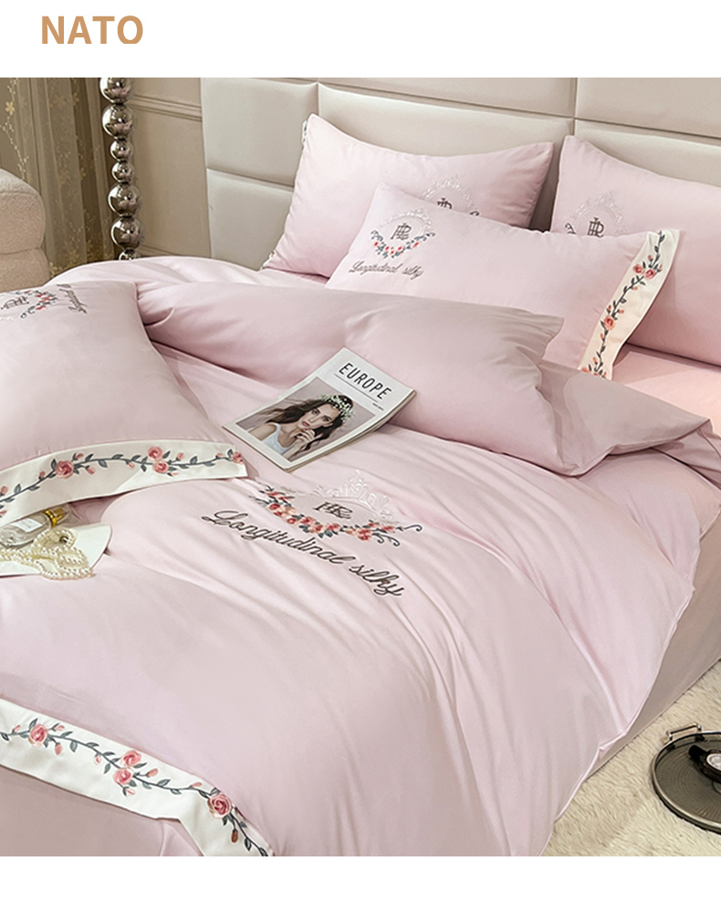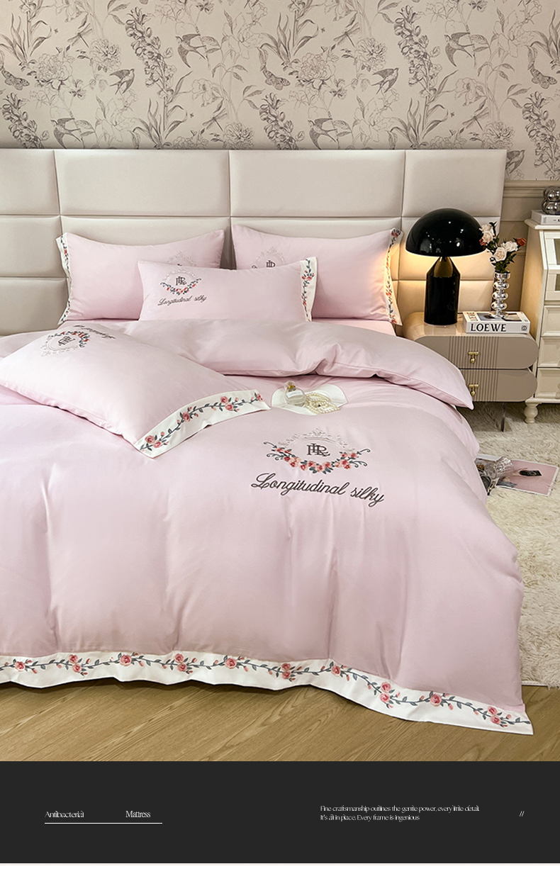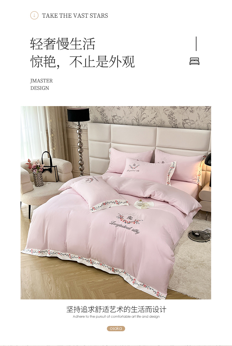 易辰美 2024新款A类高克重水洗磨毛云柔棉刺绣四件套 少女粉