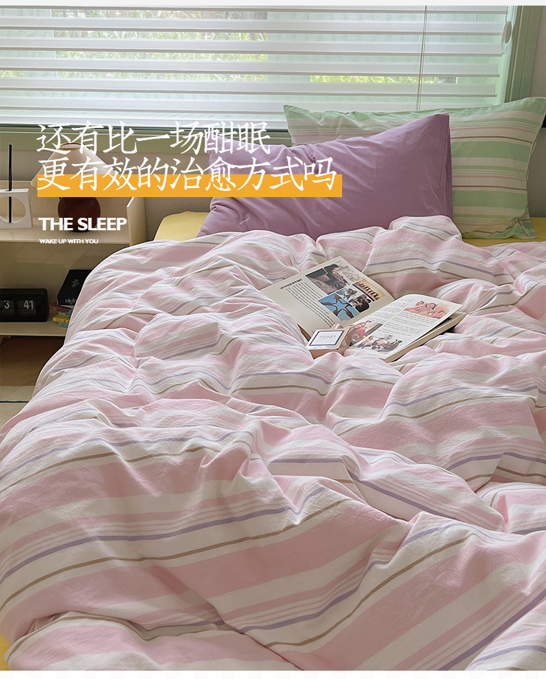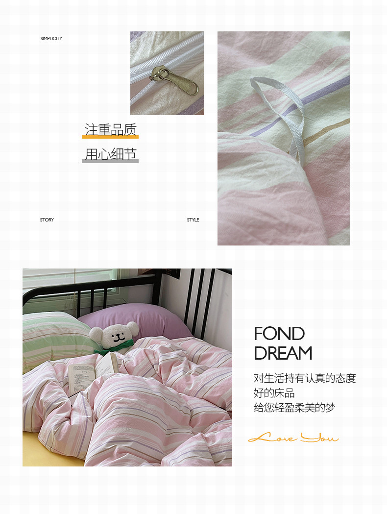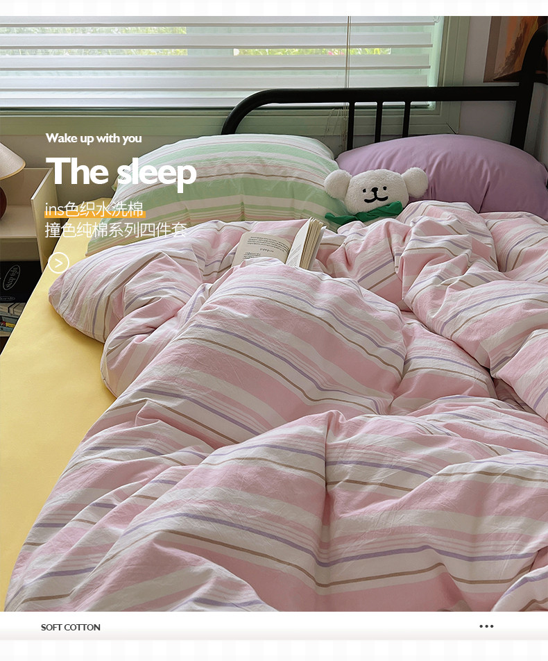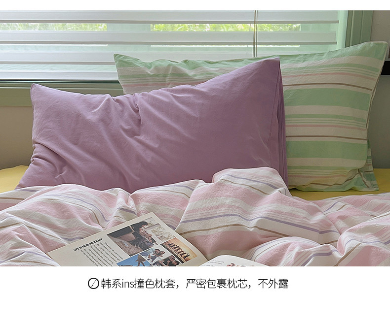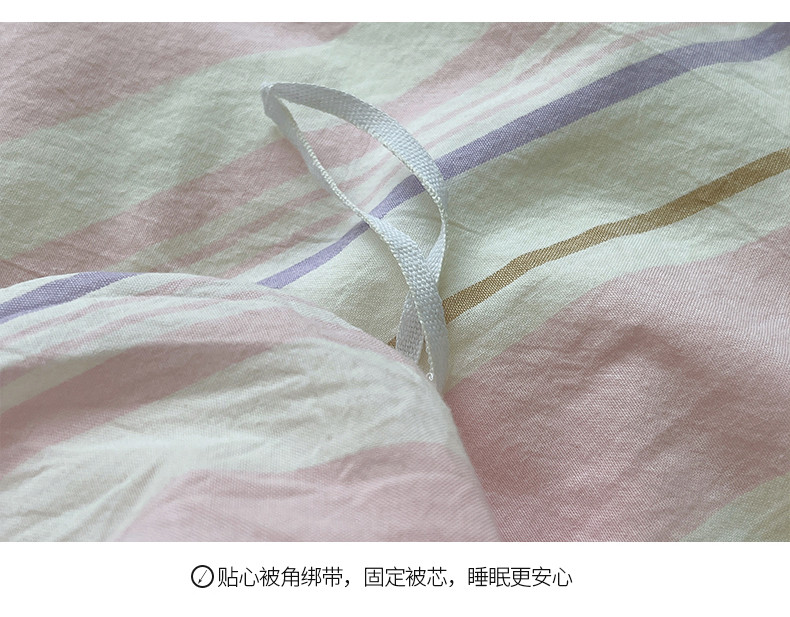 商品名称:桃子 2023新款韩系ins色织水洗棉条纹混搭撞色纯棉系列四件套 色织水洗棉-条纹粉