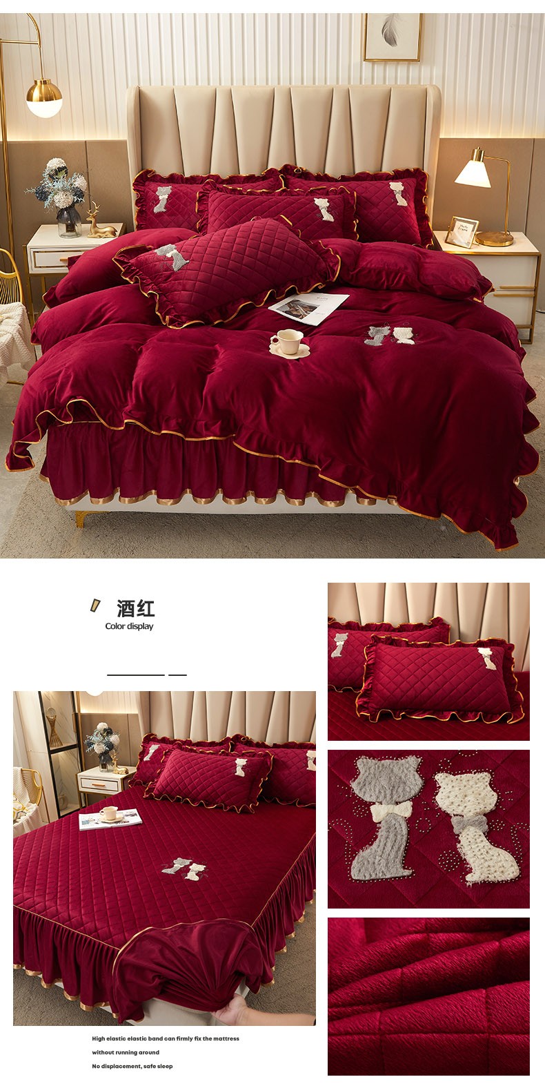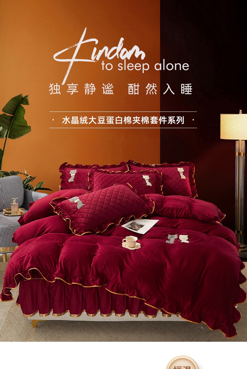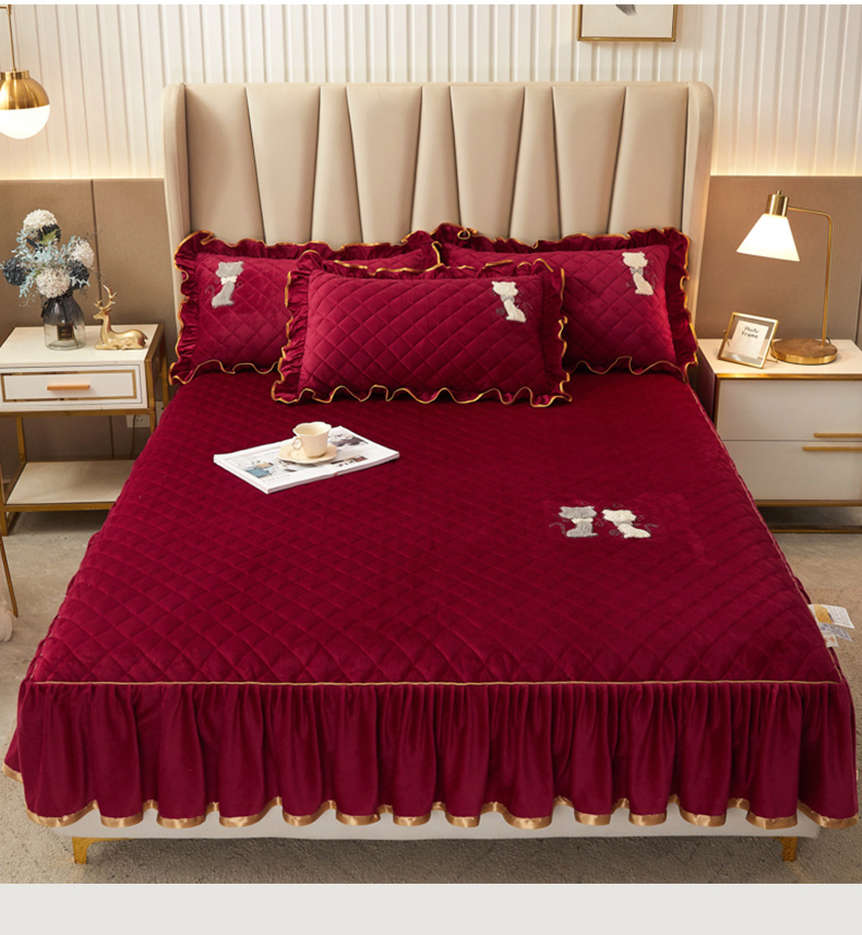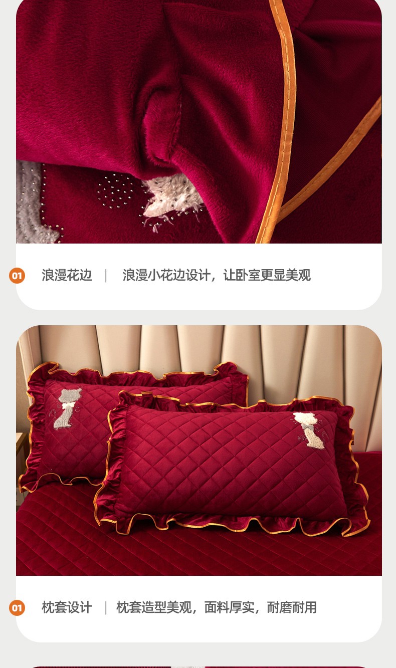 当前位置: 91家纺网 > 商品网购 > 床品套件 > 四件套 > 水晶绒四件套 > 恋尚 2023新款水晶绒夹棉床裙床笠四件套-KT猫系列 酒红