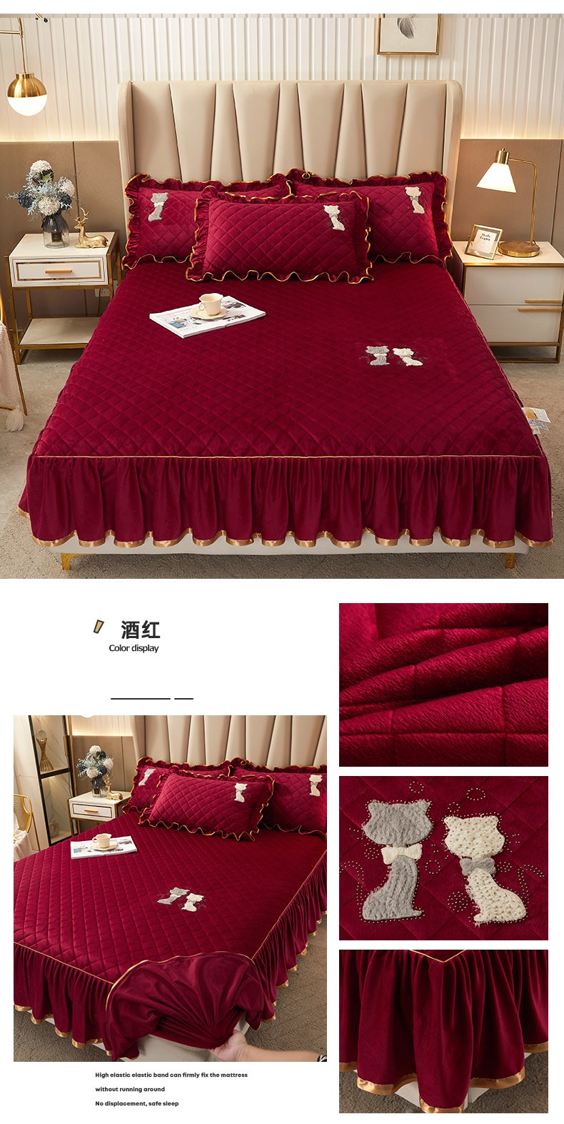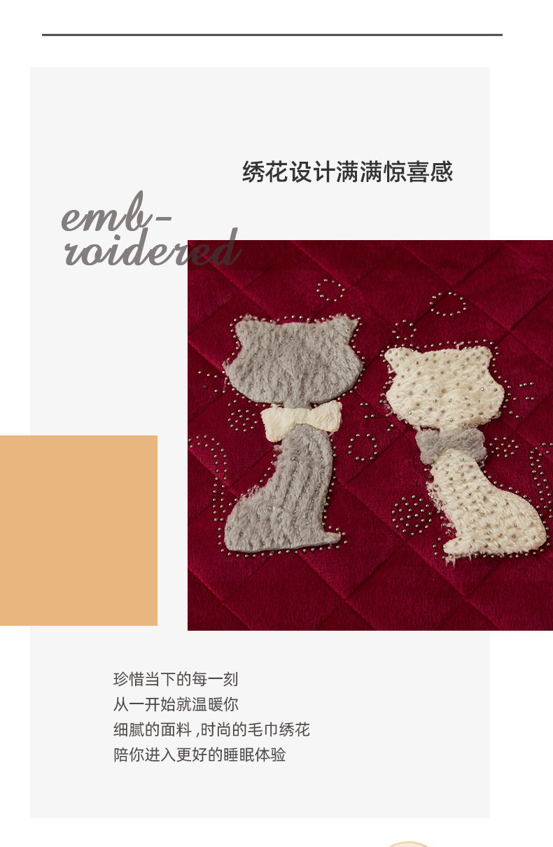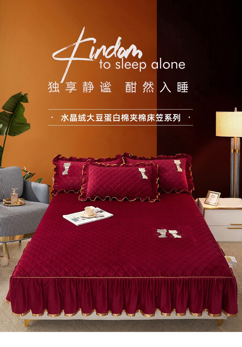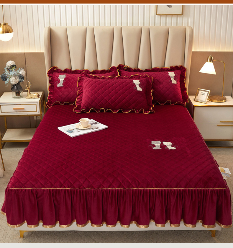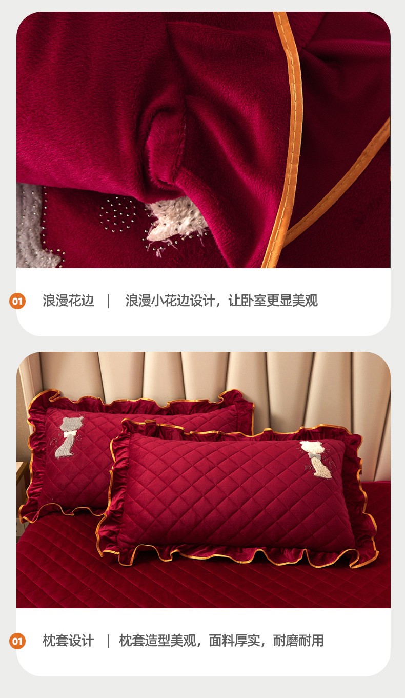 • 91家纺网 家纺一手货源 找家纺 恋尚 2023新款水晶绒夹棉床裙床笠四件套-KT猫系列 酒红