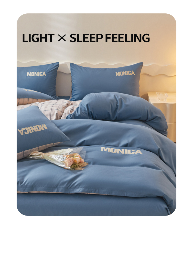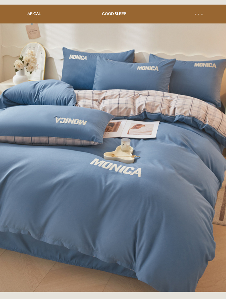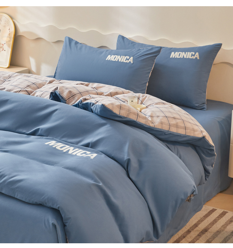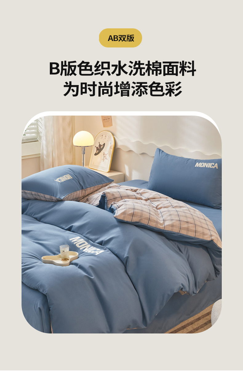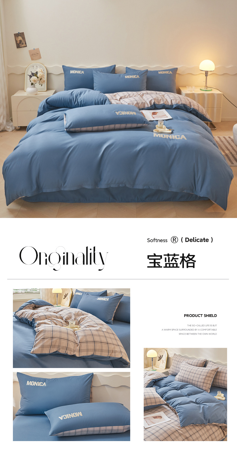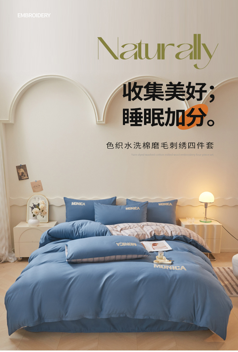 欣晴家纺 2023新品色织水洗棉磨毛刺绣四件套 宝蓝格