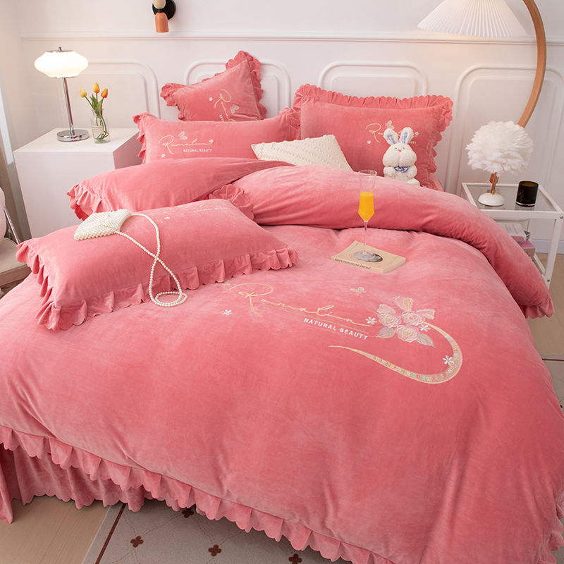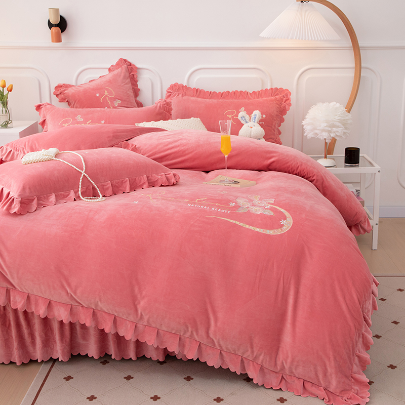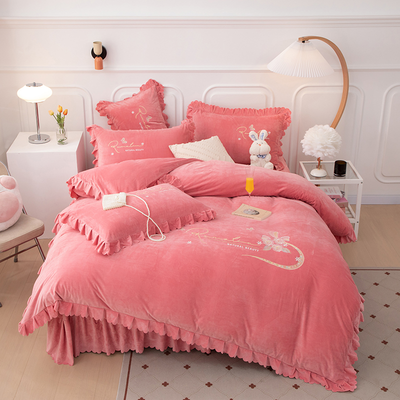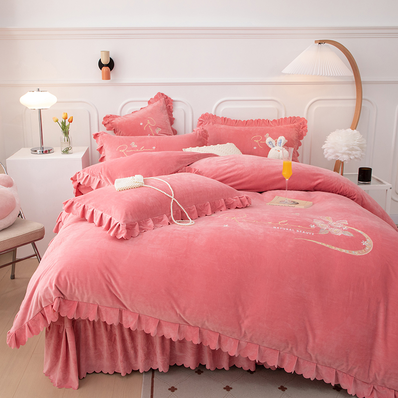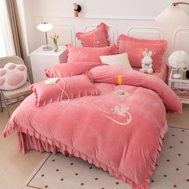 床品套件 > 优姿家纺 2024新品8.5斤德芙绒韩版床裙绣花保暖四件套 时尚玫瑰少女粉
