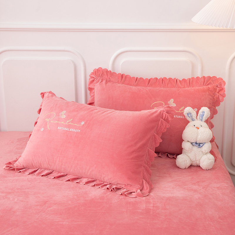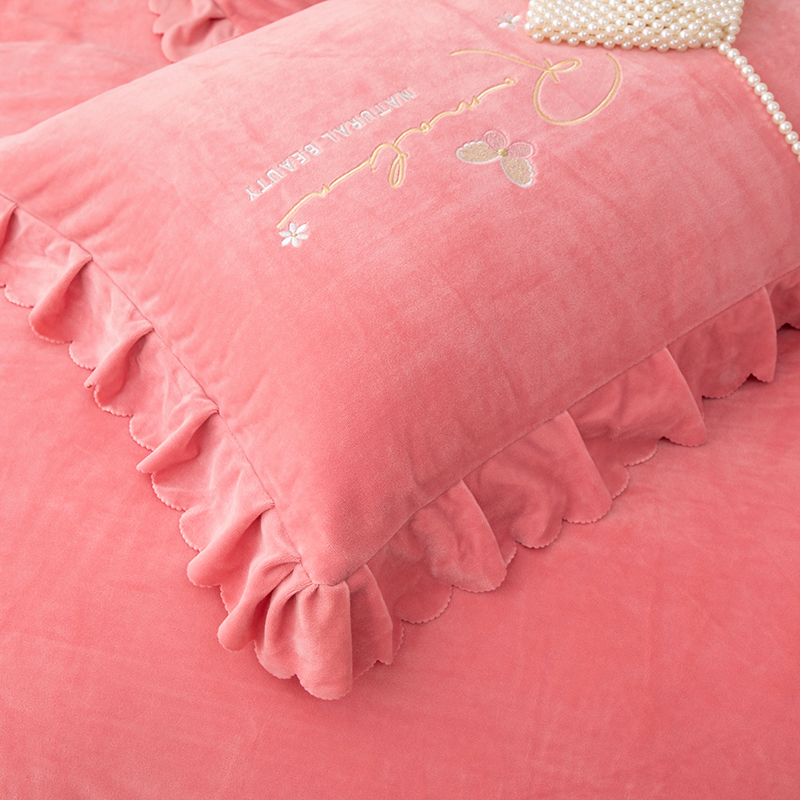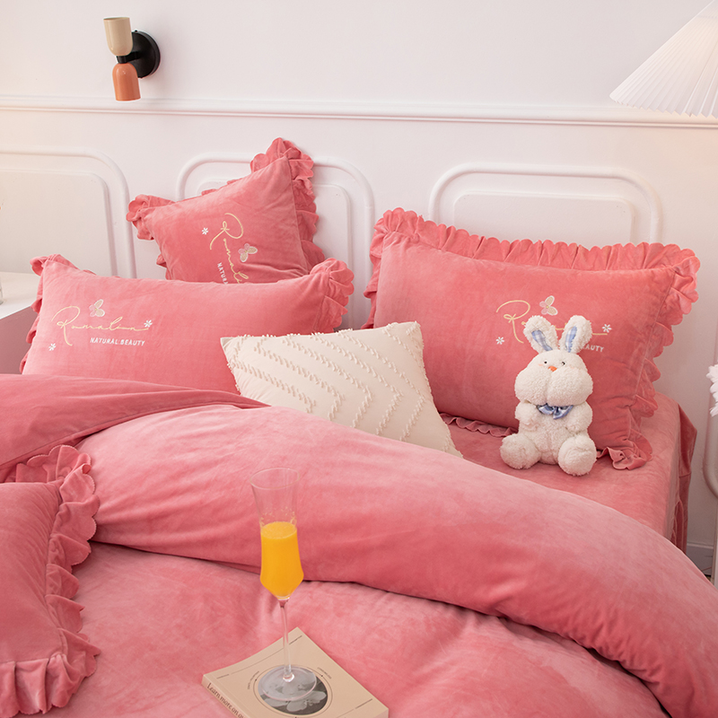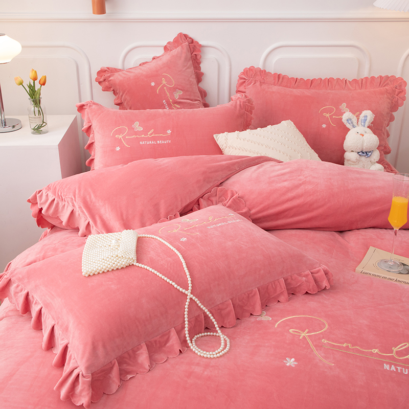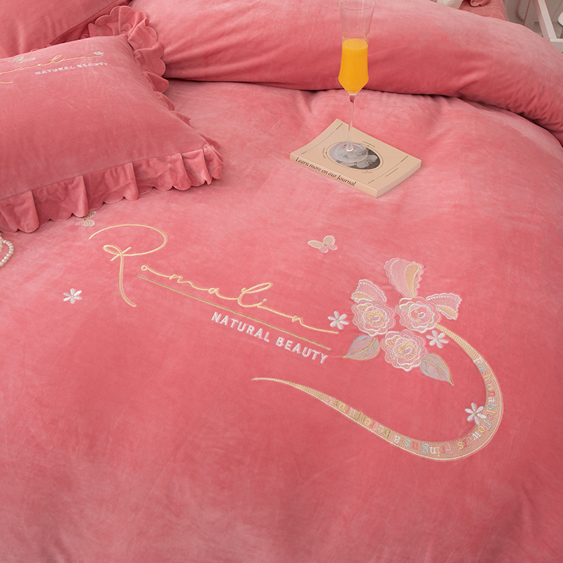 床品套件 > 优姿家纺 2024新品8.5斤德芙绒韩版床裙绣花保暖四件套 时尚玫瑰少女粉