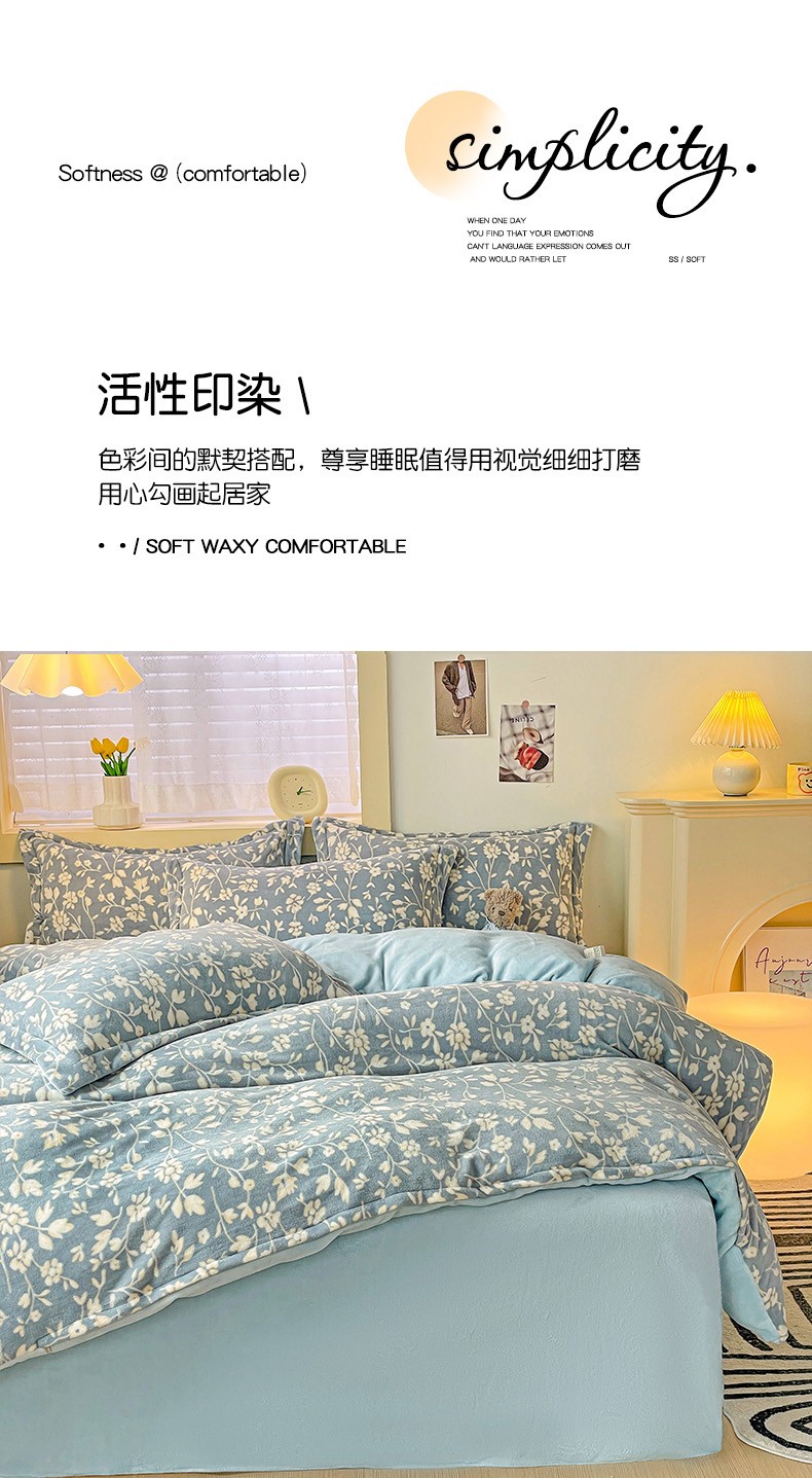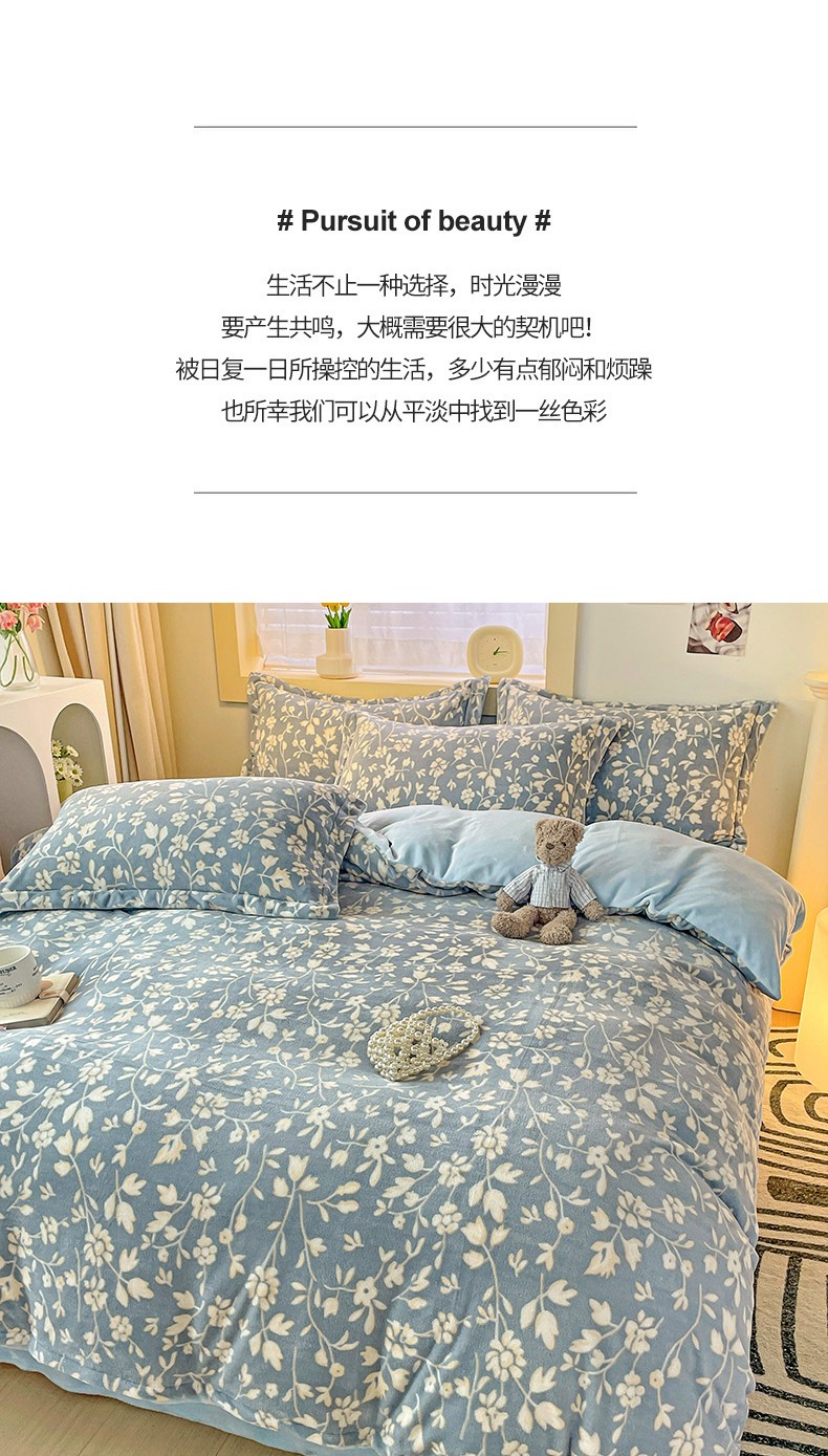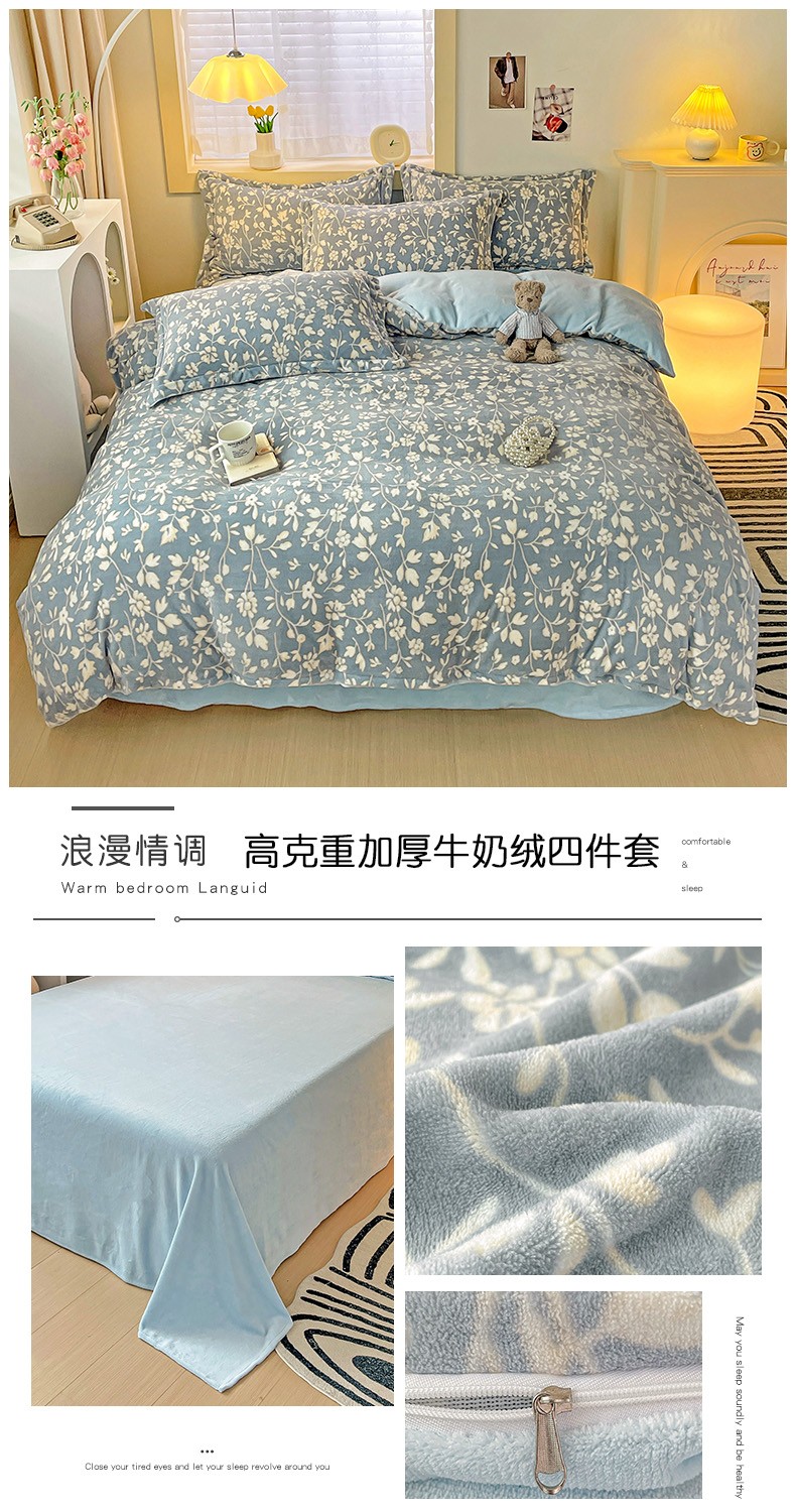 当前位置: 91家纺网 > 商品网购 > 床品套件 > 四件套 > 牛奶绒四件套 > 畅畅家纺 2023新款活性印花小清新AB版加厚高克重法莱绒牛奶绒四件套 浪漫情调