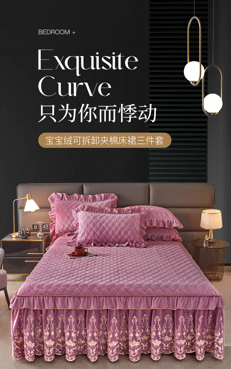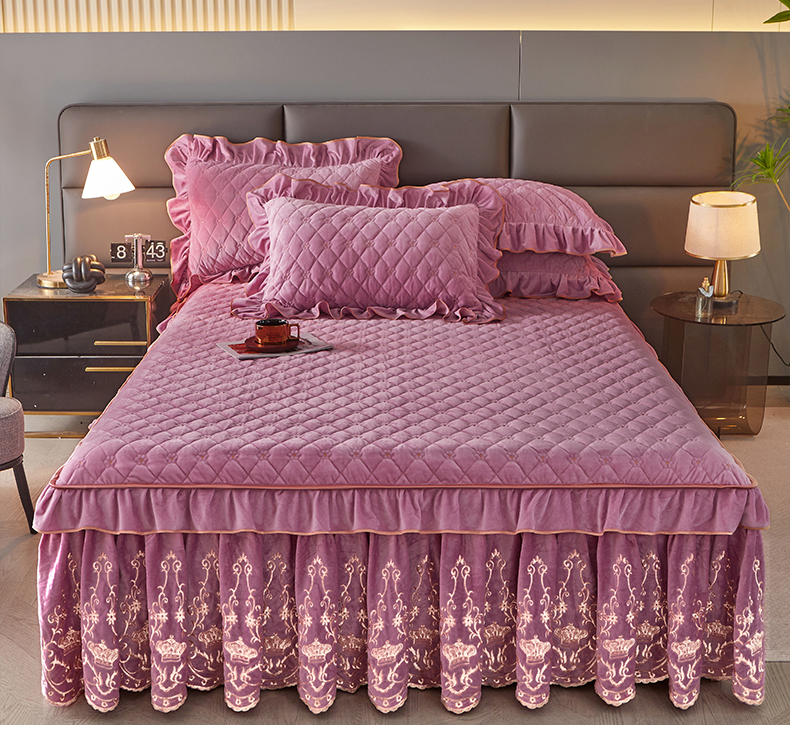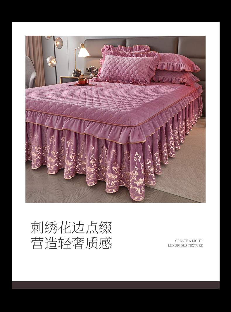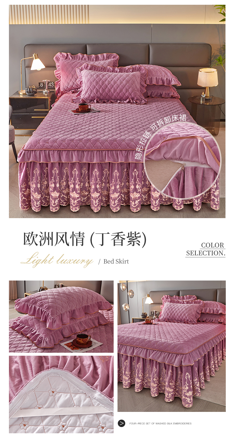当前位置: 91家纺网 > 商品网购 > 床品套件 > 三件套 > 罗艺轩 2024新款欧洲风情宝宝绒可拆卸夹棉床裙三件套 丁香紫