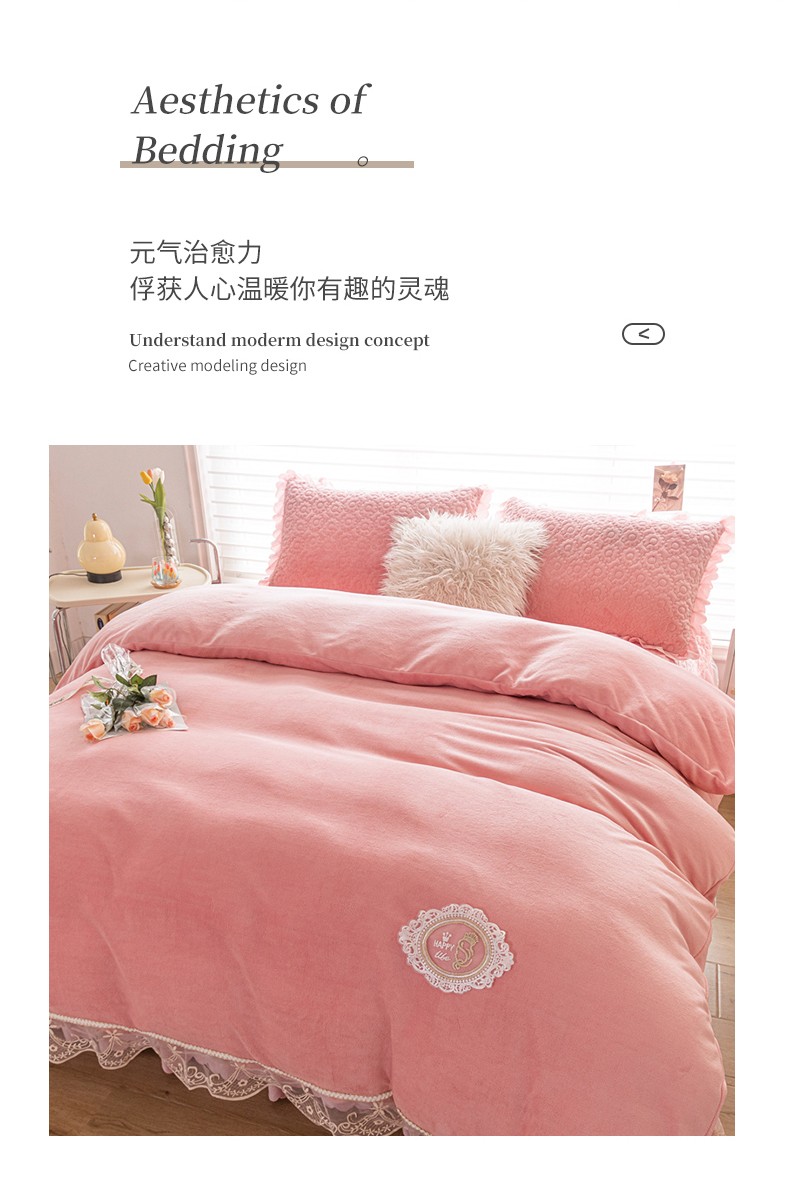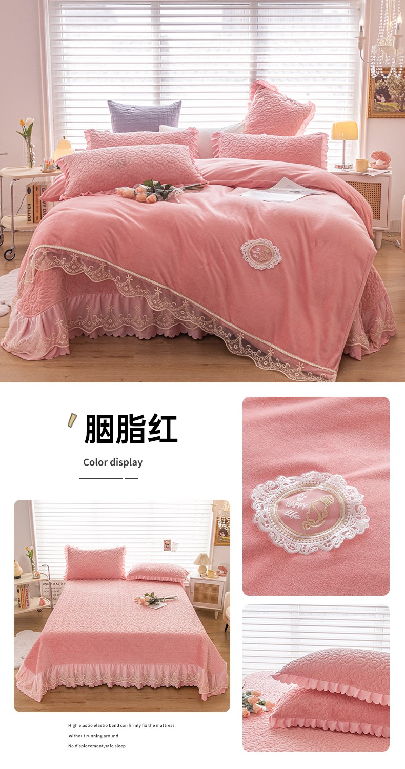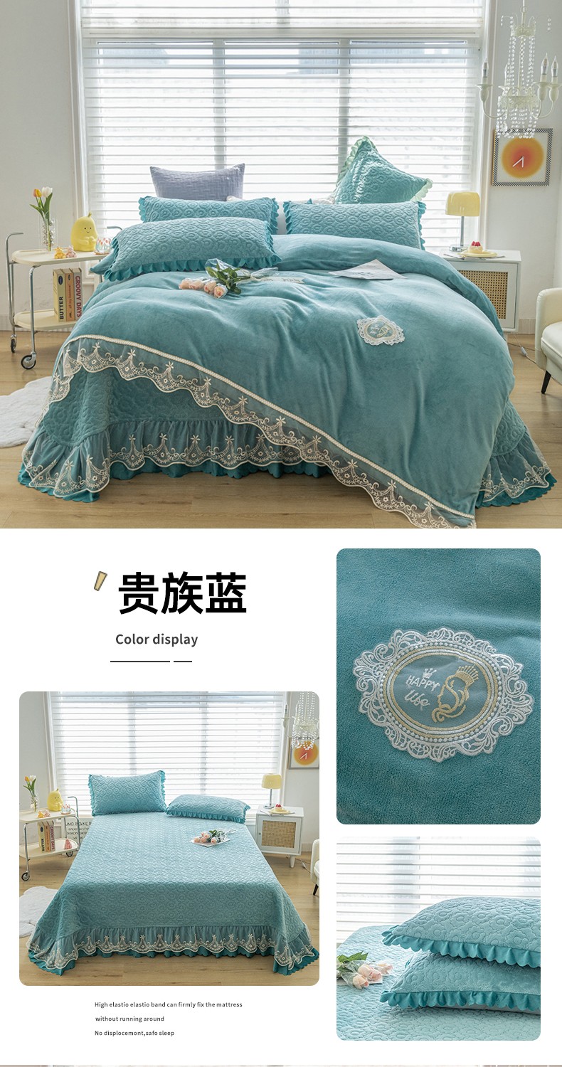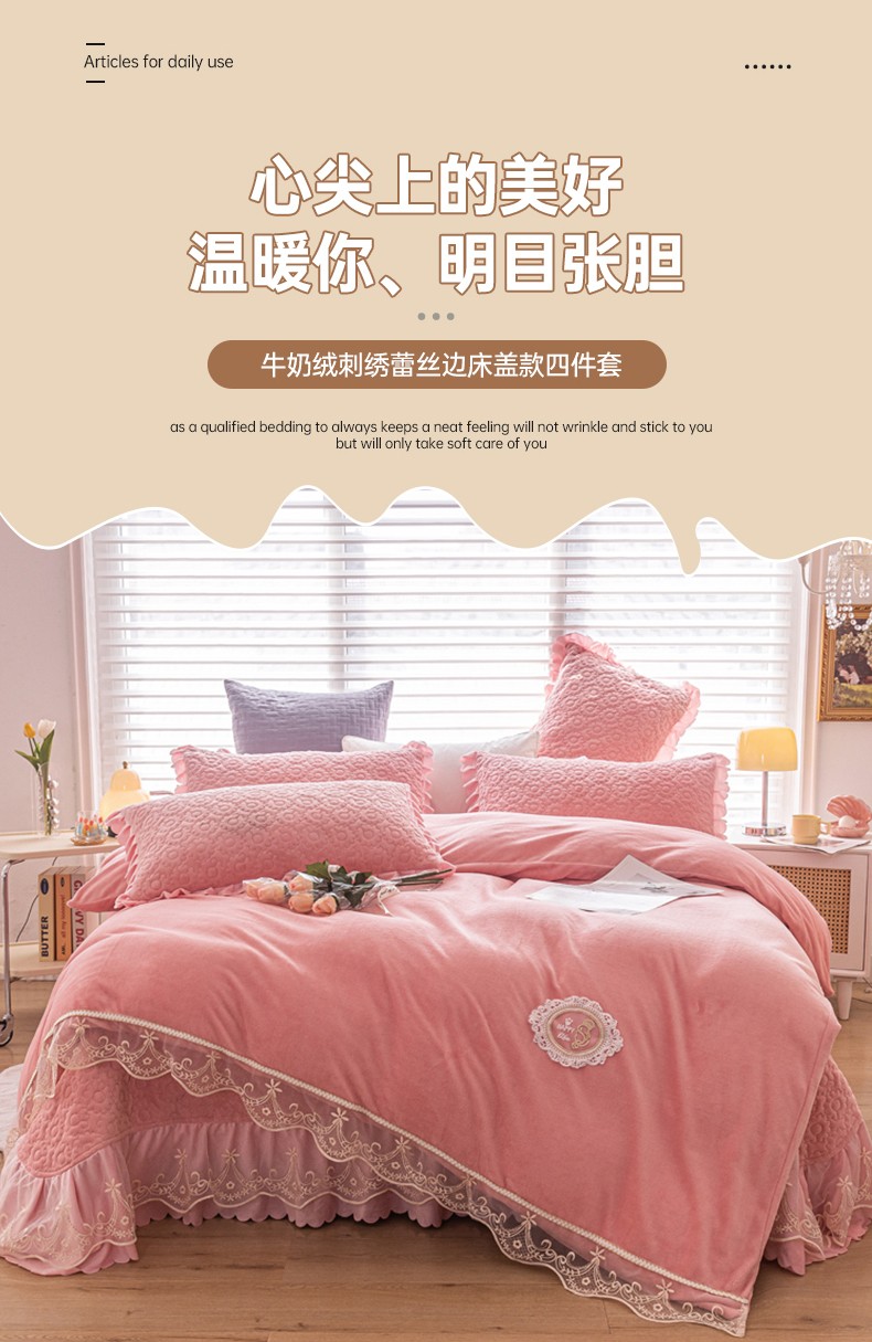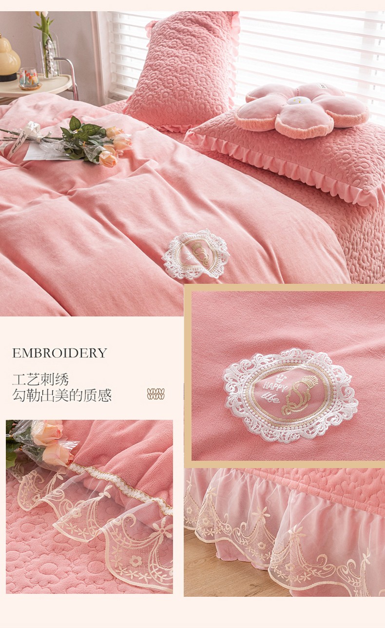 商品名称:(总)乐嘉盈 2025新款纯色刺绣蕾丝边牛奶绒床盖款四件套