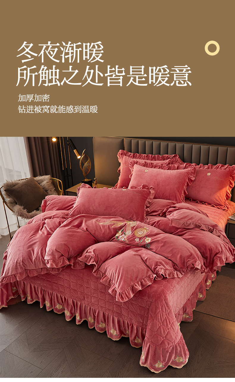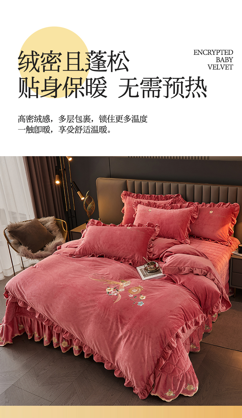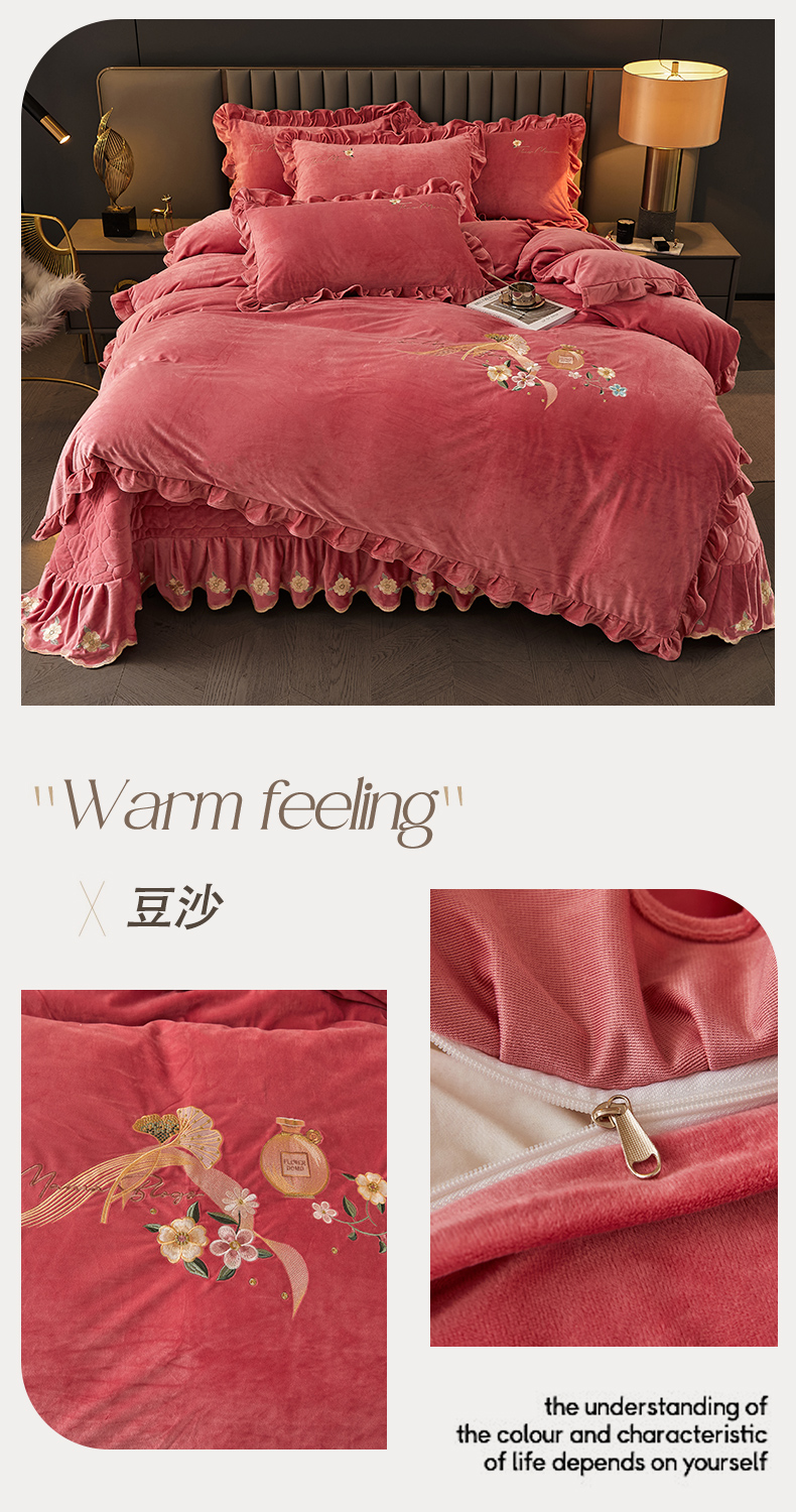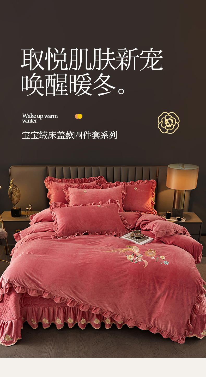 当前位置: 91家纺网 > 商品网购 > 床品套件 > 四件套 > 宝宝绒四件套 > 恒爱家纺 2023新款温暖舒适加密宝宝绒床盖四件套-邂逅系列 豆沙