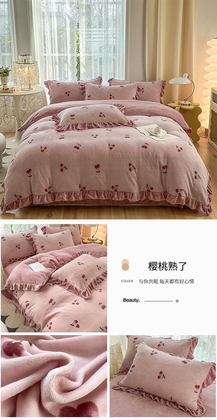 当前位置: 91家纺网 > 商品网购 > 床品套件 > 四件套 > 牛奶绒四件套 > 小主驾到 2023新款高克重韩版牛奶绒花边四件套樱桃熟了