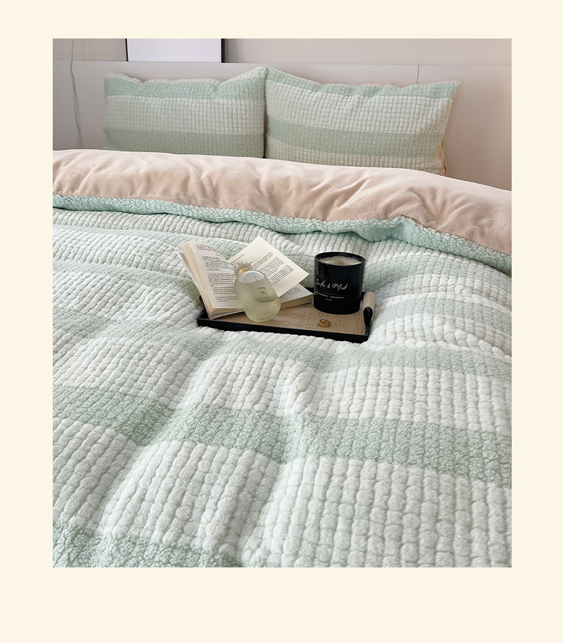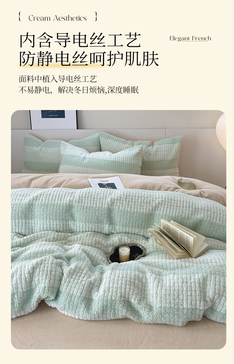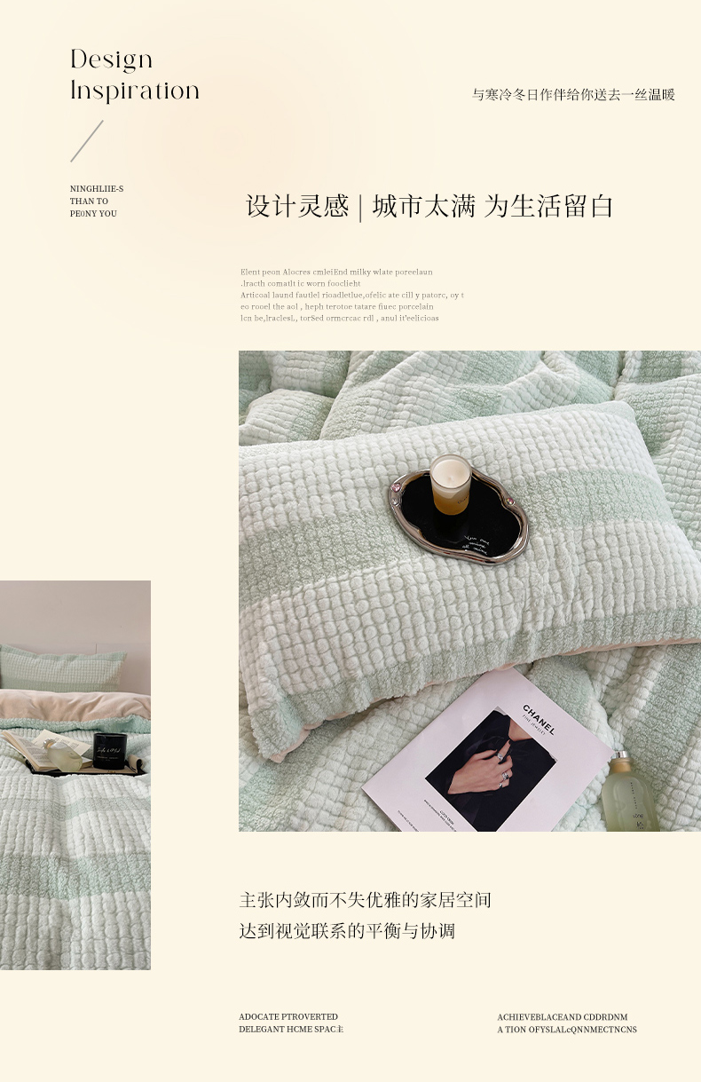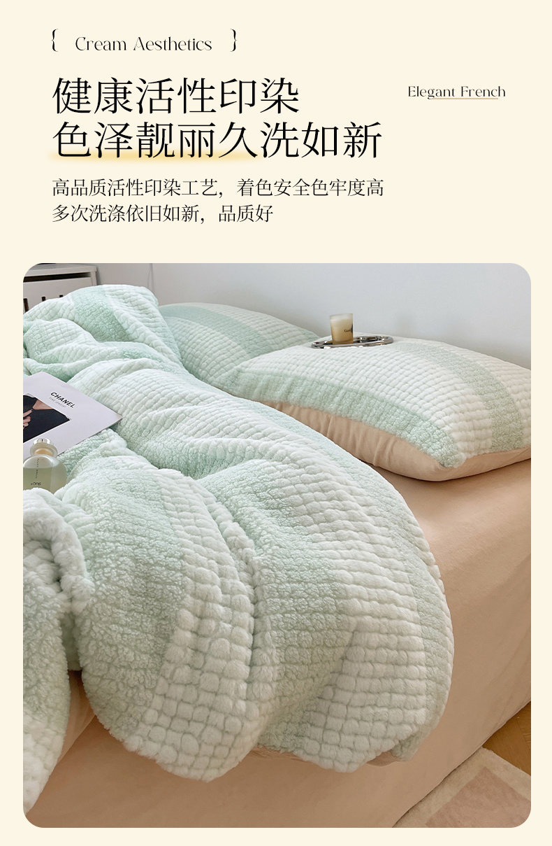 三朵家纺 2023新款加厚保暖雕花兔毛绒四件套 条纹-美丽蓝卡