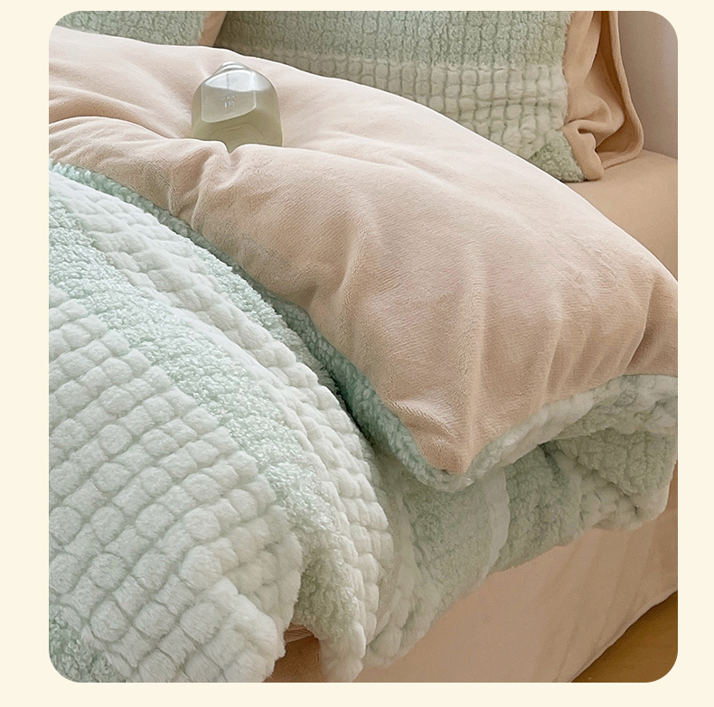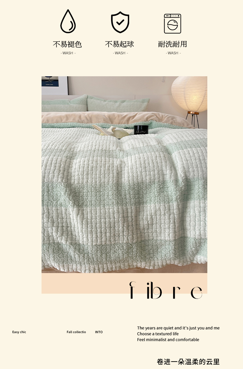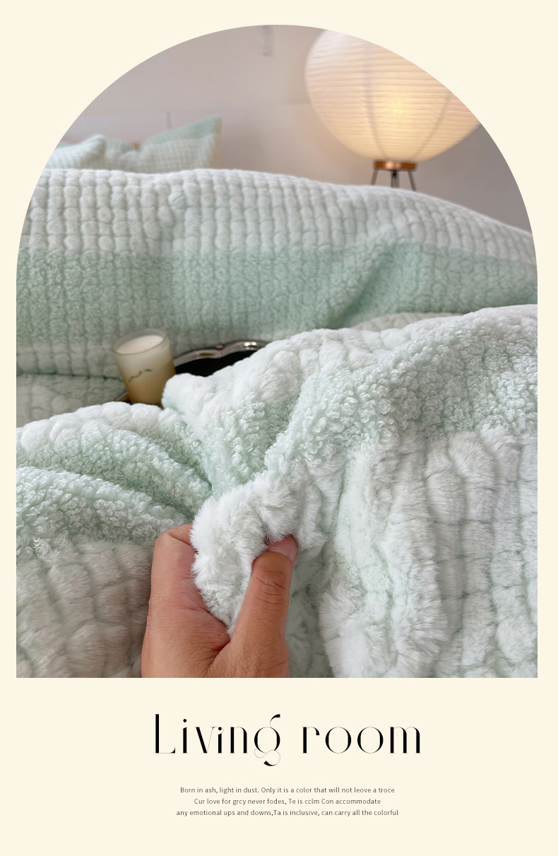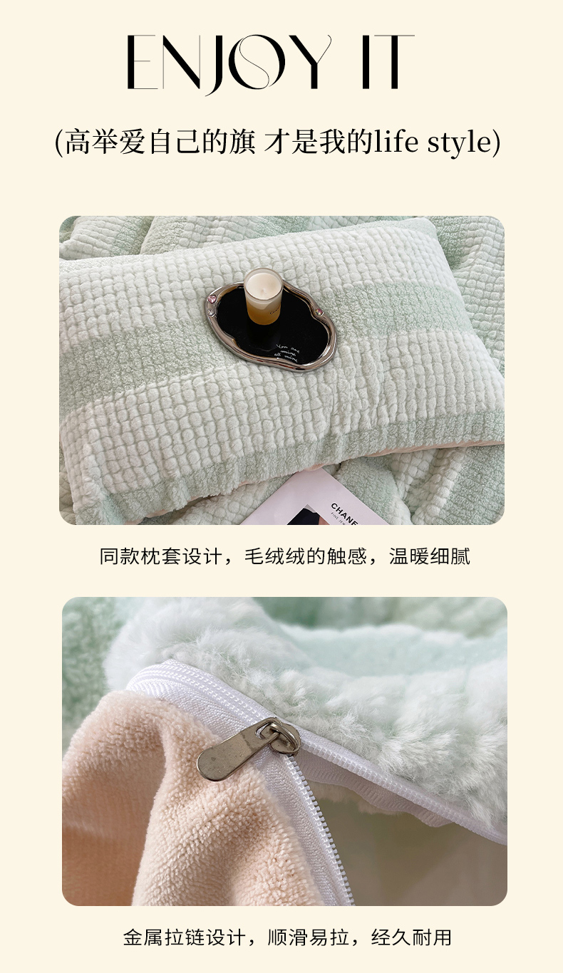 三朵家纺 2023新款加厚保暖雕花兔毛绒四件套 条纹-美丽蓝卡