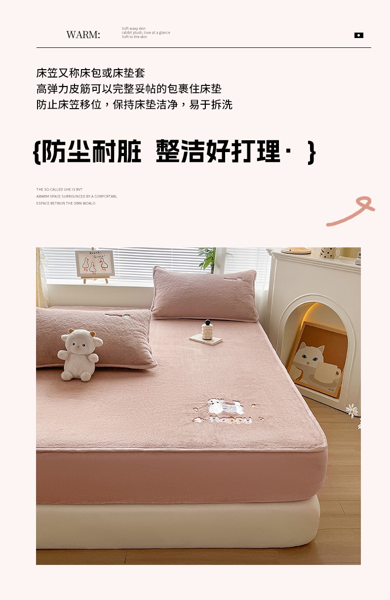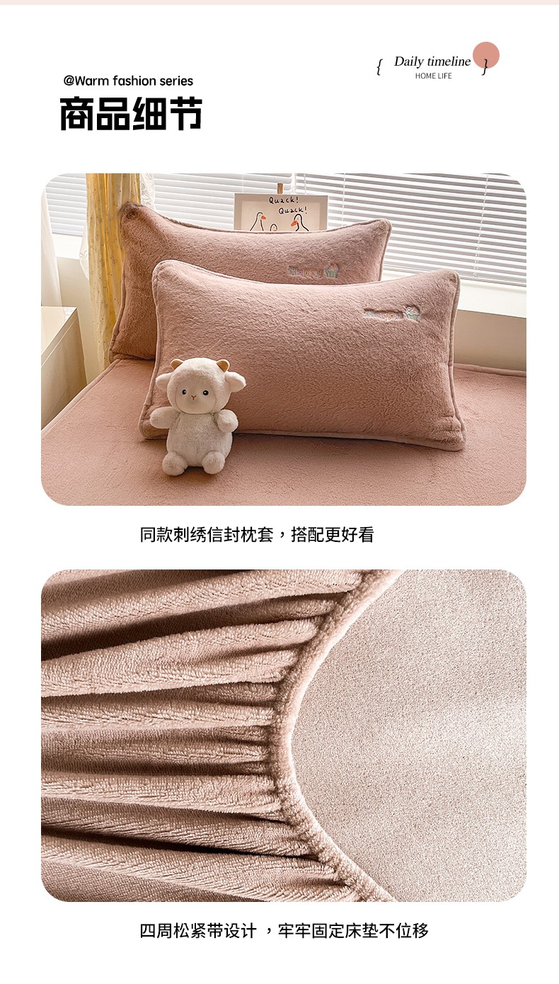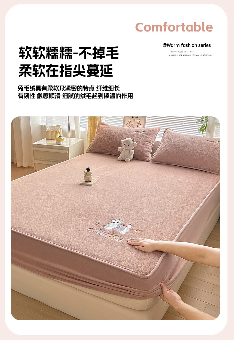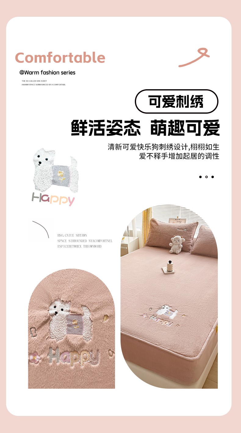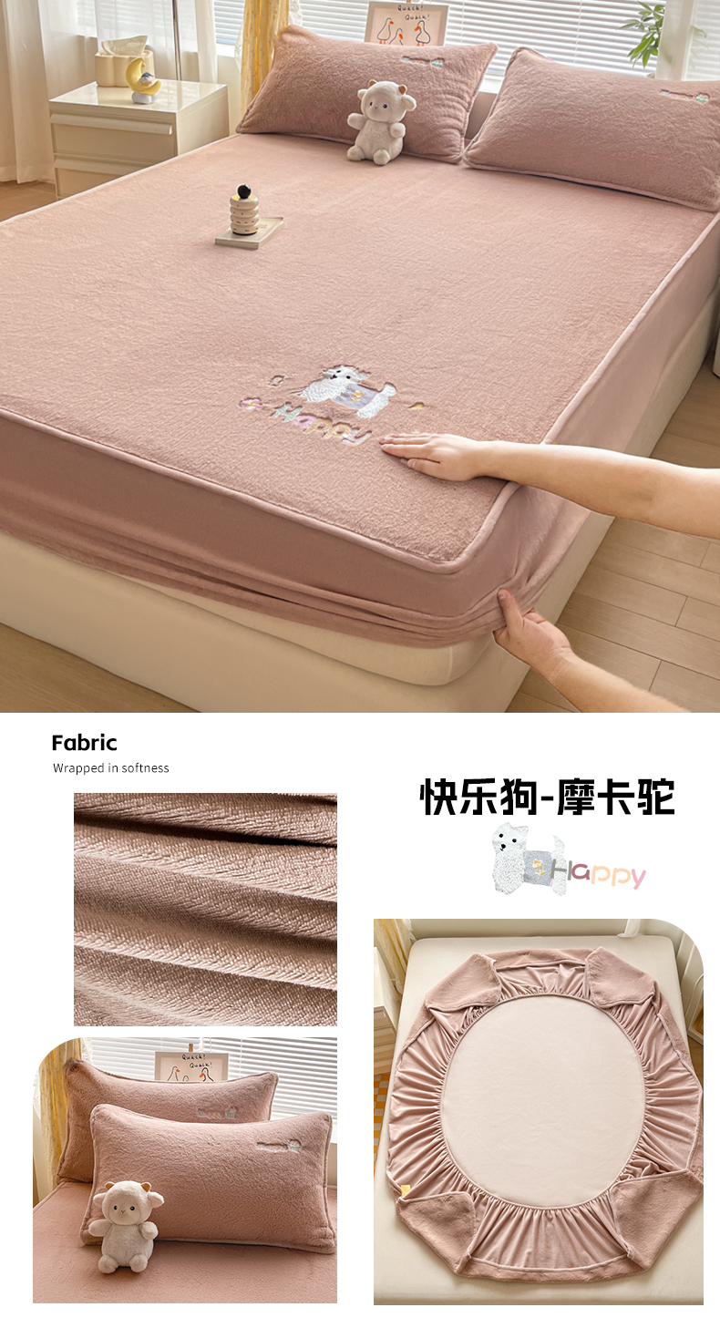 商品名称:鑫钰 2023新款高克重A类兔毛绒刺绣床笠 快乐狗-摩卡驼