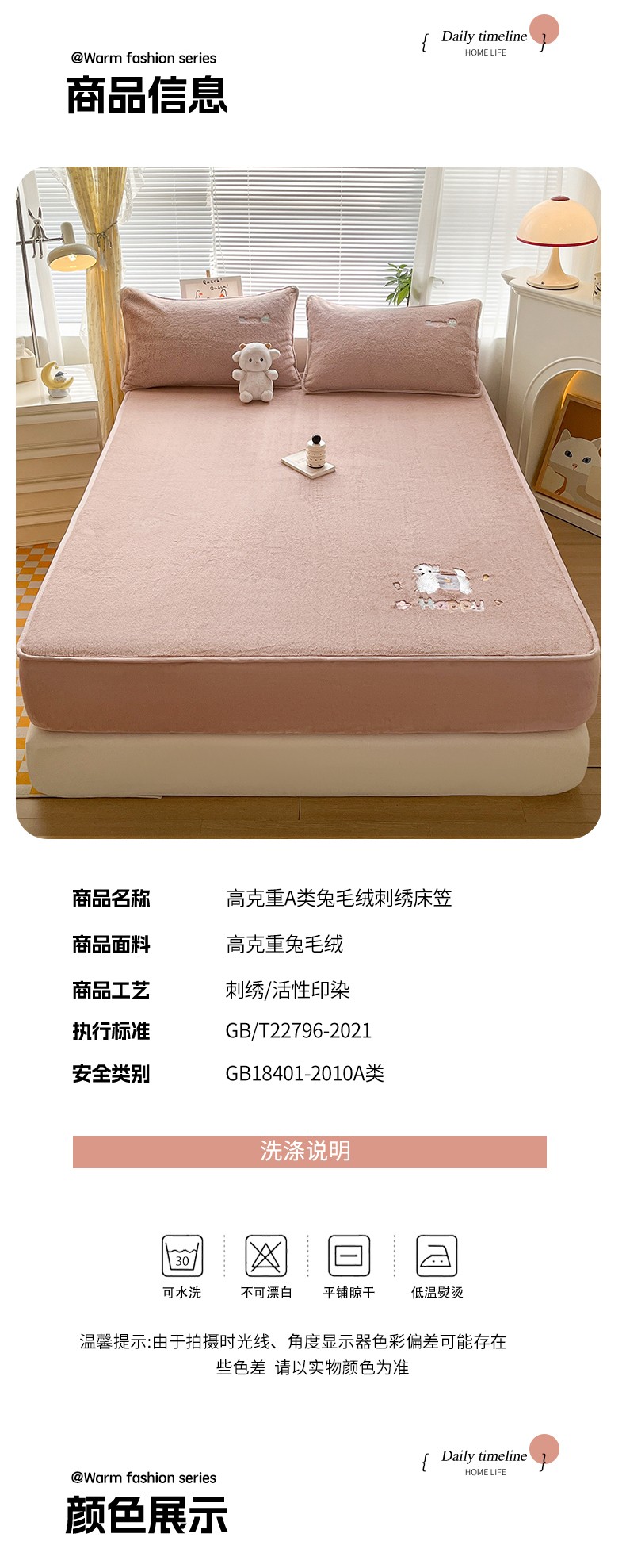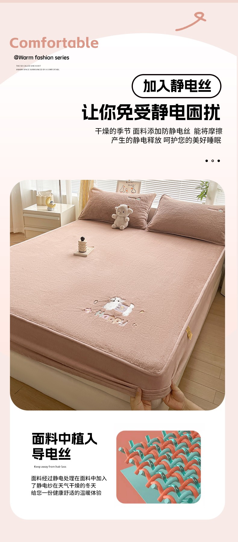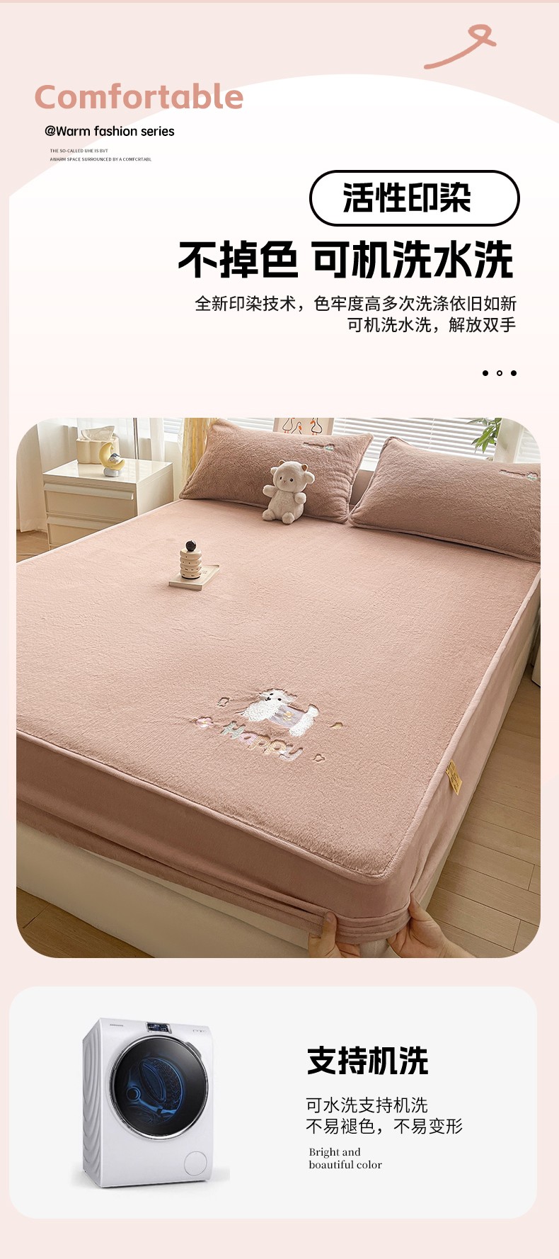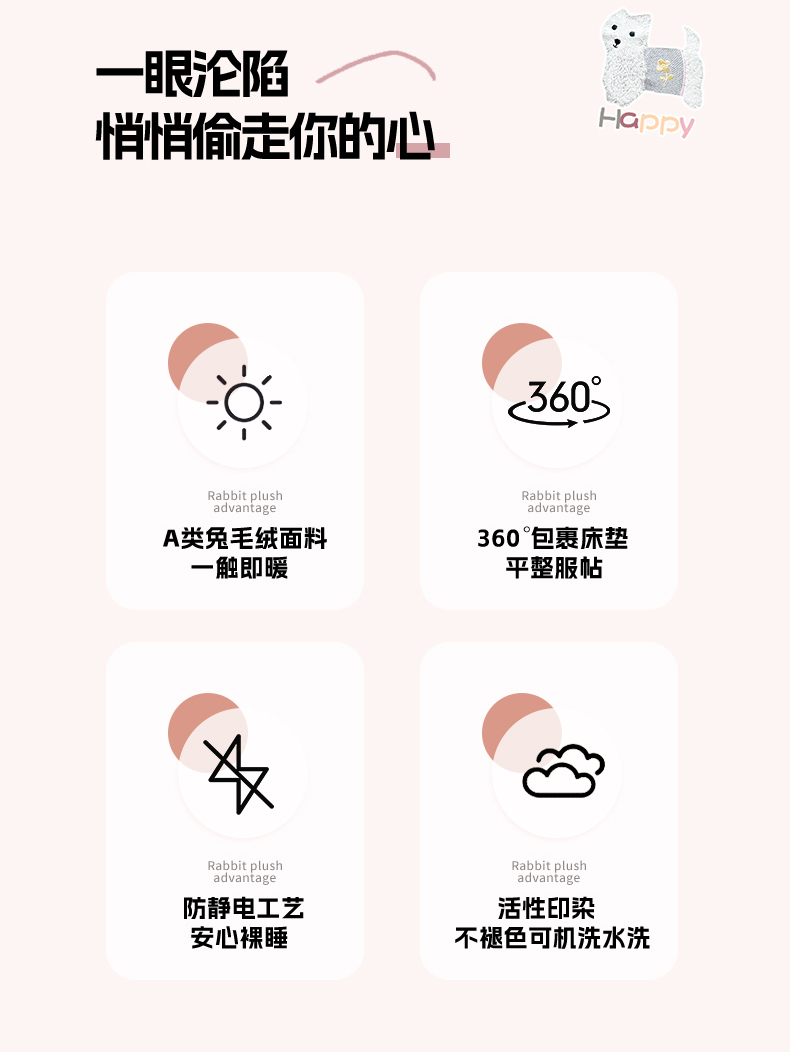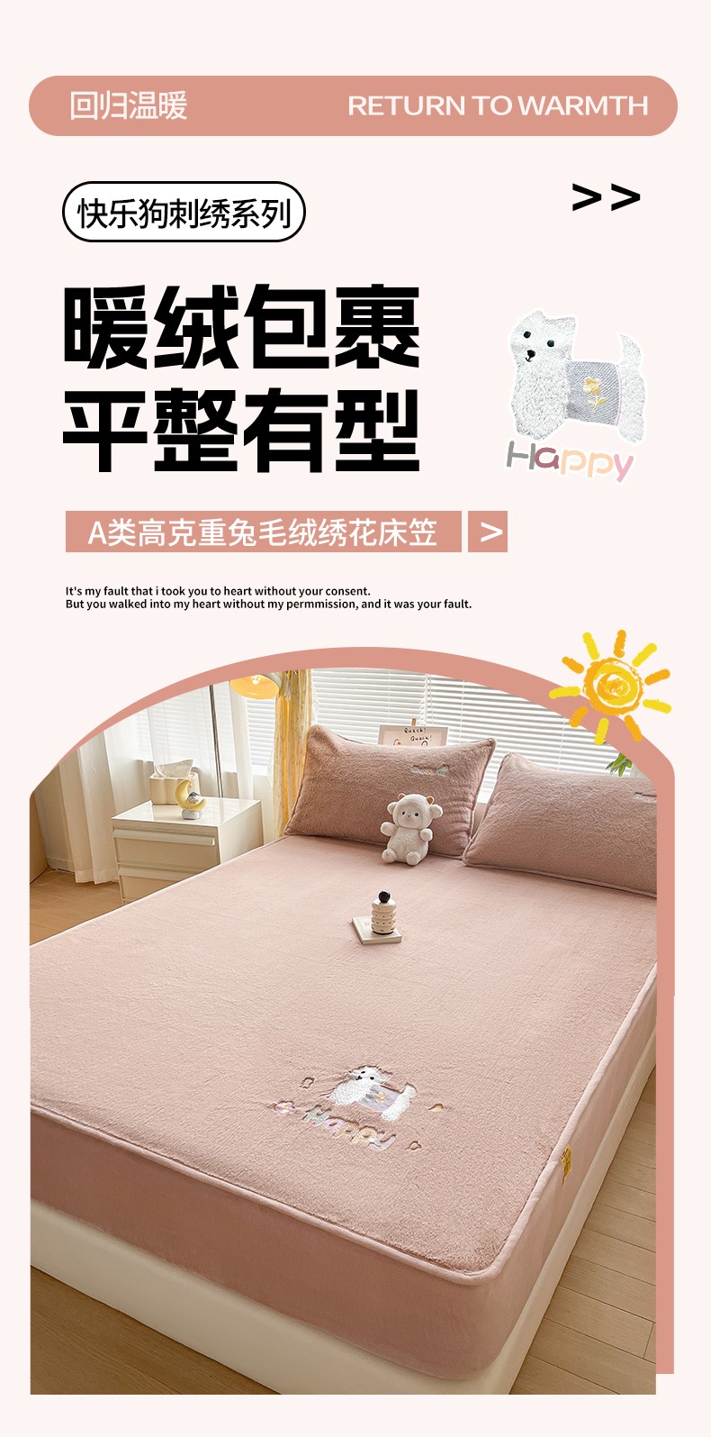 商品名称:鑫钰 2023新款高克重A类兔毛绒刺绣床笠 快乐狗-摩卡驼