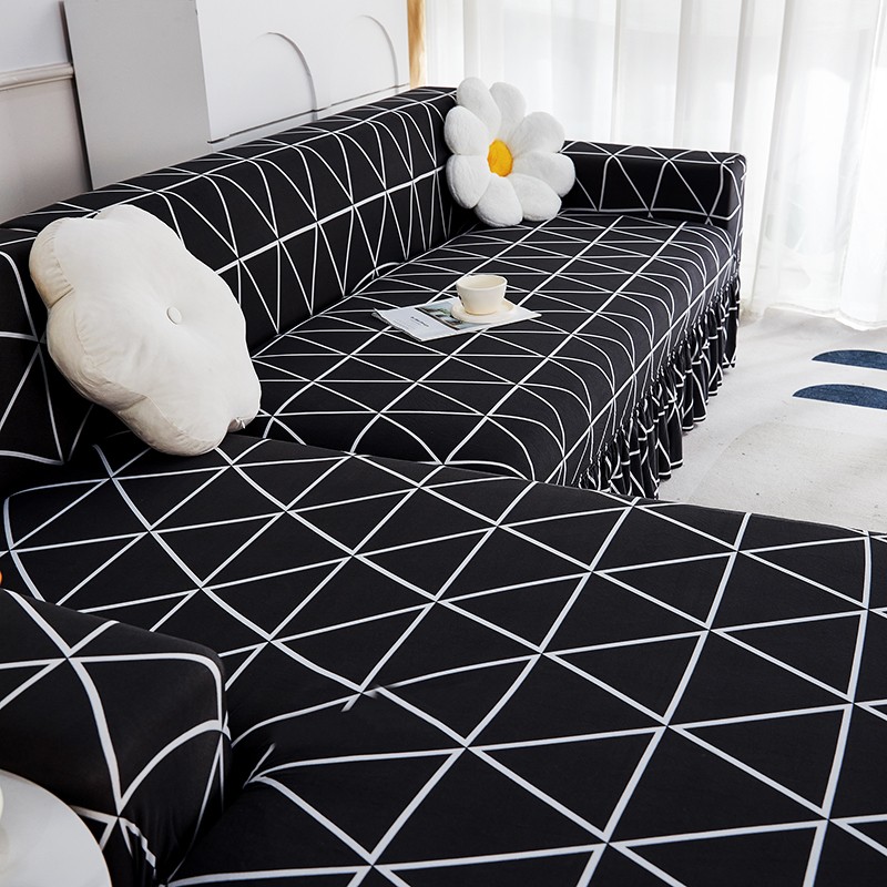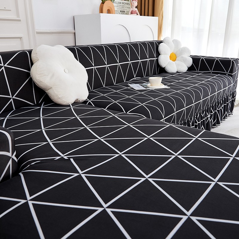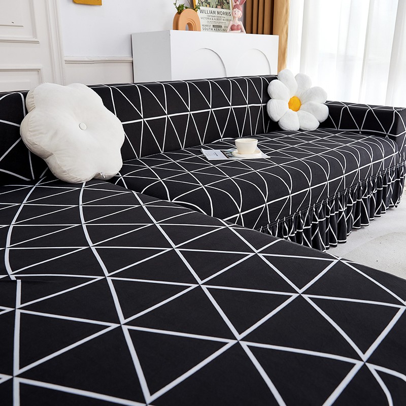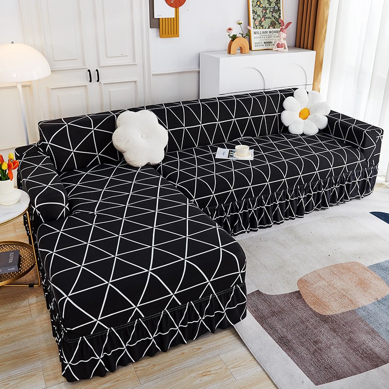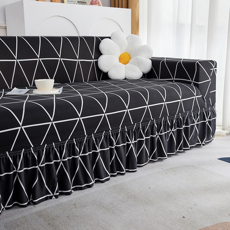 丝绮鹿 2023新款牛奶丝沙发套贵妃图(裙边款) 黑色线格