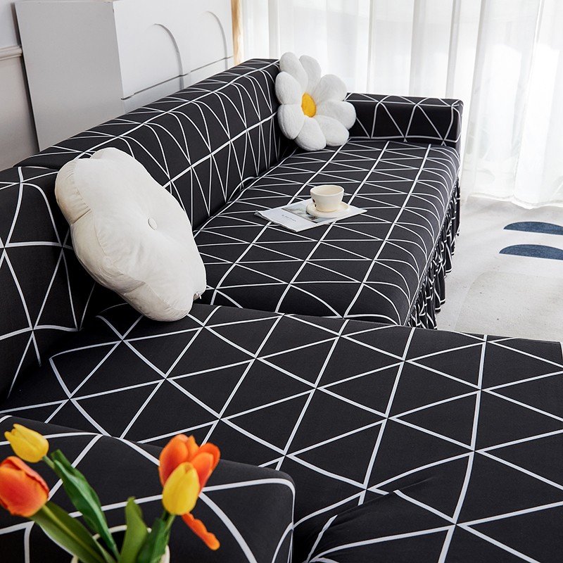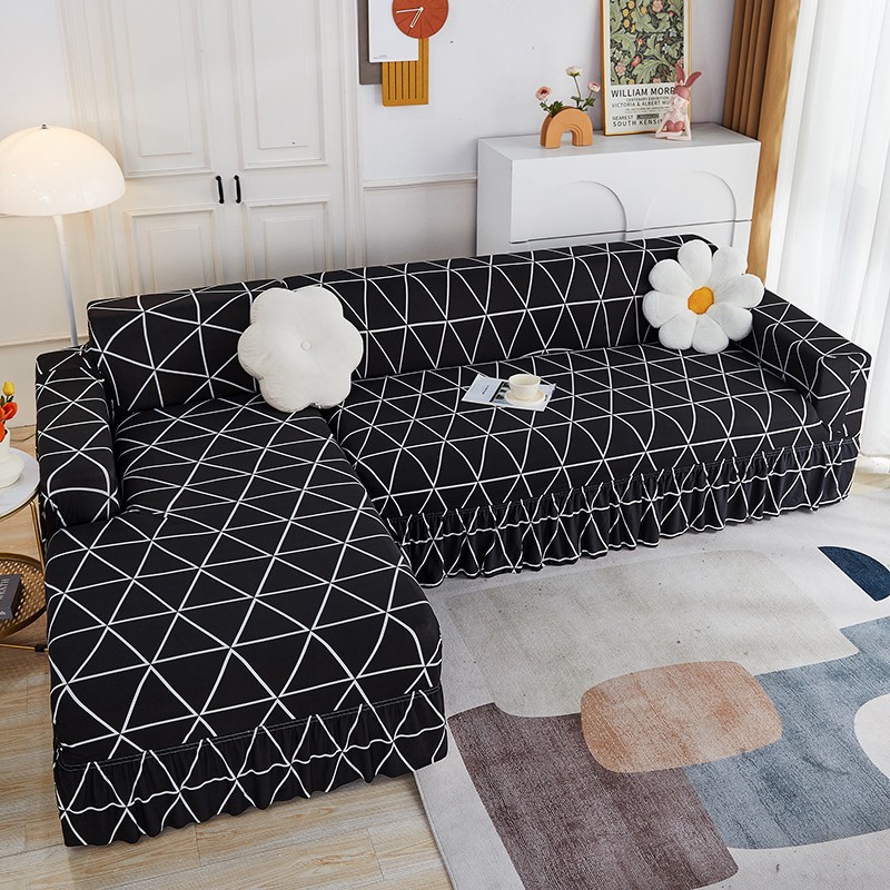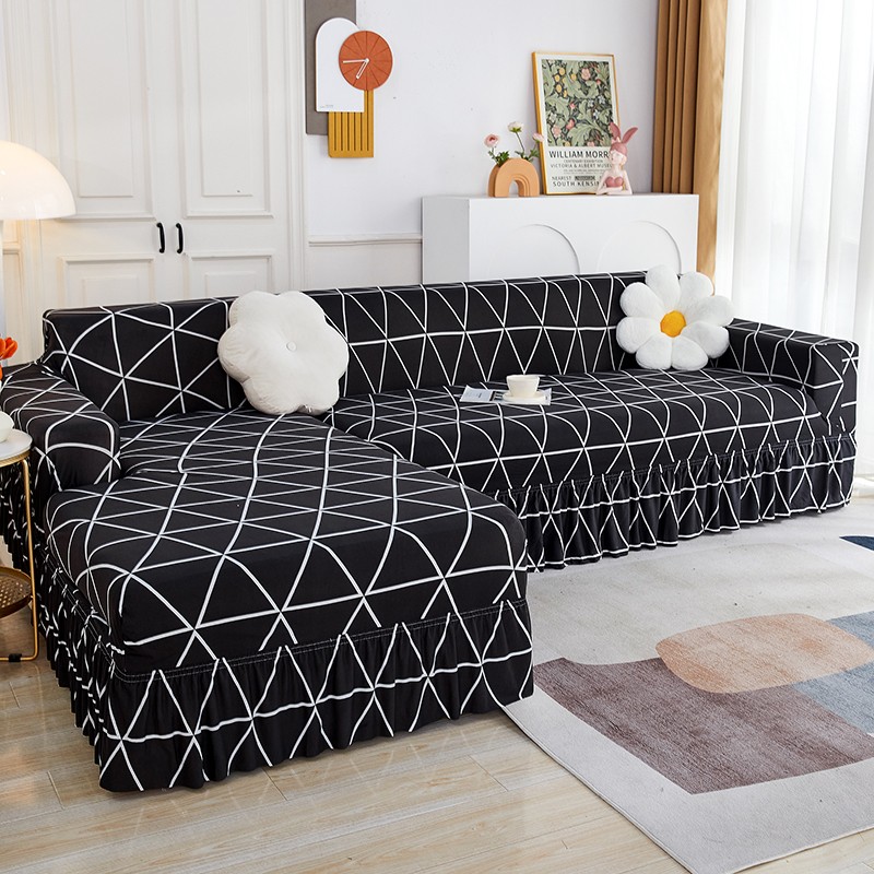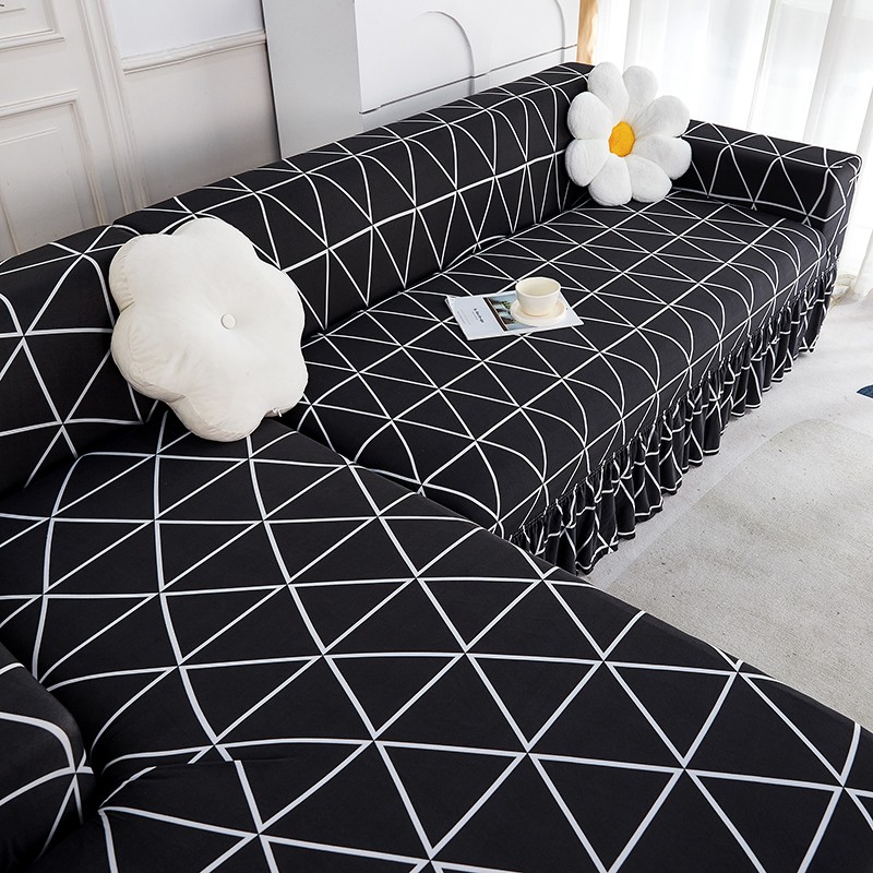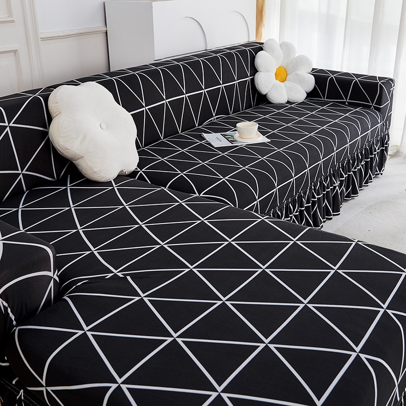 丝绮鹿 2023新款牛奶丝沙发套贵妃图(裙边款) 黑色线格