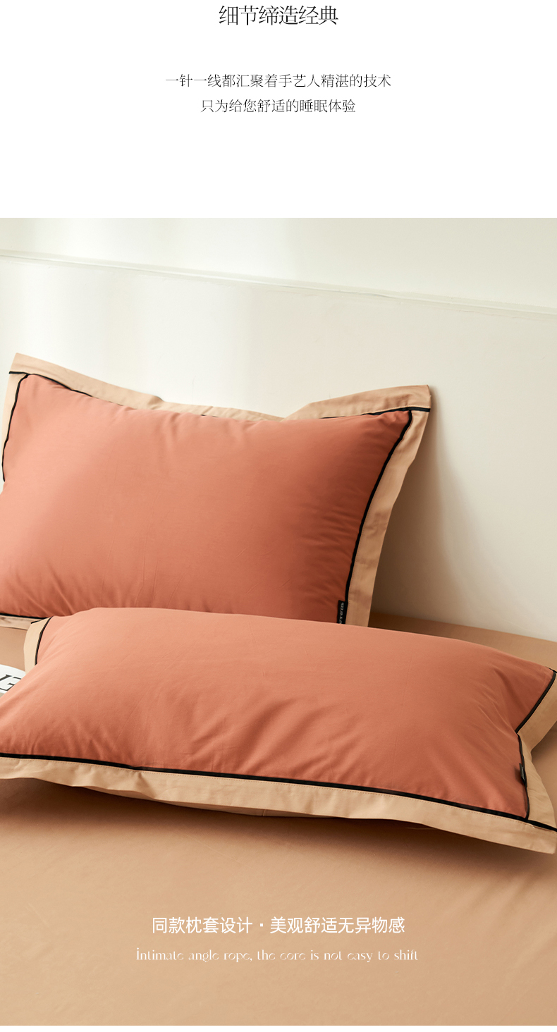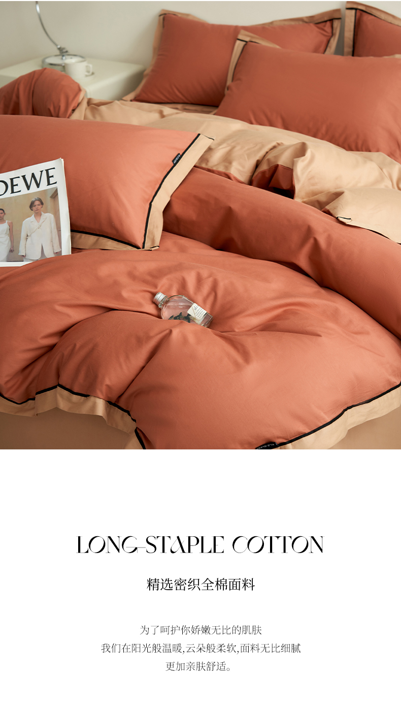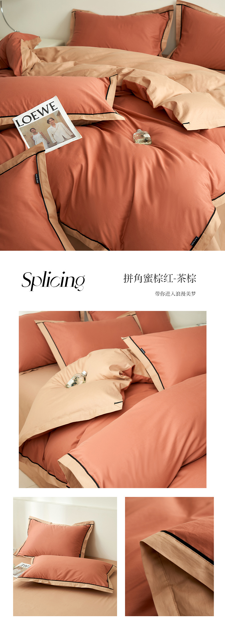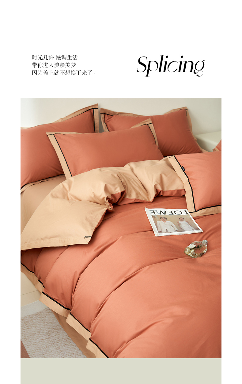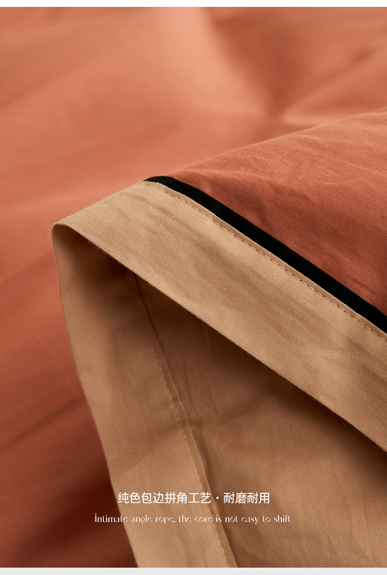 商品名称:小懒猪 2024新款全棉斜纹精梳棉双拼色拼角包边款四件套 拼角蜜棕红-茶棕