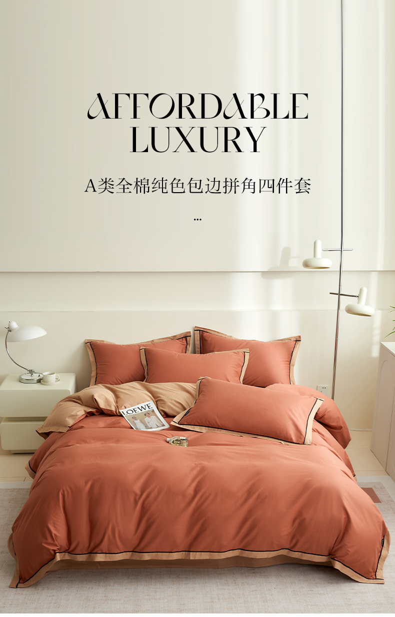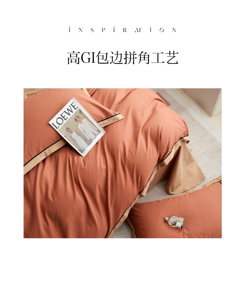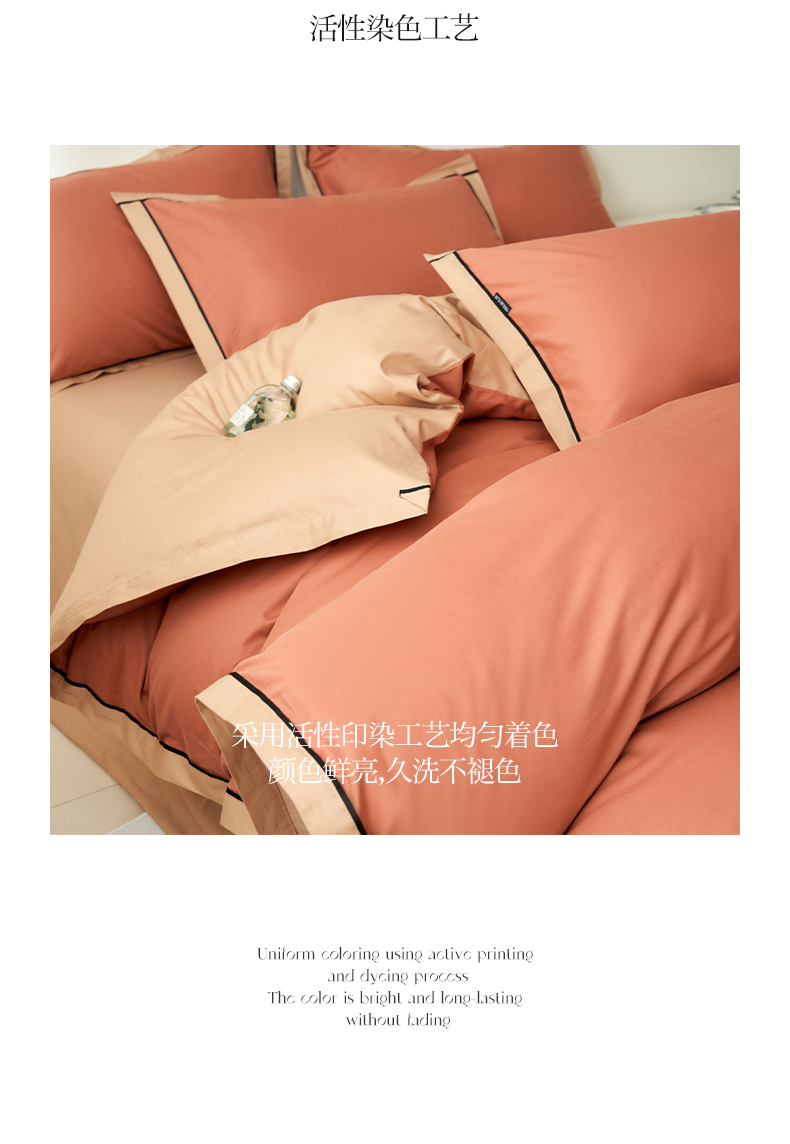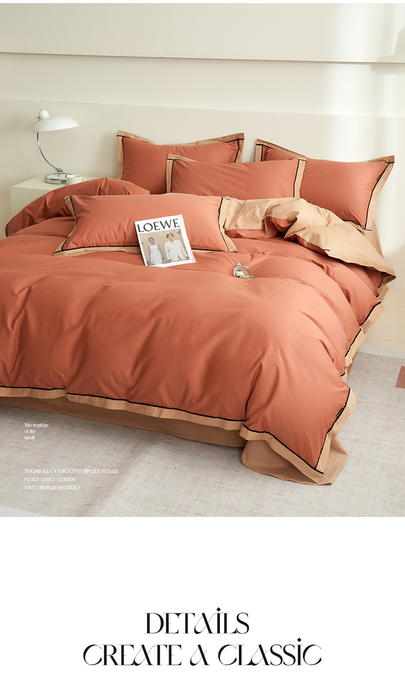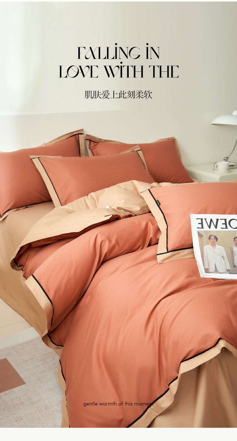 商品名称:小懒猪 2024新款全棉斜纹精梳棉双拼色拼角包边款四件套 拼角蜜棕红-茶棕