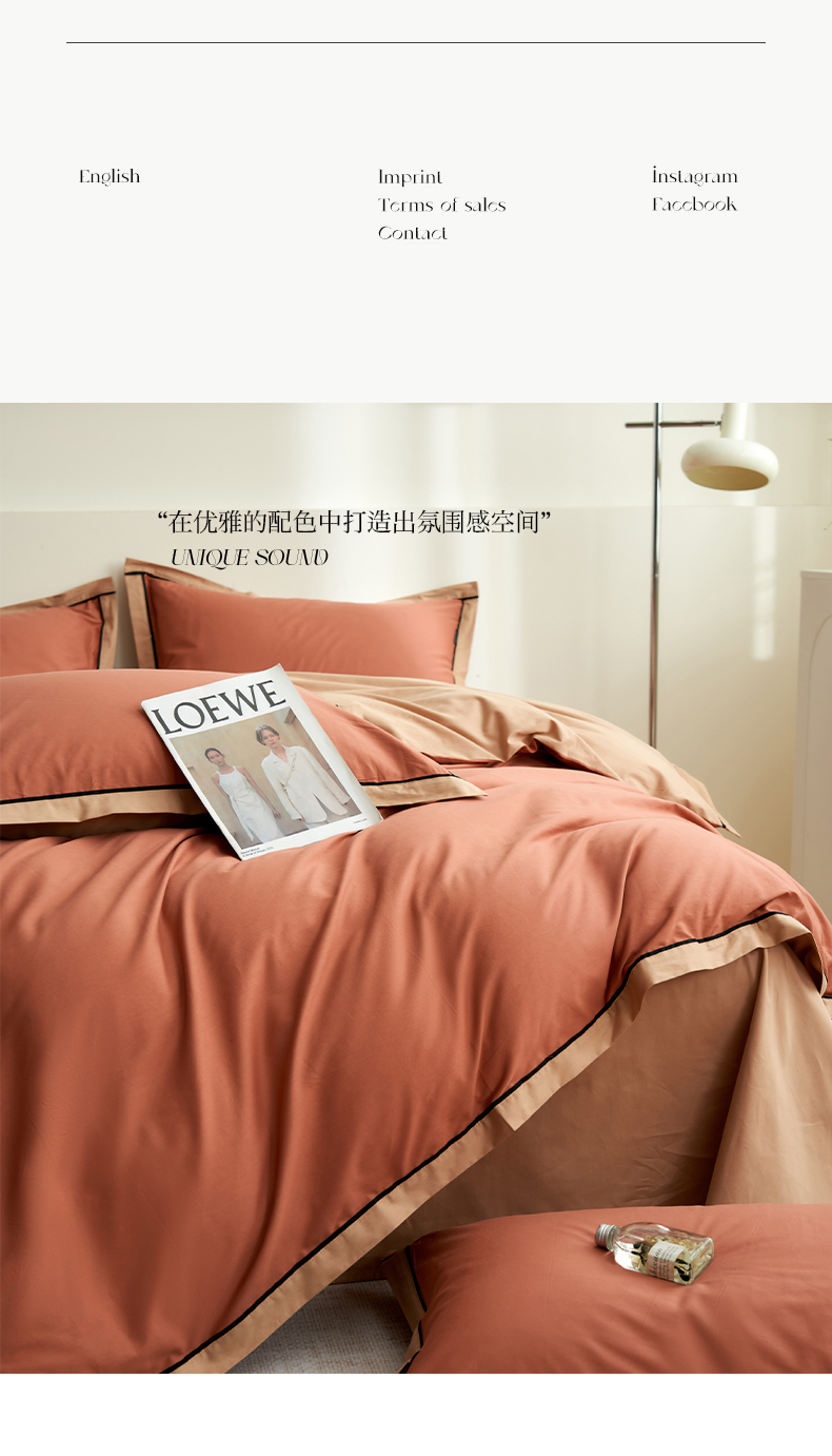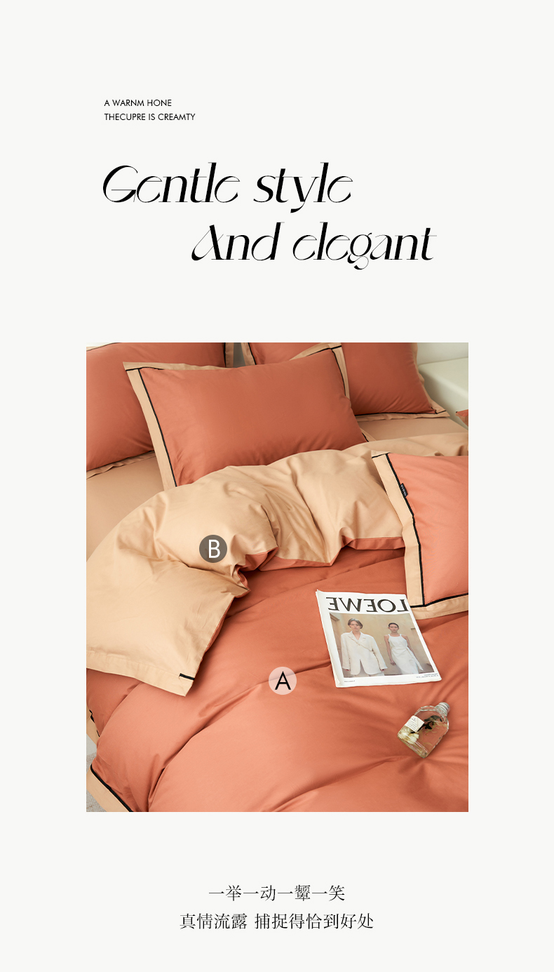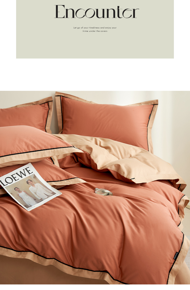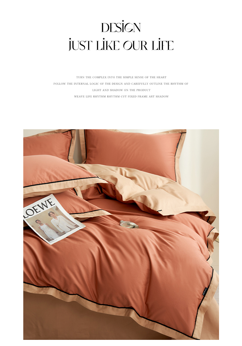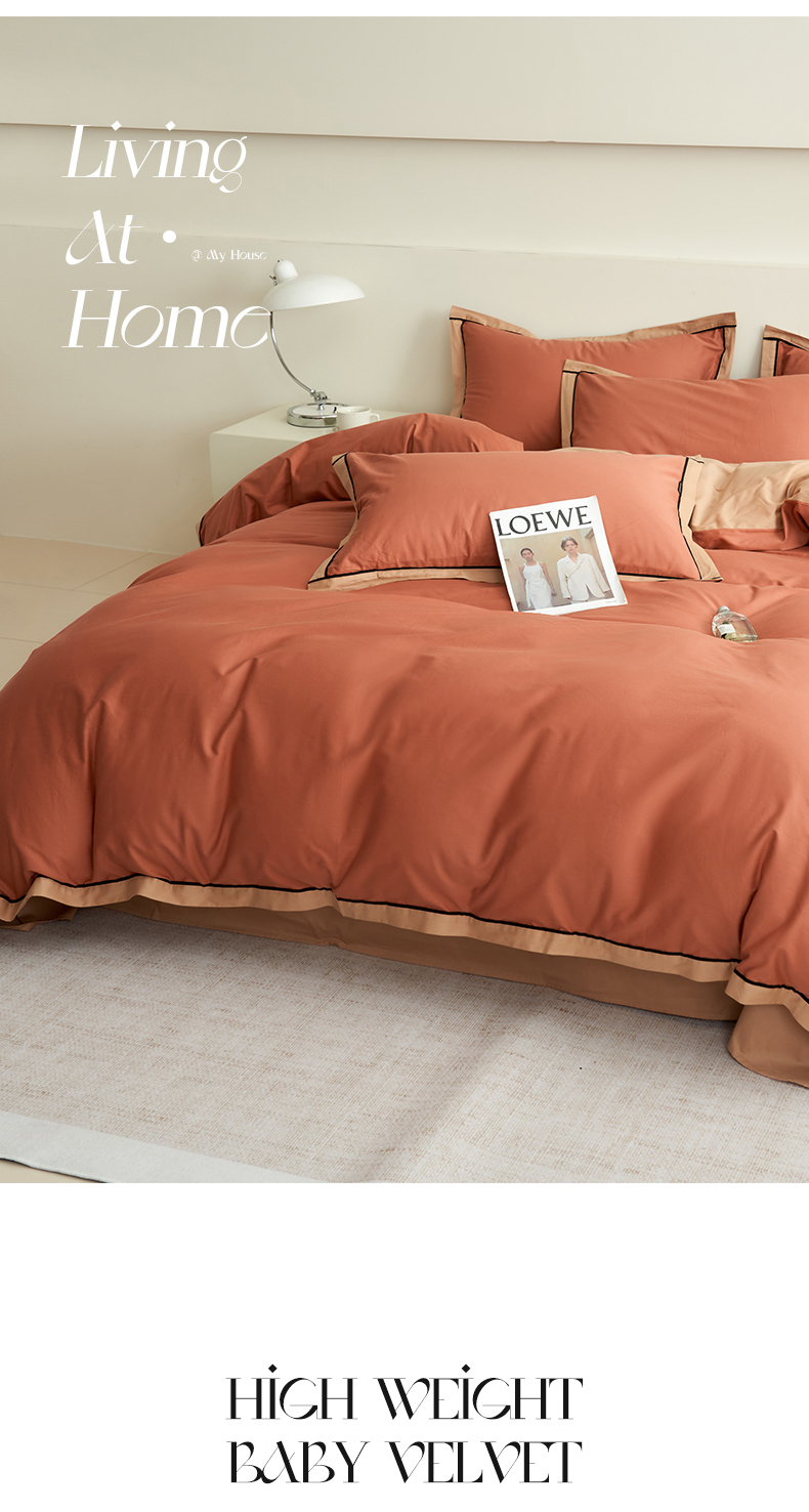 商品名称:小懒猪 2024新款全棉斜纹精梳棉双拼色拼角包边款四件套 拼角蜜棕红-茶棕